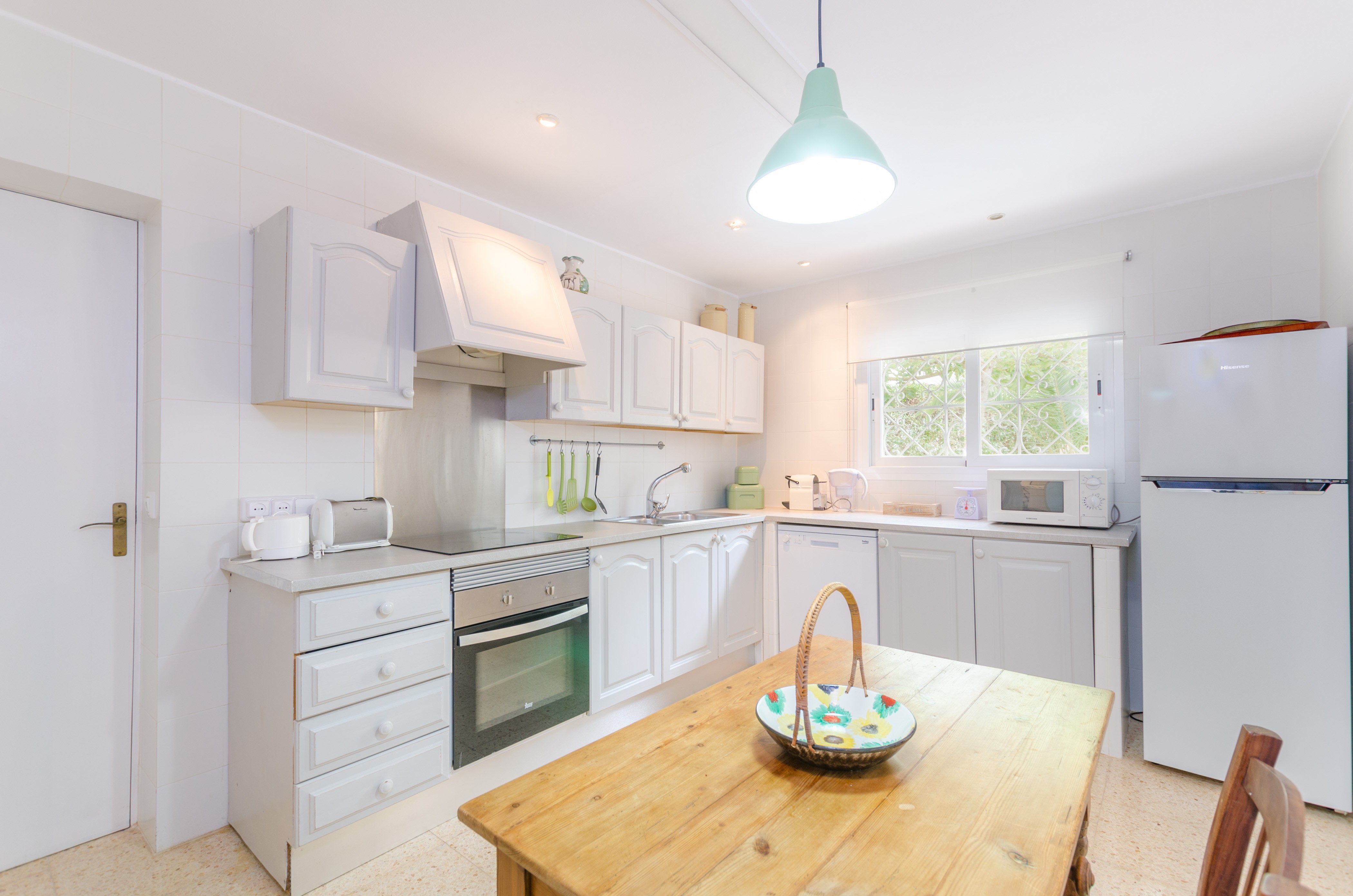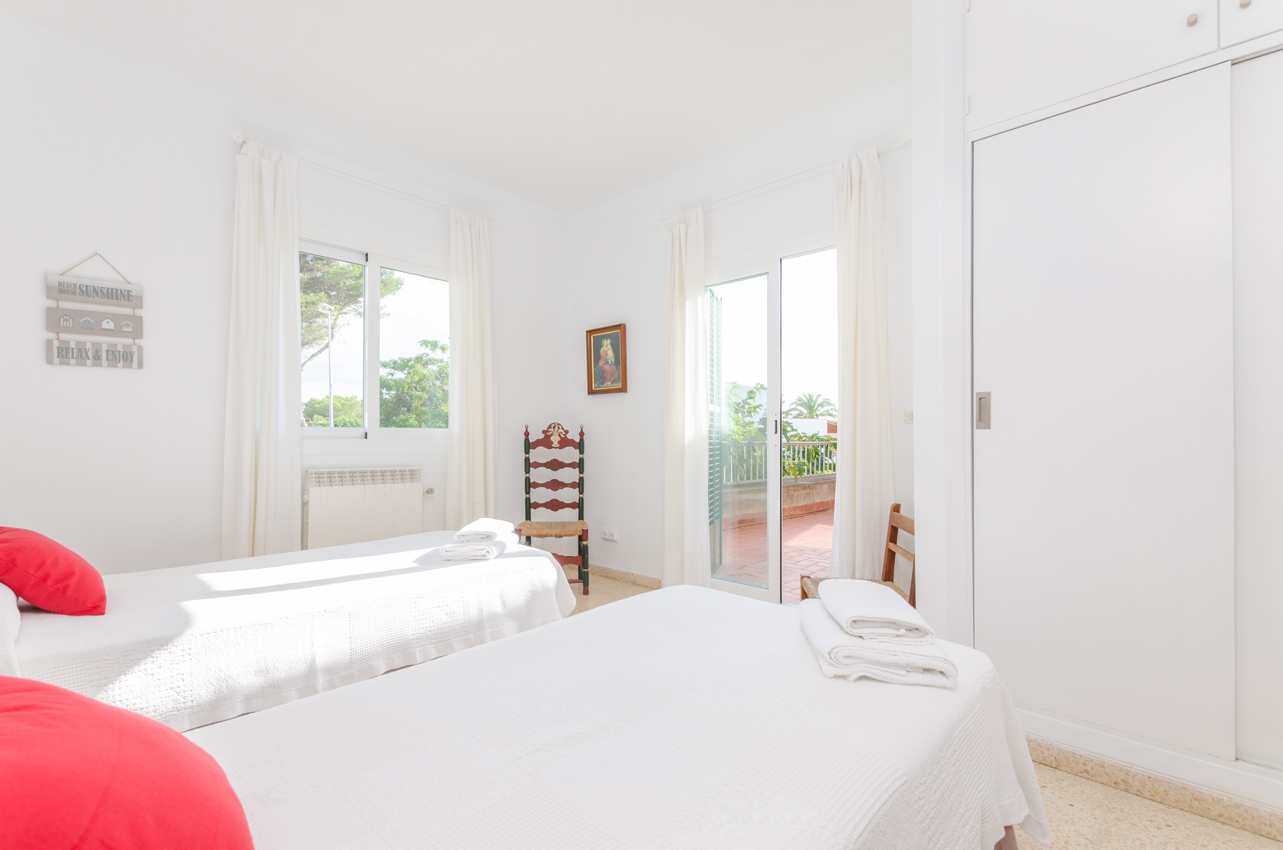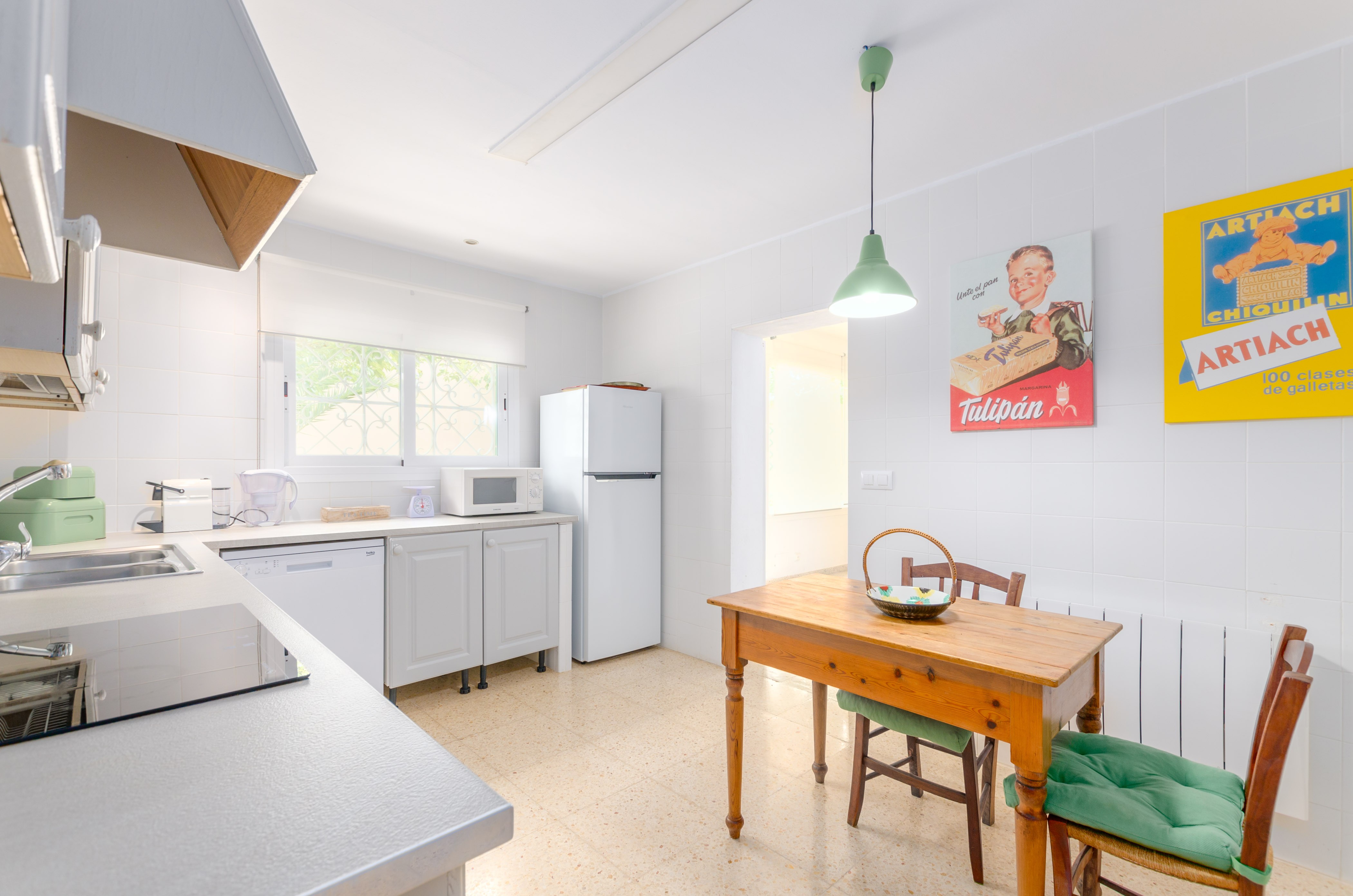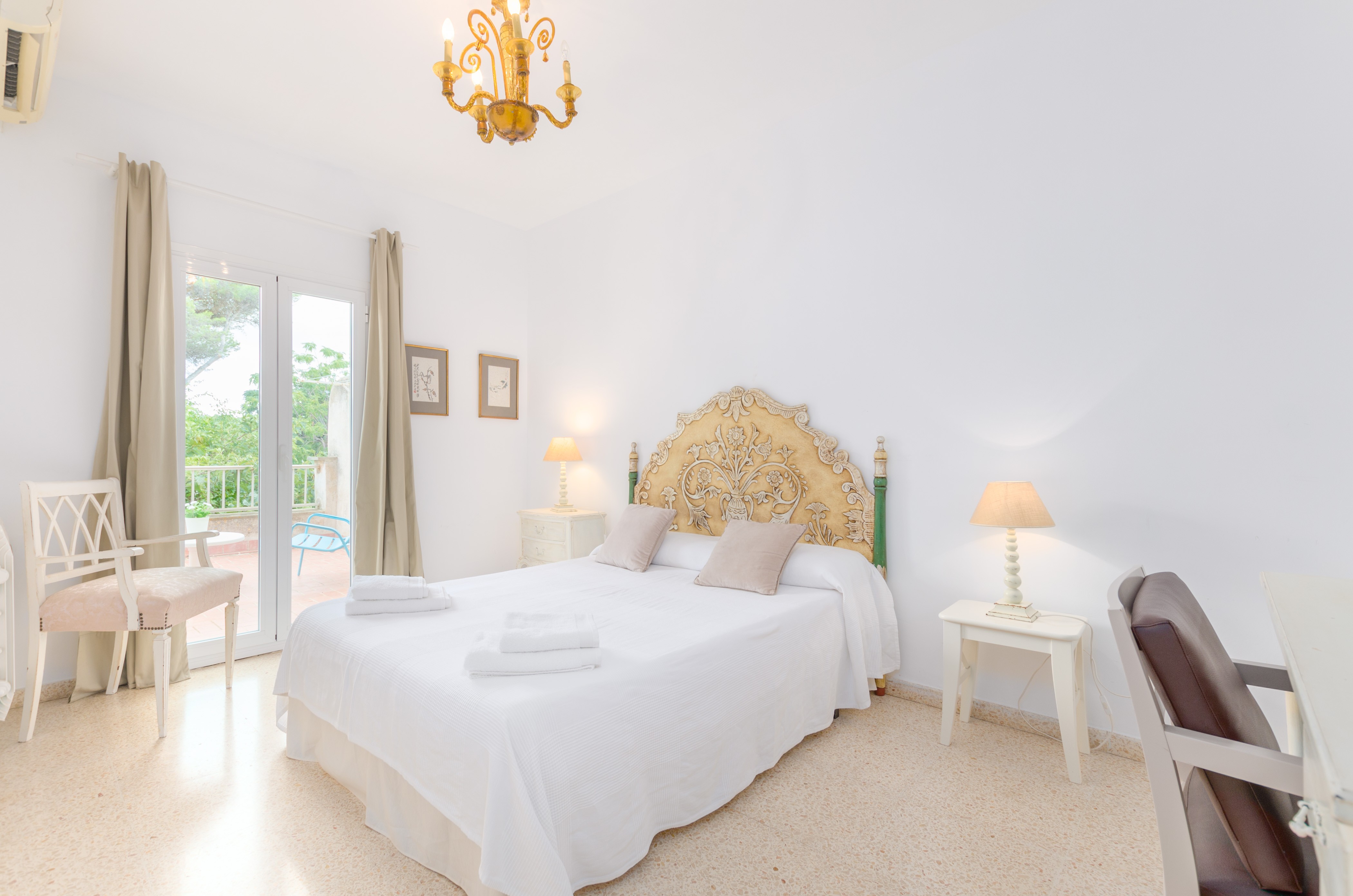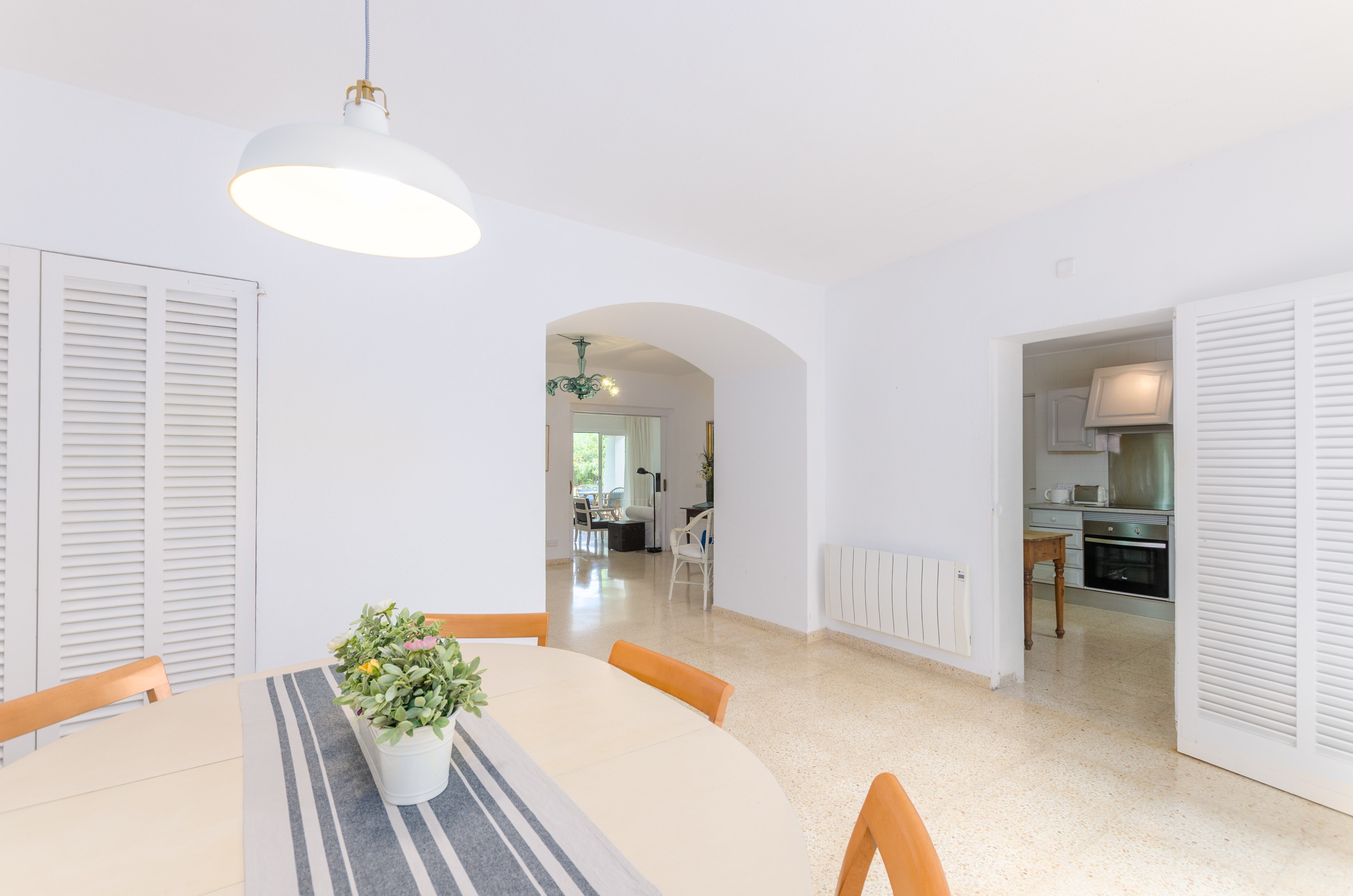 Los interiores de la vivienda irradian mucha frescura y un ambiente veraniego, dado que las estancias y gran parte del mobiliario cuentan con un tono blanco. De hecho, todo lo rústico y de antaño ha sido renovado con mucha delicadeza y gusto. Al entrar, encuentran una gran sala de estar para que pasen tiempo juntos, charlando, descansando o viendo la televisión satélite. El comedor, situado tras un grueso arco después de la entrada y del salón, cuenta con una gran mesa redonda para todos nuestros invitados y conduce hacia la cocina, equipada con vitrocerámica, horno y todo lo que se necesita para cocinar como en casa. La lavandería se localiza en una estancia independiente y pone a su disposición una plancha, tabla de planchar, lavadora y secadora. Al tratarse de una casa de dos plantas, abajo tienen un baño con ducha y, subiendo las escaleras, un aseo, un baño con bañera y los dormitorios. Hay cuatro habitaciones, en total, con aire acondicionado y armario. Una ofrece cama de matrimonio y las otras dos camas individuales cada una. Por otro lado, tres de ellas cuentan con salida directa a una terraza compartida. Y, para completar el equipamiento, hay una cuna y una trona y ocho radiadores.