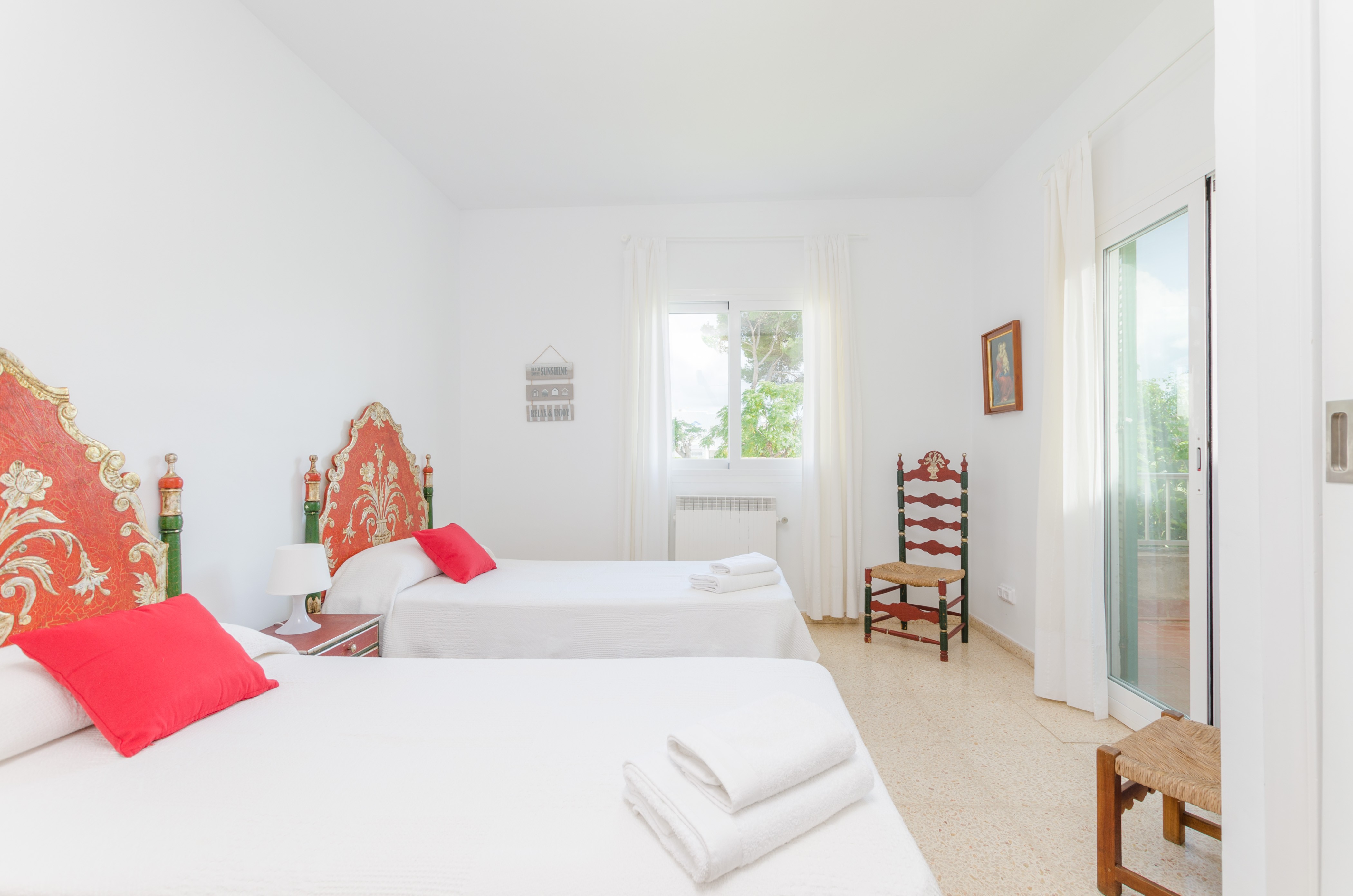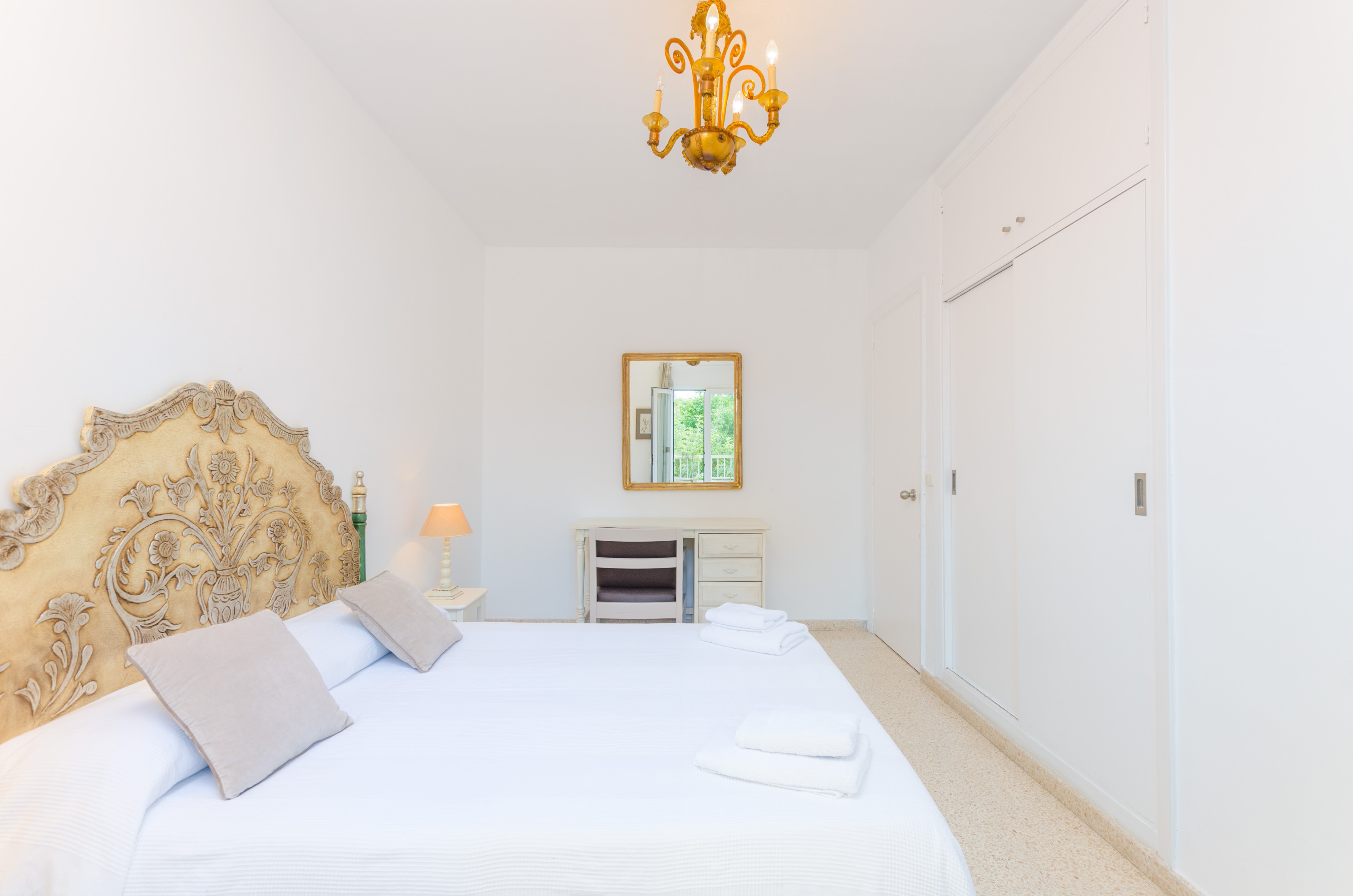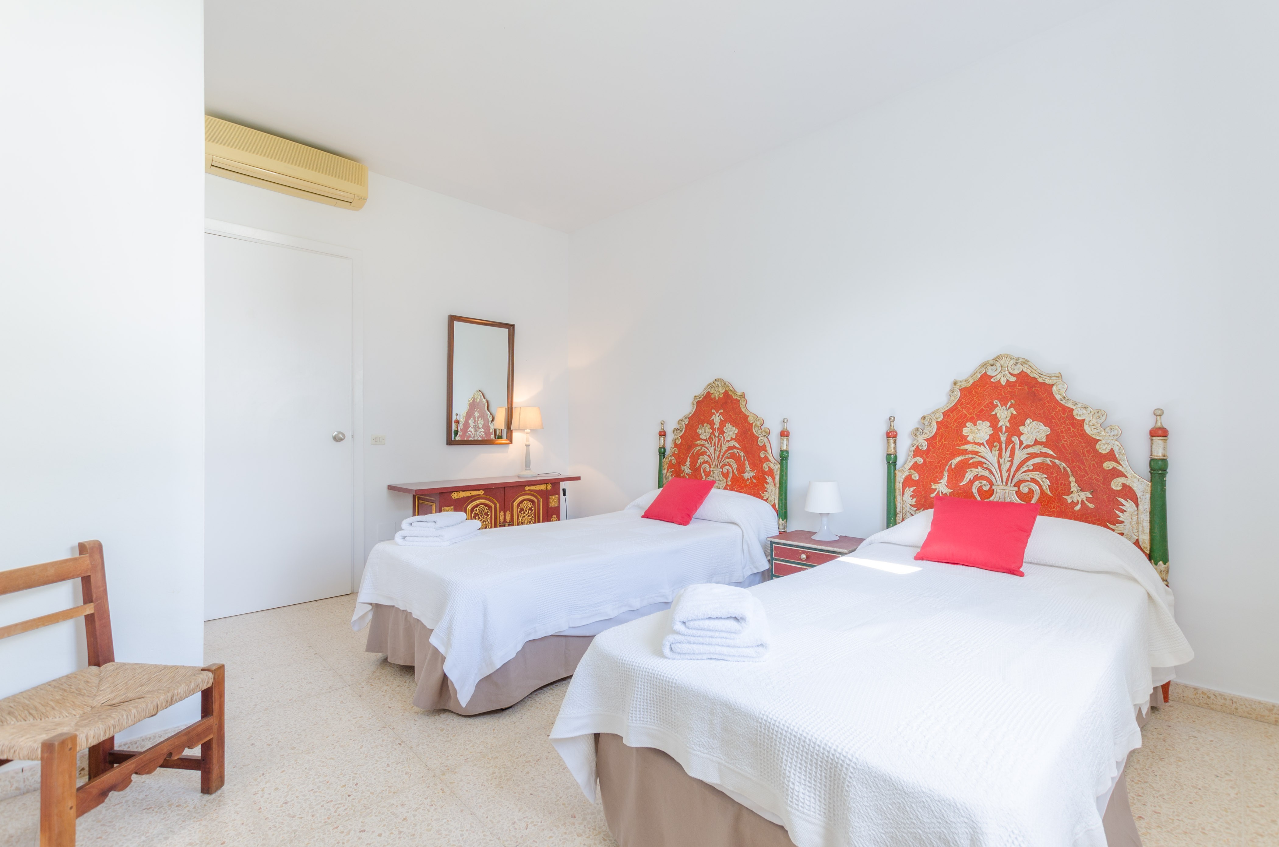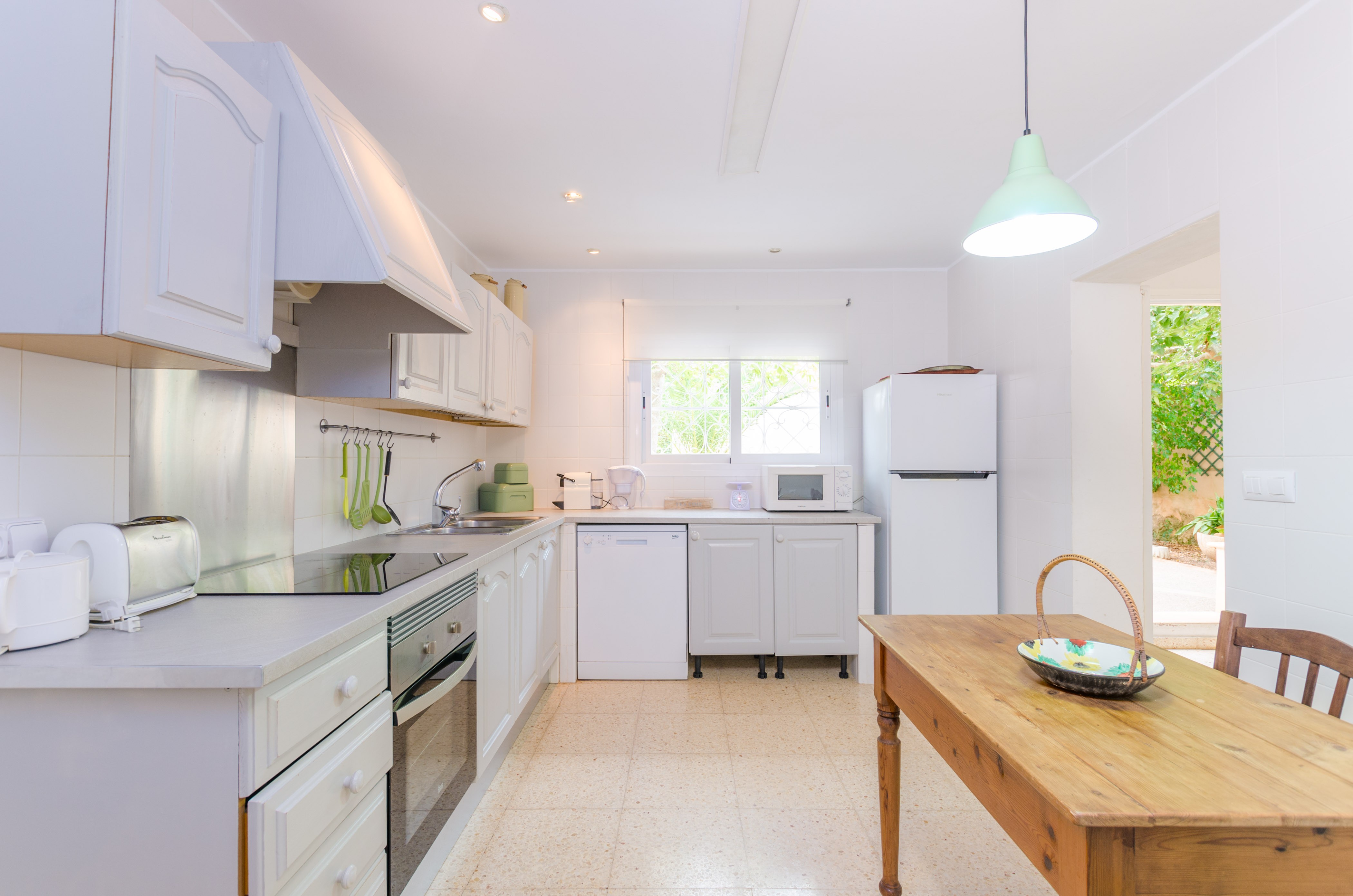 Los interiores de la vivienda irradian mucha frescura y un ambiente veraniego, dado que las estancias y gran parte del mobiliario cuentan con un tono blanco. De hecho, todo lo rústico y de antaño ha sido renovado con mucha delicadeza y gusto. Al entrar, encuentran una gran sala de estar para que pasen tiempo juntos, charlando, descansando o viendo la televisión satélite. El comedor, situado tras un grueso arco después de la entrada y del salón, cuenta con una gran mesa redonda para todos nuestros invitados y conduce hacia la cocina, equipada con vitrocerámica, horno y todo lo que se necesita para cocinar como en casa. La lavandería se localiza en una estancia independiente y pone a su disposición una plancha, tabla de planchar, lavadora y secadora. Al tratarse de una casa de dos plantas, abajo tienen un baño con ducha y, subiendo las escaleras, un aseo, un baño con bañera y los dormitorios. Hay cuatro habitaciones, en total, con aire acondicionado y armario. Una ofrece cama de matrimonio y las otras dos camas individuales cada una. Por otro lado, tres de ellas cuentan con salida directa a una terraza compartida. Y, para completar el equipamiento, hay una cuna y una trona y ocho radiadores.