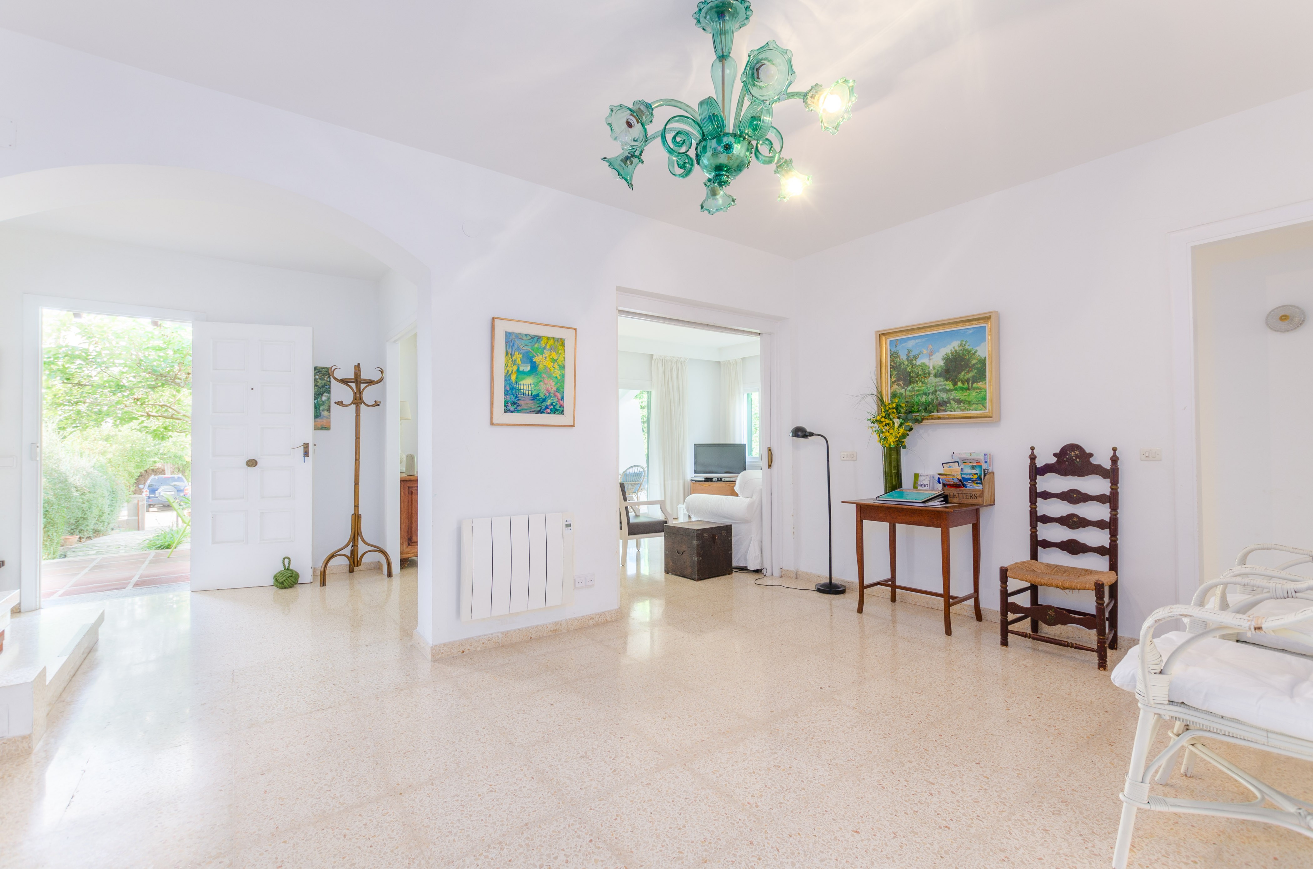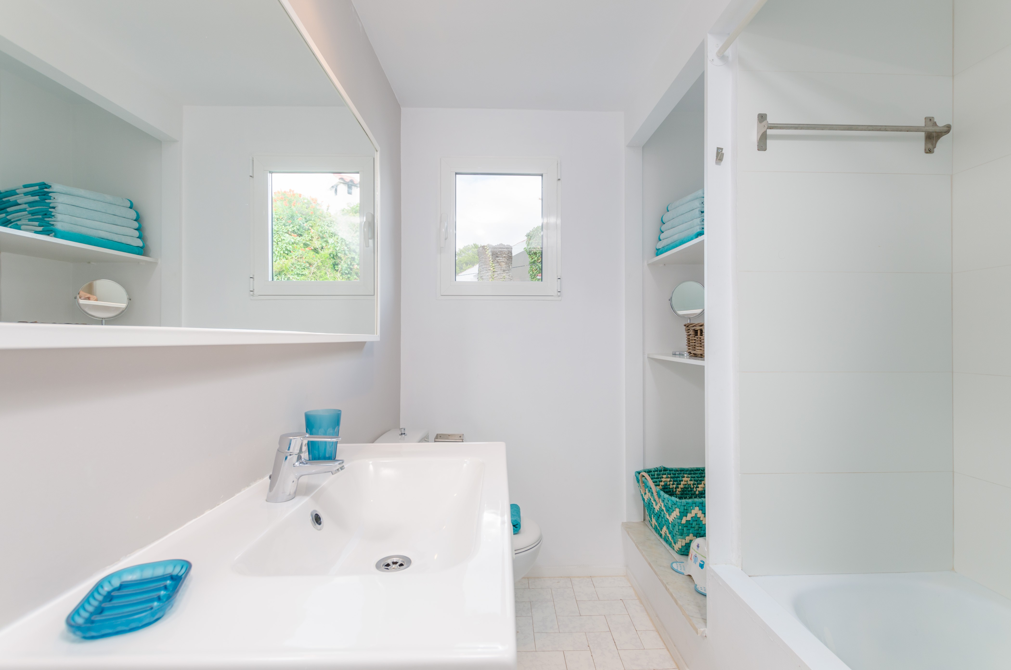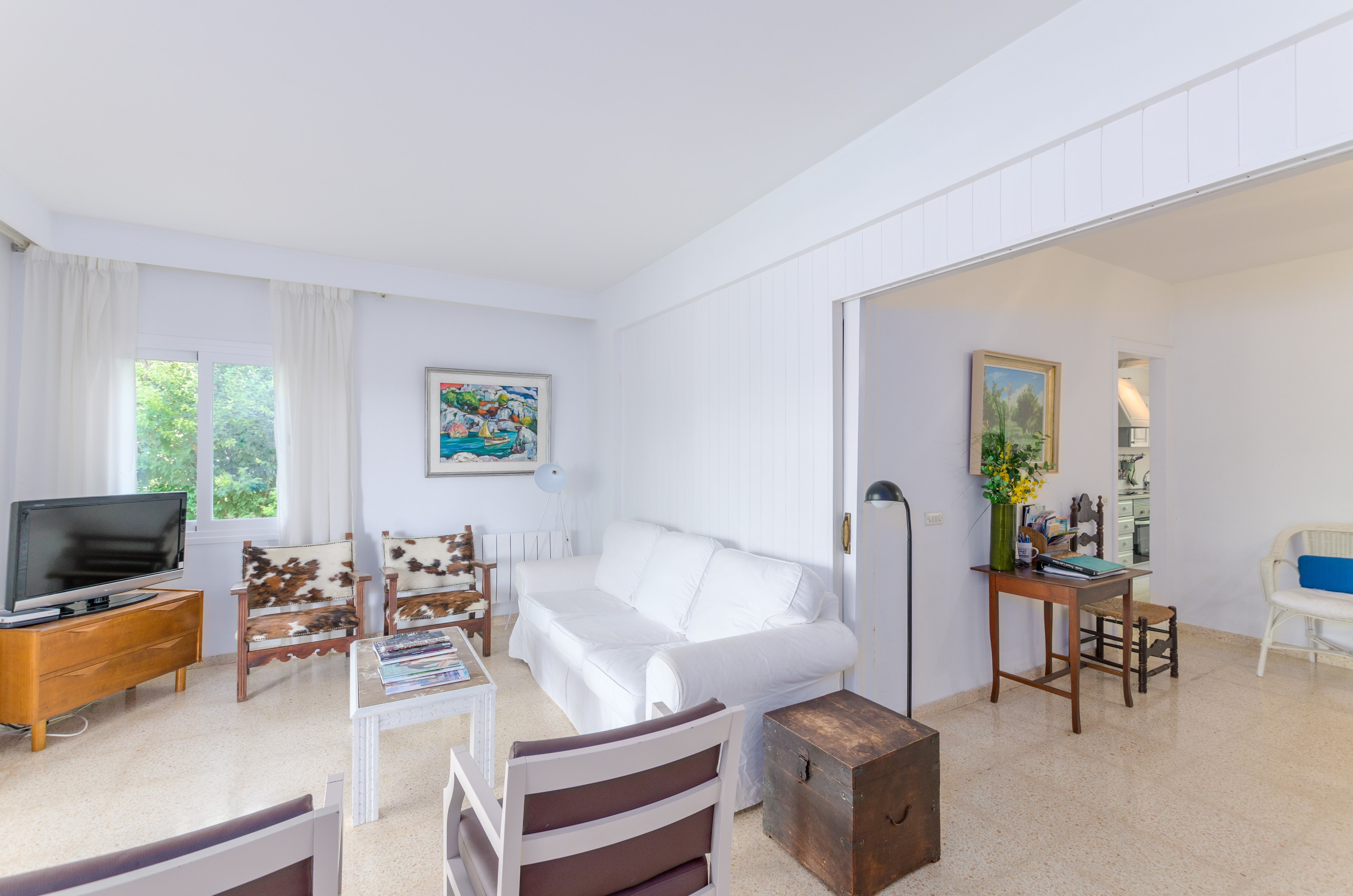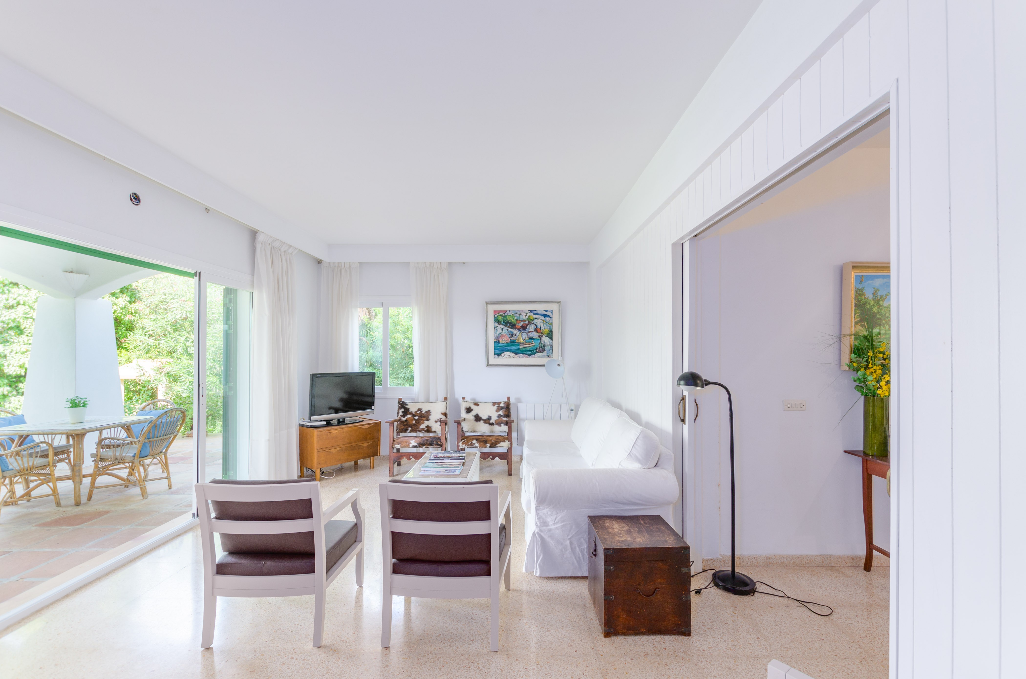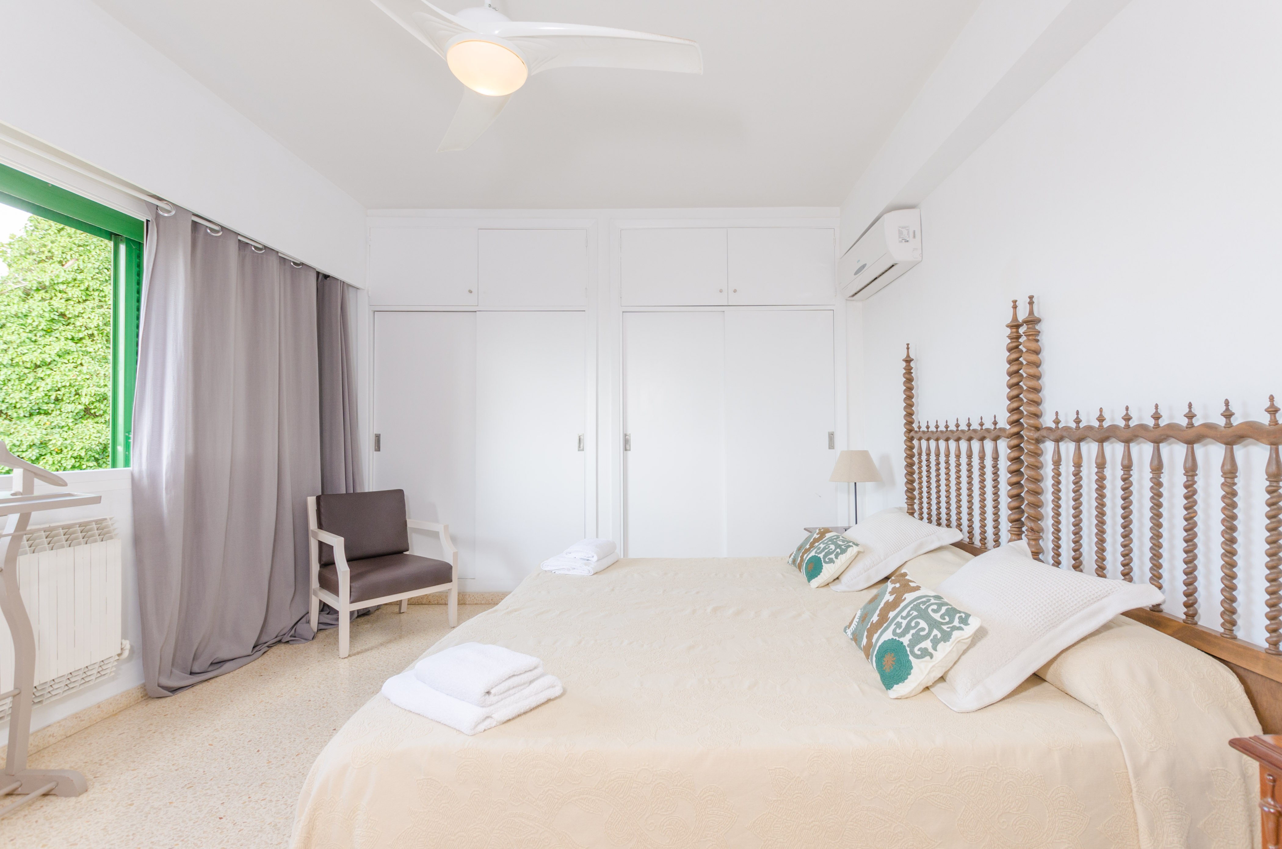 Los interiores de la vivienda irradian mucha frescura y un ambiente veraniego, dado que las estancias y gran parte del mobiliario cuentan con un tono blanco. De hecho, todo lo rústico y de antaño ha sido renovado con mucha delicadeza y gusto. Al entrar, encuentran una gran sala de estar para que pasen tiempo juntos, charlando, descansando o viendo la televisión satélite. El comedor, situado tras un grueso arco después de la entrada y del salón, cuenta con una gran mesa redonda para todos nuestros invitados y conduce hacia la cocina, equipada con vitrocerámica, horno y todo lo que se necesita para cocinar como en casa. La lavandería se localiza en una estancia independiente y pone a su disposición una plancha, tabla de planchar, lavadora y secadora. Al tratarse de una casa de dos plantas, abajo tienen un baño con ducha y, subiendo las escaleras, un aseo, un baño con bañera y los dormitorios. Hay cuatro habitaciones, en total, con aire acondicionado y armario. Una ofrece cama de matrimonio y las otras dos camas individuales cada una. Por otro lado, tres de ellas cuentan con salida directa a una terraza compartida. Y, para completar el equipamiento, hay una cuna y una trona y ocho radiadores.