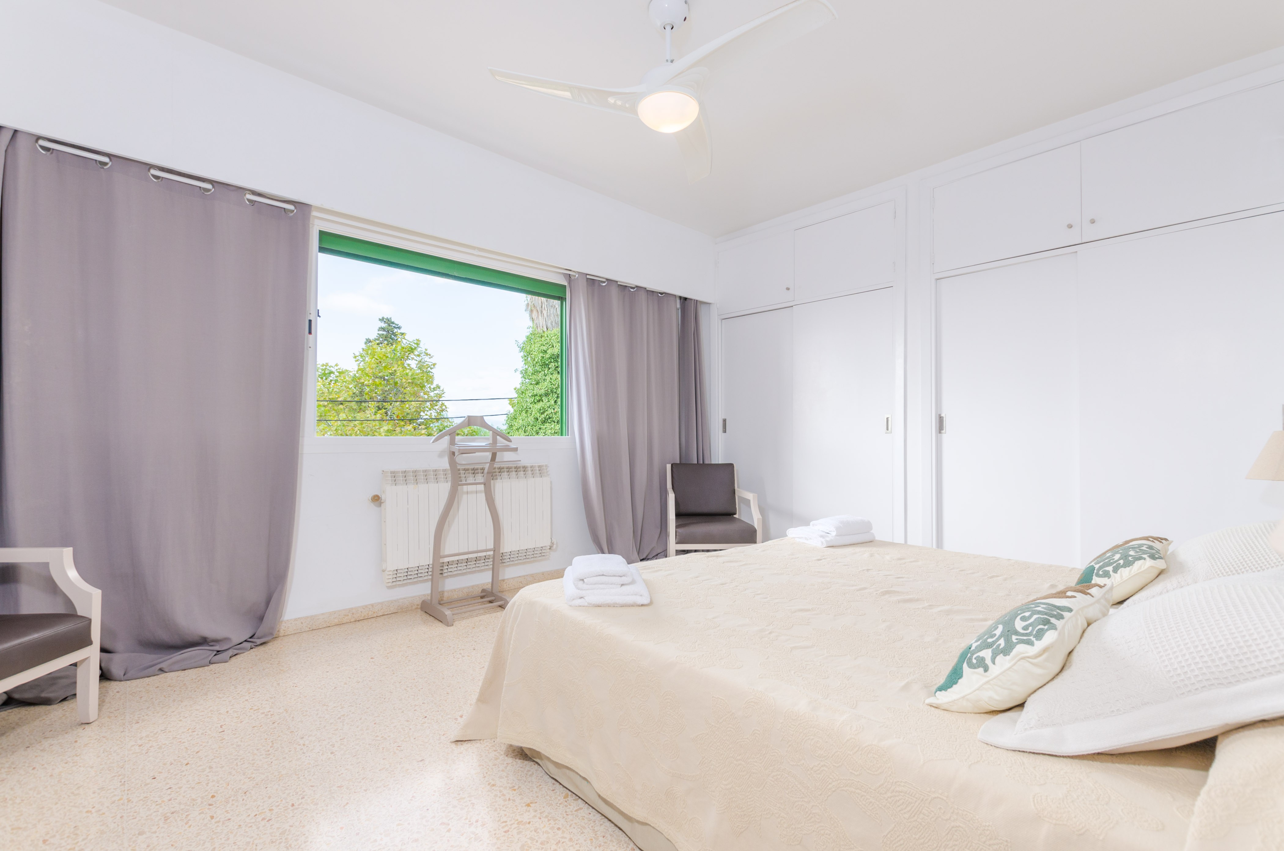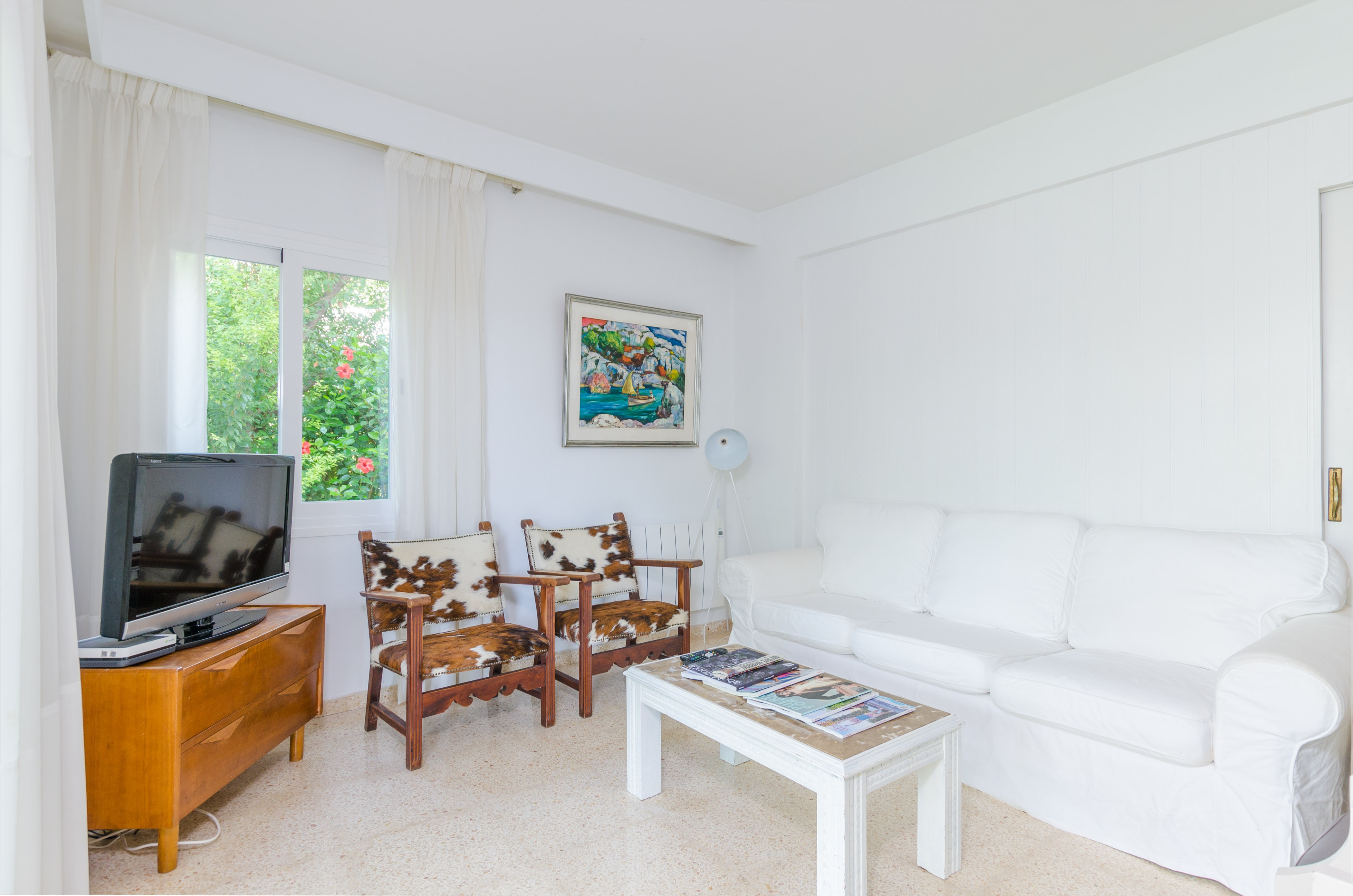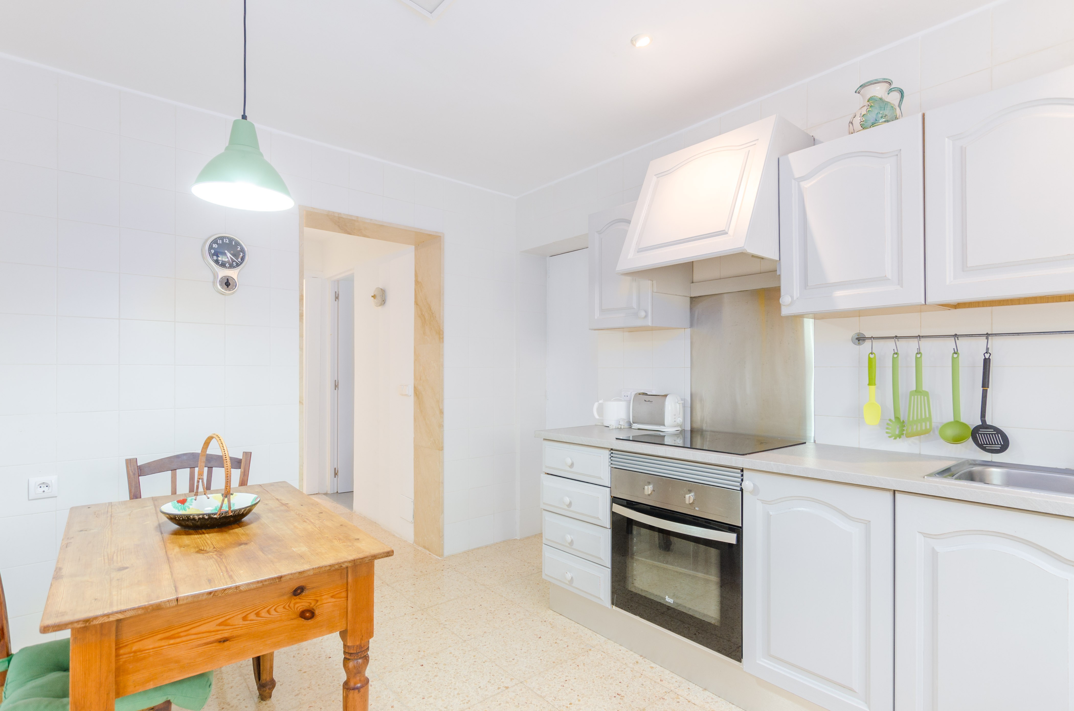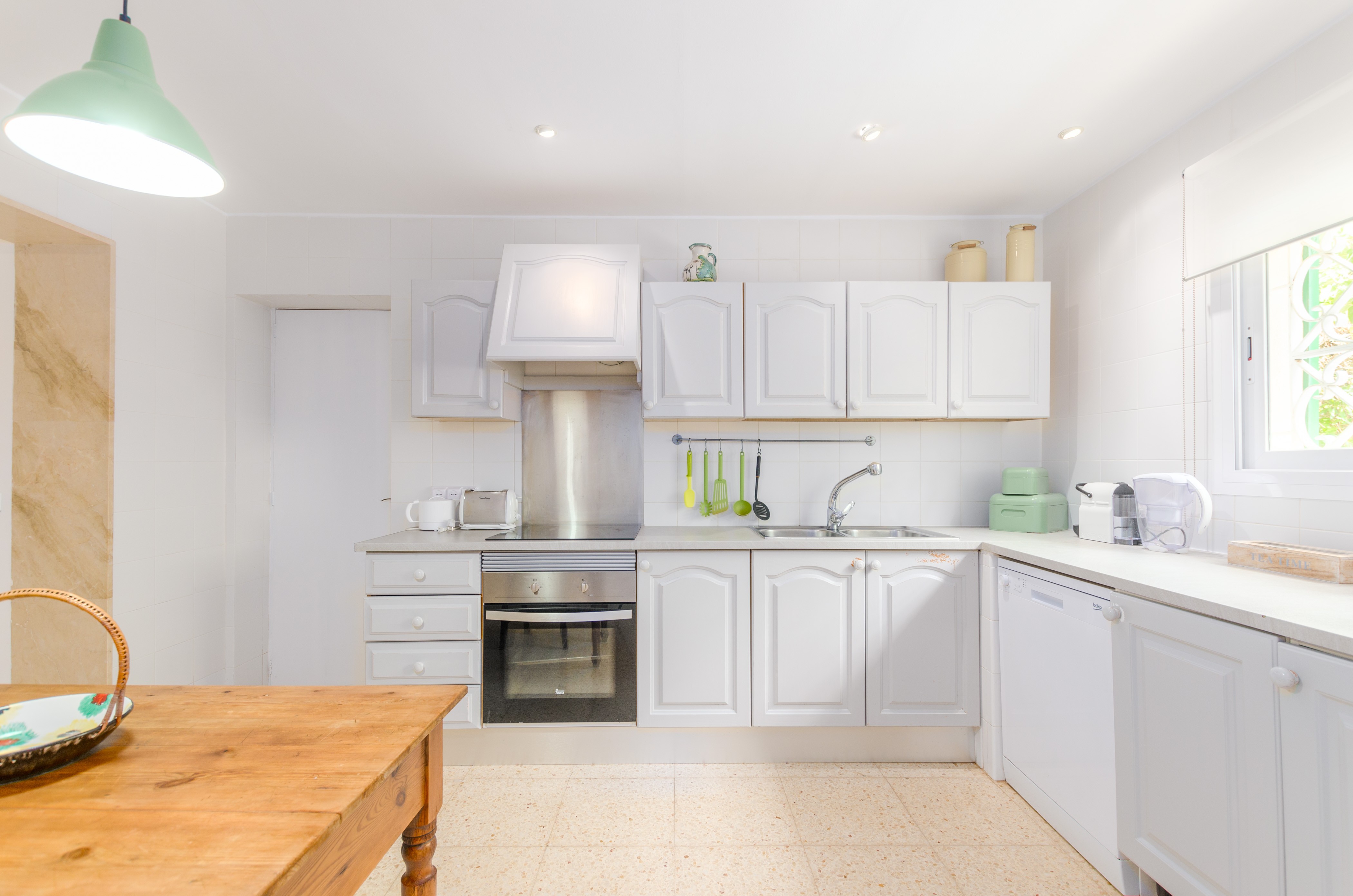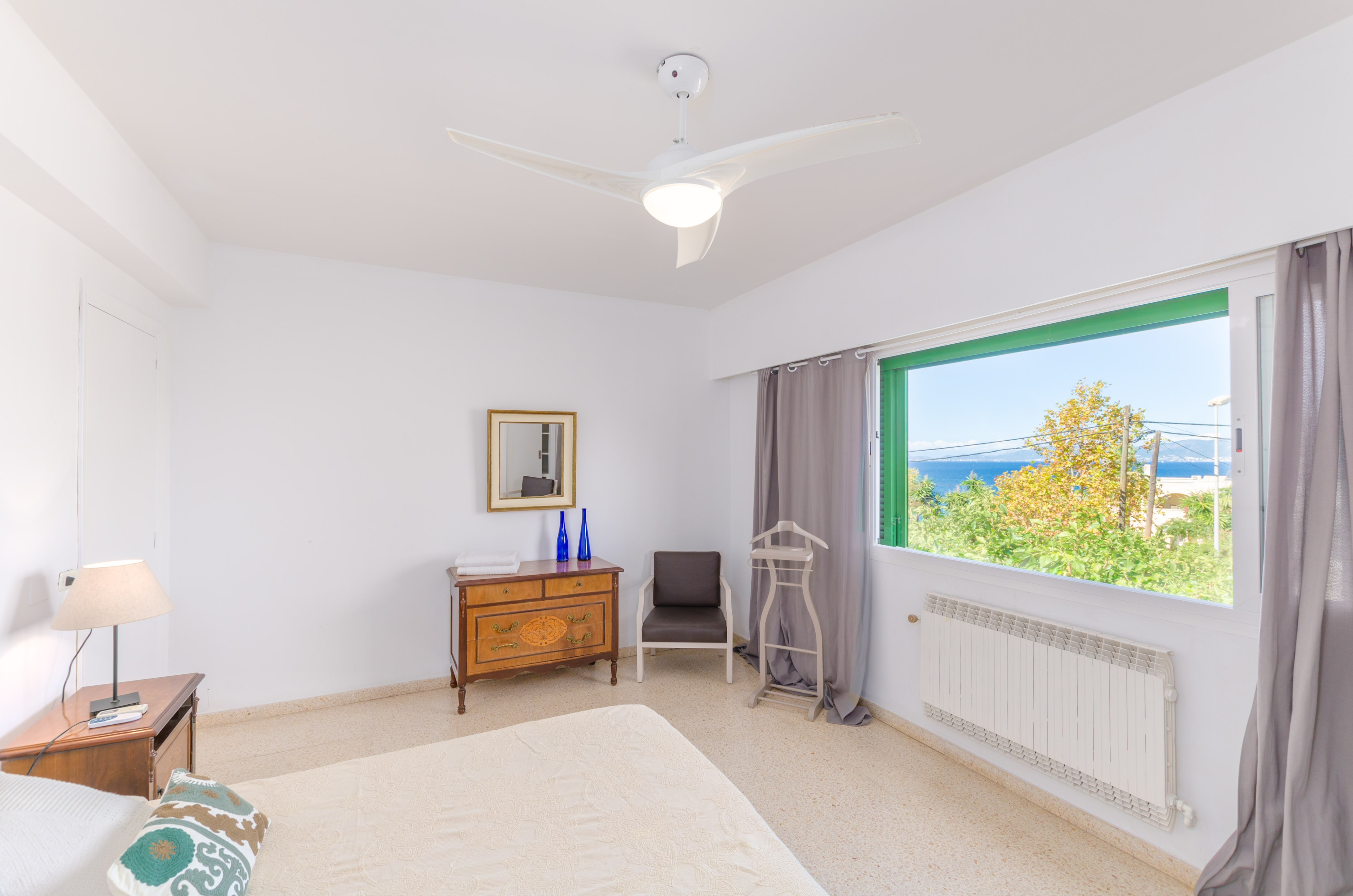 Los interiores de la vivienda irradian mucha frescura y un ambiente veraniego, dado que las estancias y gran parte del mobiliario cuentan con un tono blanco. De hecho, todo lo rústico y de antaño ha sido renovado con mucha delicadeza y gusto. Al entrar, encuentran una gran sala de estar para que pasen tiempo juntos, charlando, descansando o viendo la televisión satélite. El comedor, situado tras un grueso arco después de la entrada y del salón, cuenta con una gran mesa redonda para todos nuestros invitados y conduce hacia la cocina, equipada con vitrocerámica, horno y todo lo que se necesita para cocinar como en casa. La lavandería se localiza en una estancia independiente y pone a su disposición una plancha, tabla de planchar, lavadora y secadora. Al tratarse de una casa de dos plantas, abajo tienen un baño con ducha y, subiendo las escaleras, un aseo, un baño con bañera y los dormitorios. Hay cuatro habitaciones, en total, con aire acondicionado y armario. Una ofrece cama de matrimonio y las otras dos camas individuales cada una. Por otro lado, tres de ellas cuentan con salida directa a una terraza compartida. Y, para completar el equipamiento, hay una cuna y una trona y ocho radiadores.