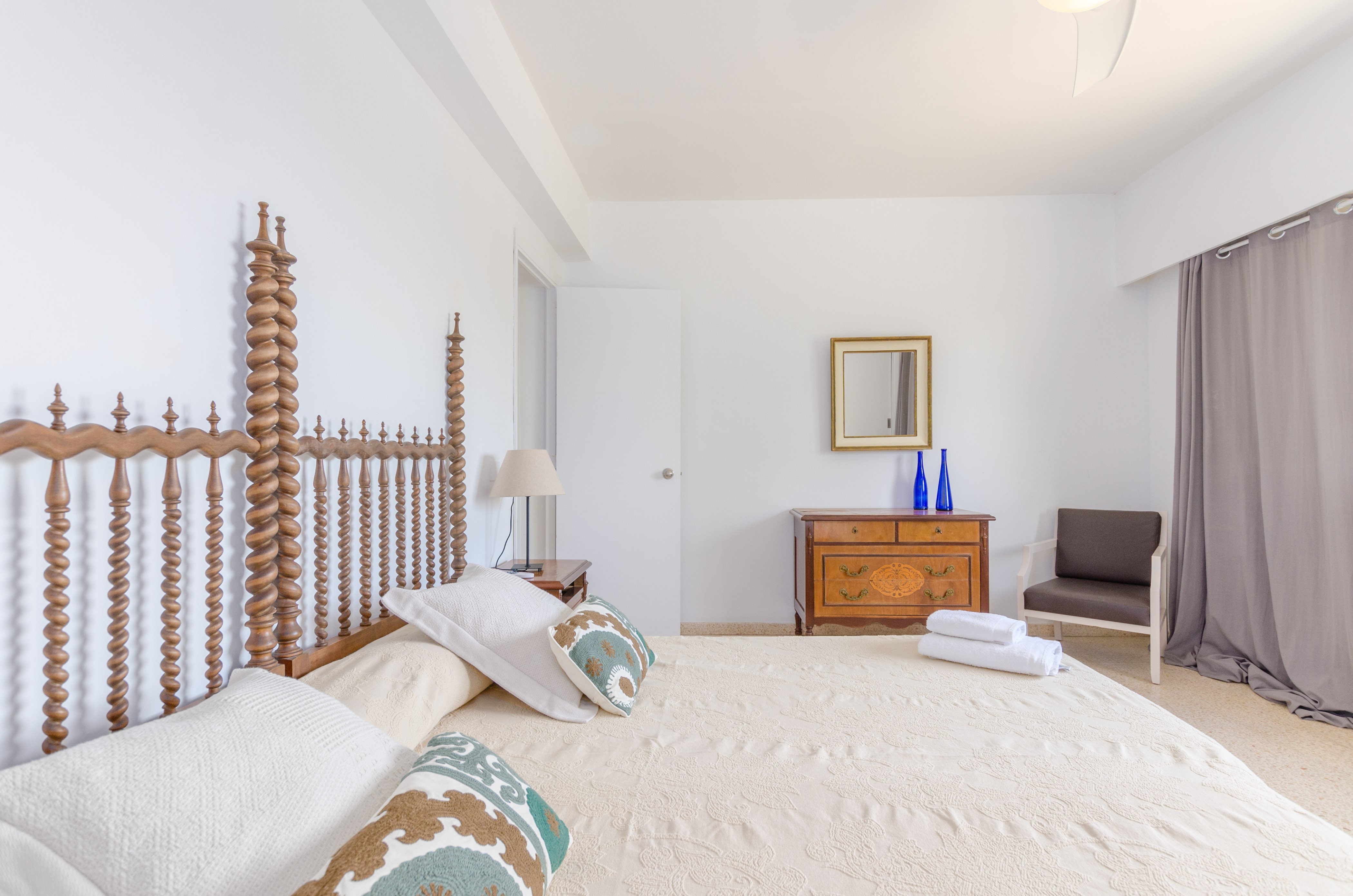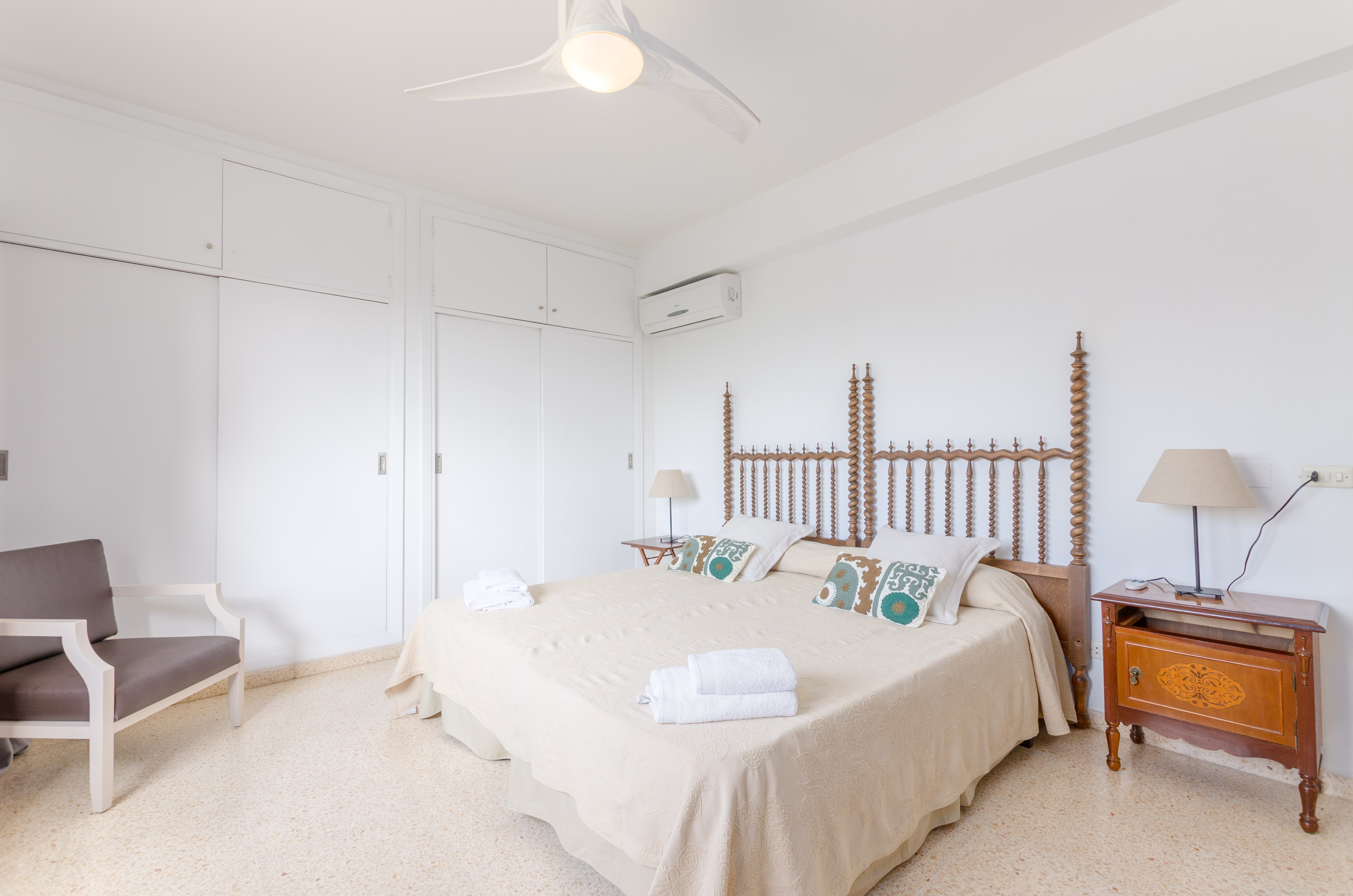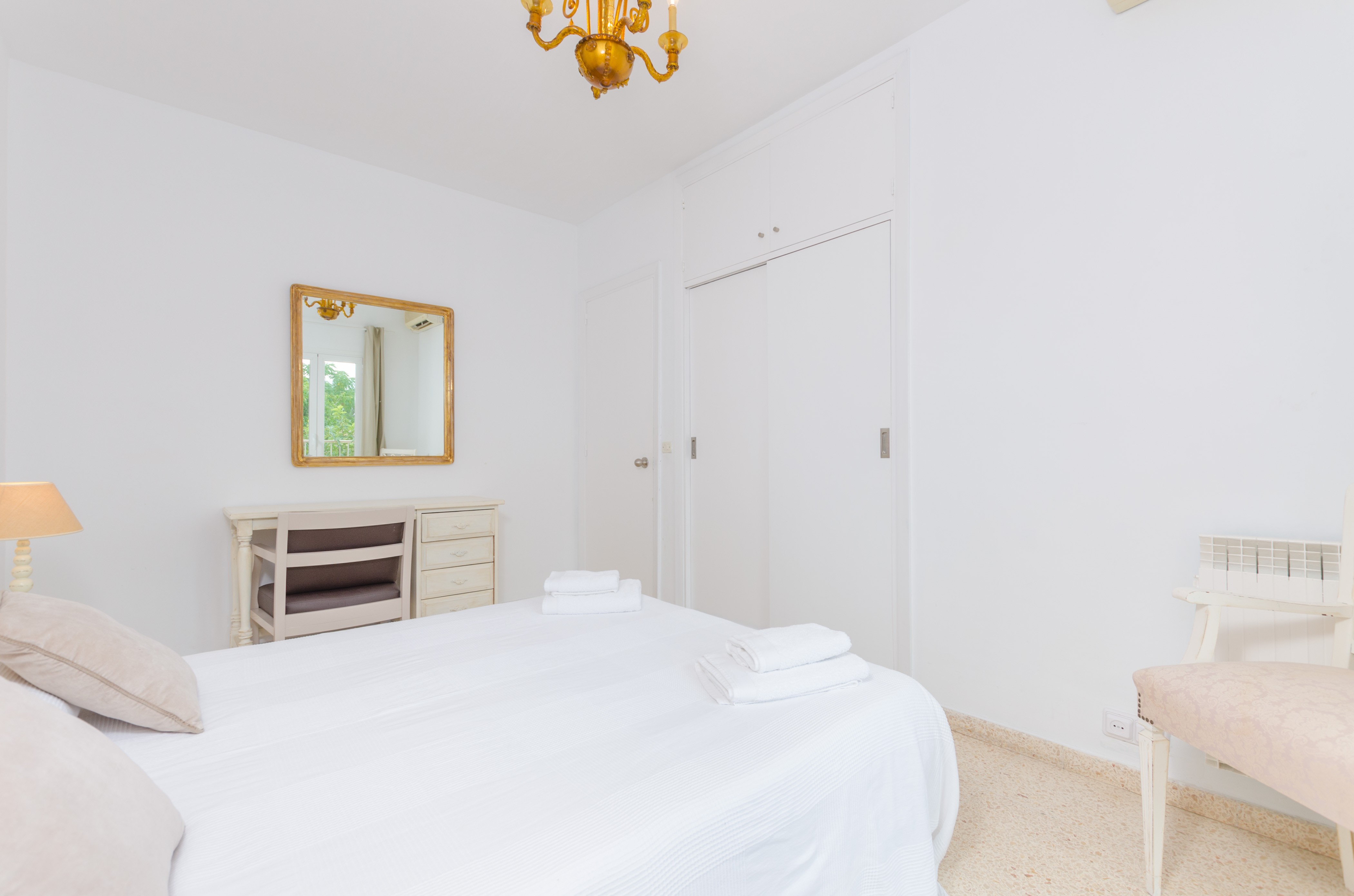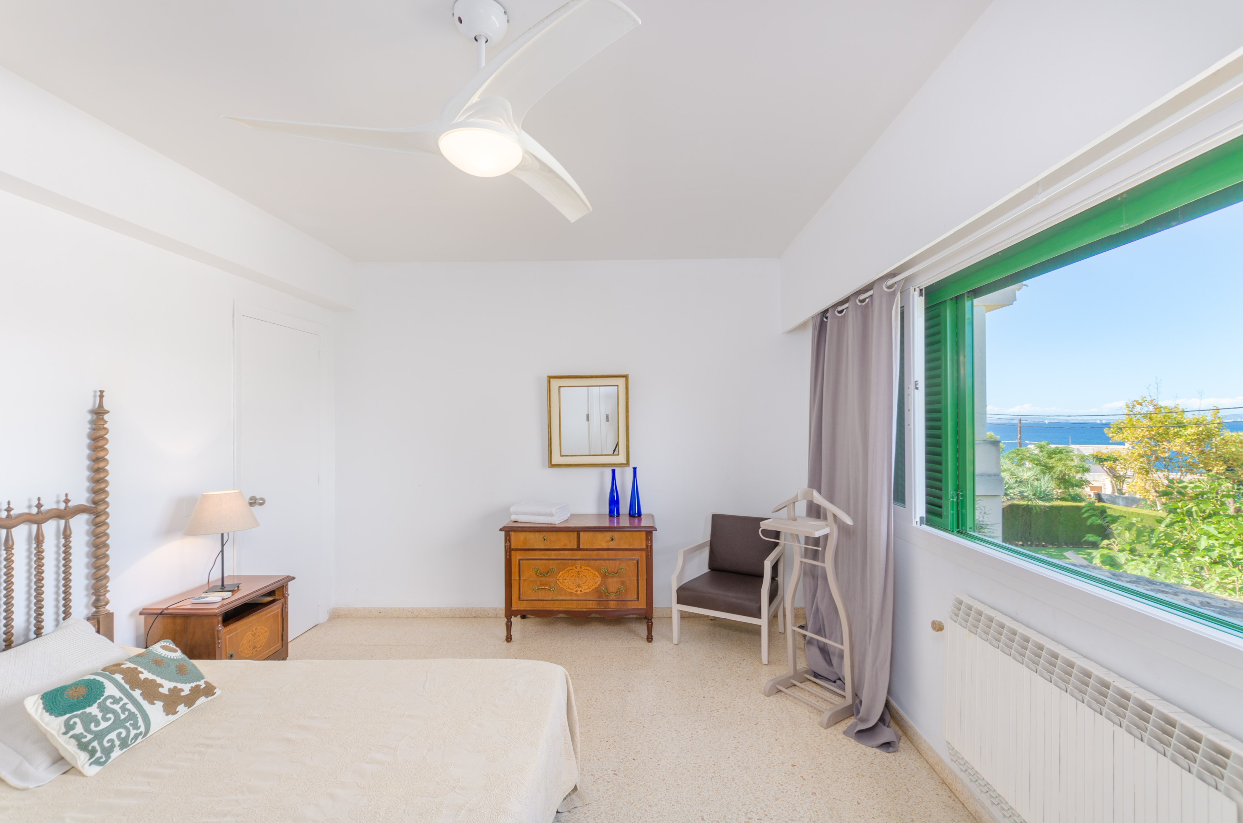 Los interiores de la vivienda irradian mucha frescura y un ambiente veraniego, dado que las estancias y gran parte del mobiliario cuentan con un tono blanco. De hecho, todo lo rústico y de antaño ha sido renovado con mucha delicadeza y gusto. Al entrar, encuentran una gran sala de estar para que pasen tiempo juntos, charlando, descansando o viendo la televisión satélite. El comedor, situado tras un grueso arco después de la entrada y del salón, cuenta con una gran mesa redonda para todos nuestros invitados y conduce hacia la cocina, equipada con vitrocerámica, horno y todo lo que se necesita para cocinar como en casa. La lavandería se localiza en una estancia independiente y pone a su disposición una plancha, tabla de planchar, lavadora y secadora. Al tratarse de una casa de dos plantas, abajo tienen un baño con ducha y, subiendo las escaleras, un aseo, un baño con bañera y los dormitorios. Hay cuatro habitaciones, en total, con aire acondicionado y armario. Una ofrece cama de matrimonio y las otras dos camas individuales cada una. Por otro lado, tres de ellas cuentan con salida directa a una terraza compartida. Y, para completar el equipamiento, hay una cuna y una trona y ocho radiadores.