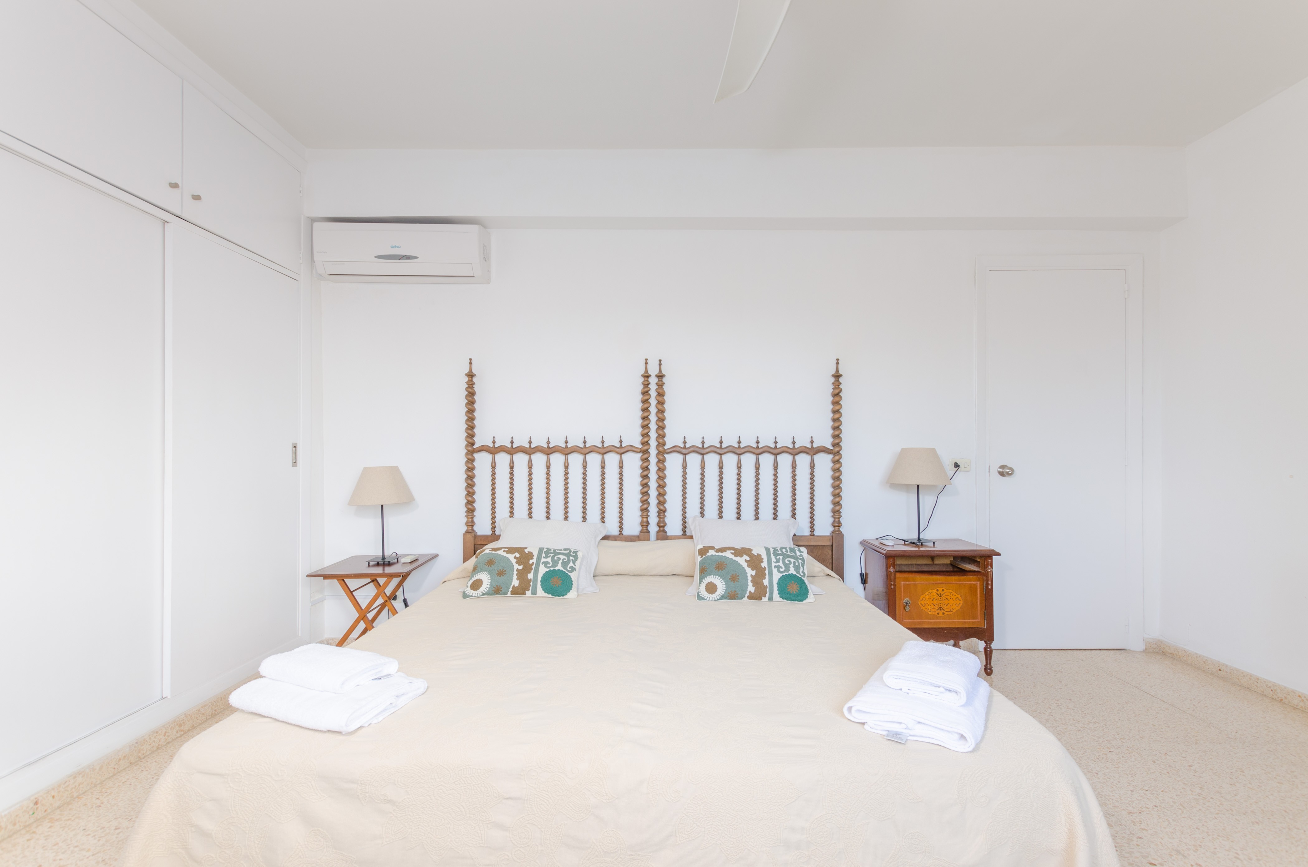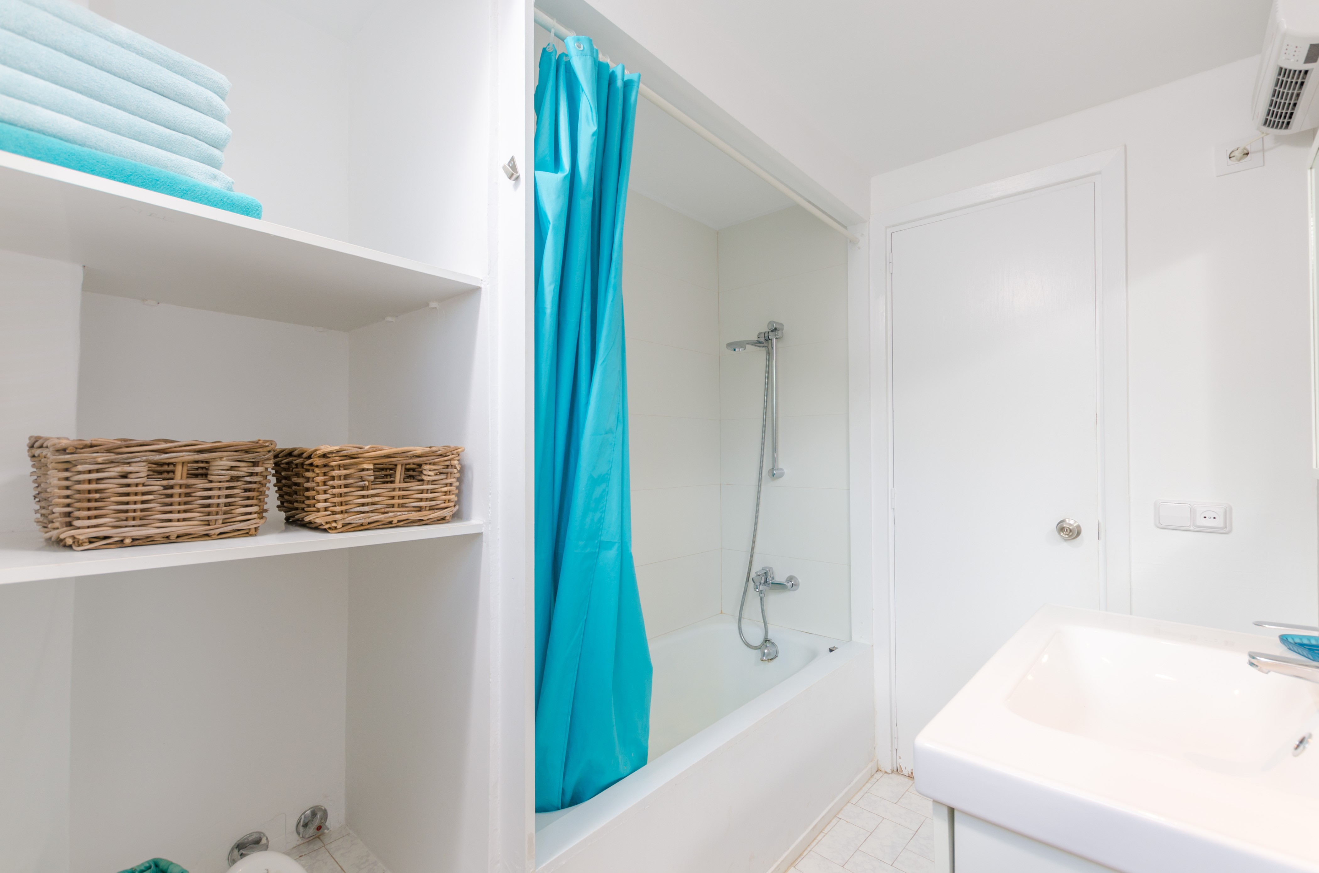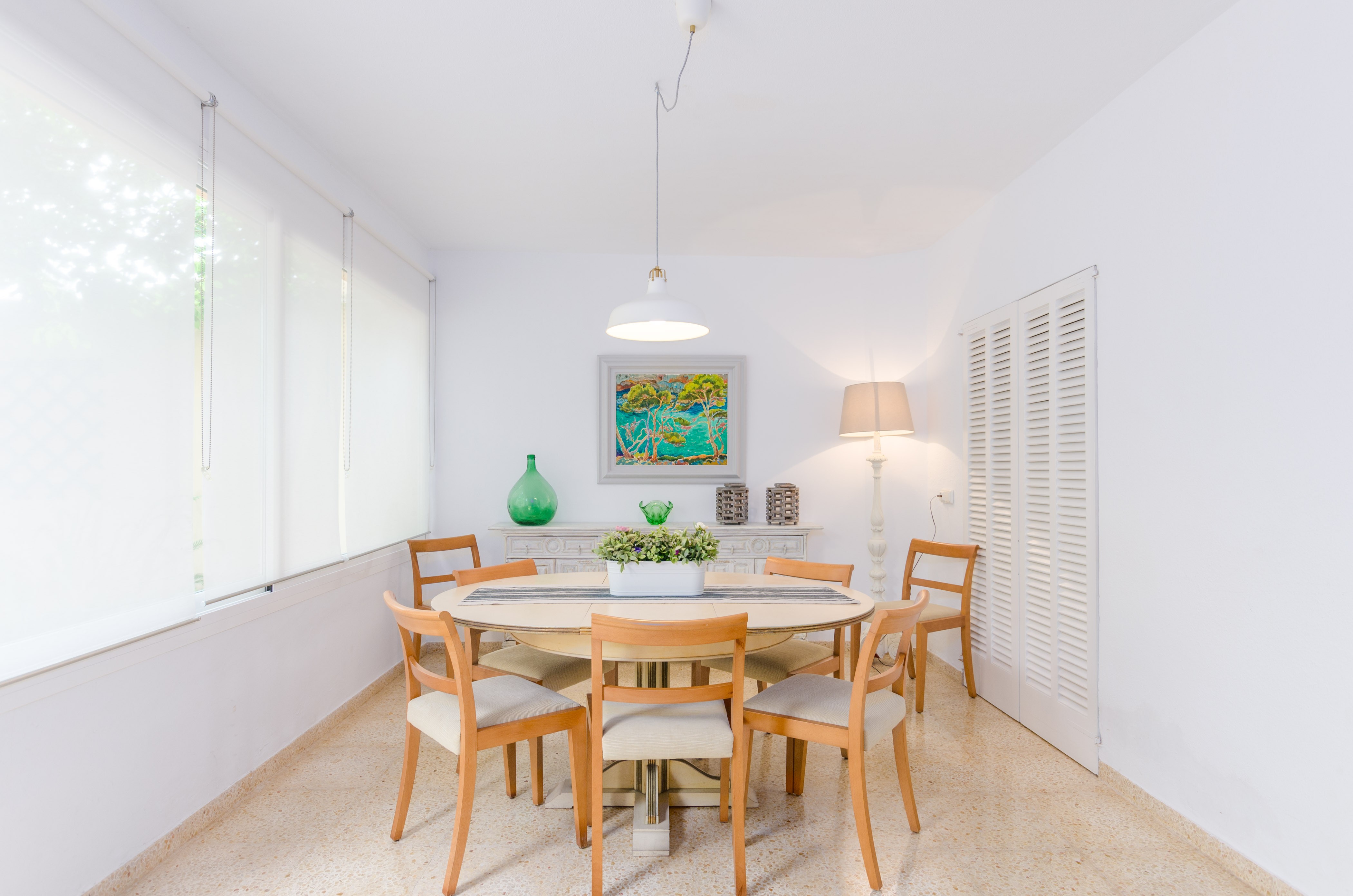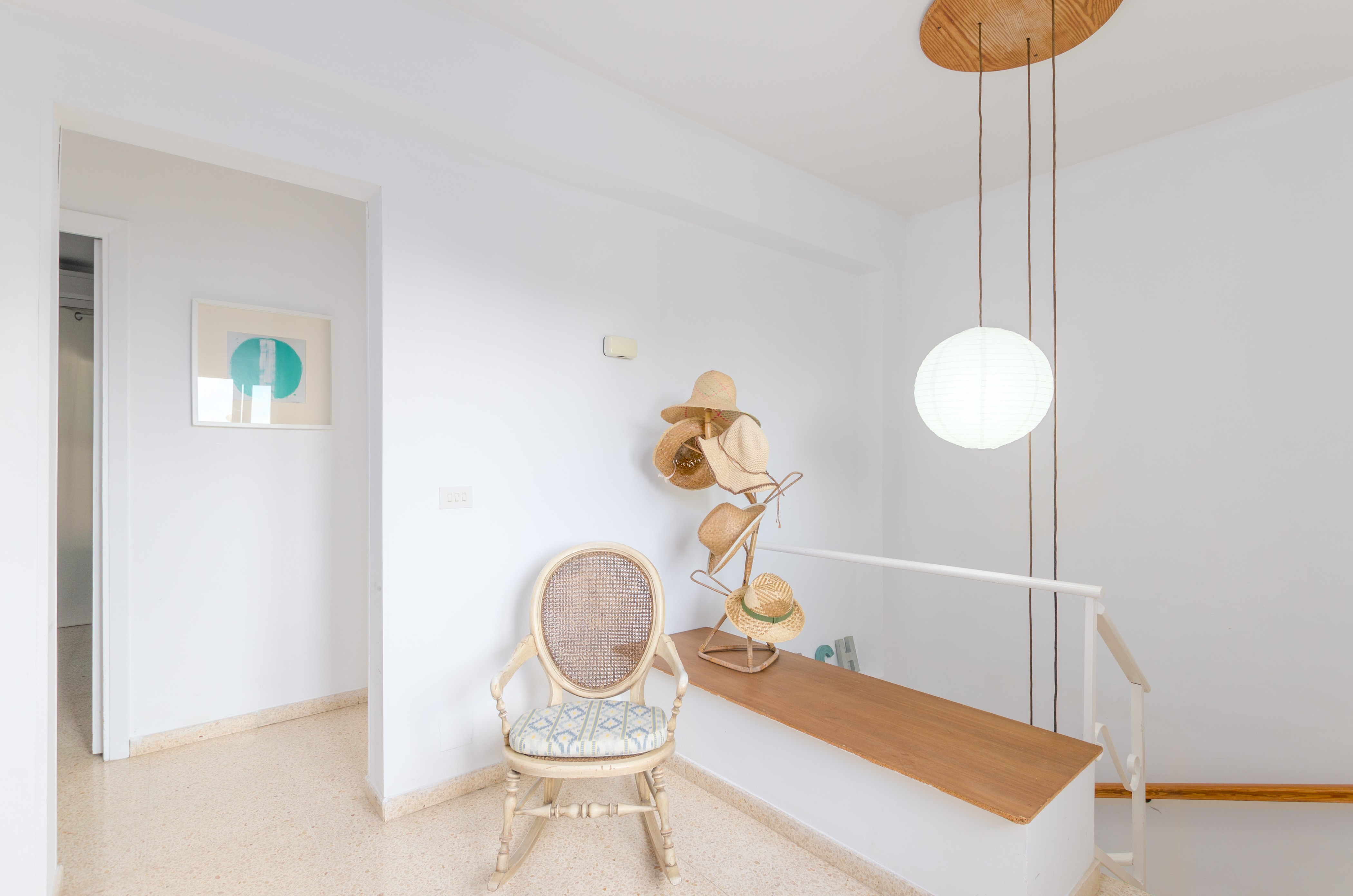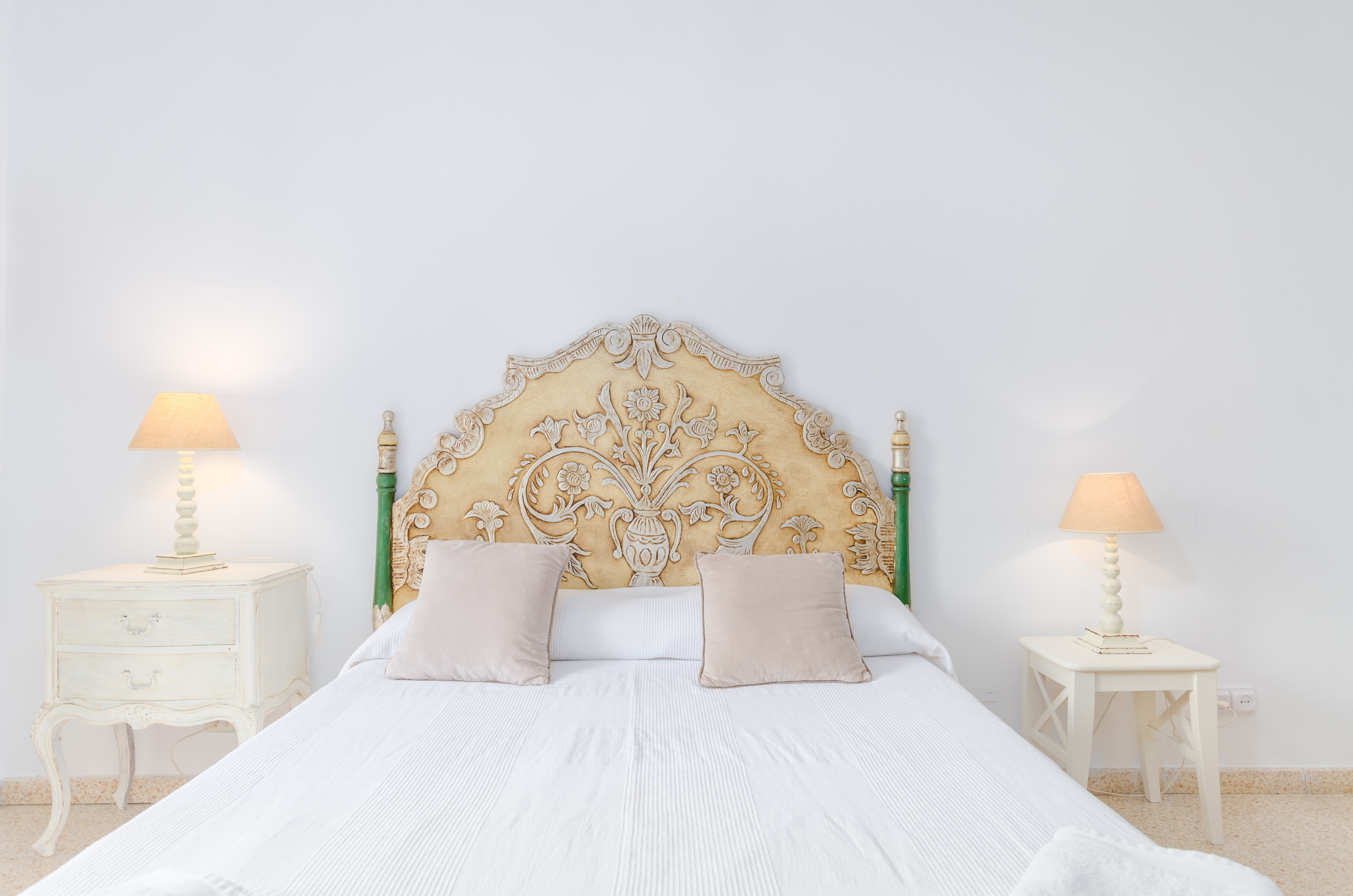 Los interiores de la vivienda irradian mucha frescura y un ambiente veraniego, dado que las estancias y gran parte del mobiliario cuentan con un tono blanco. De hecho, todo lo rústico y de antaño ha sido renovado con mucha delicadeza y gusto. Al entrar, encuentran una gran sala de estar para que pasen tiempo juntos, charlando, descansando o viendo la televisión satélite. El comedor, situado tras un grueso arco después de la entrada y del salón, cuenta con una gran mesa redonda para todos nuestros invitados y conduce hacia la cocina, equipada con vitrocerámica, horno y todo lo que se necesita para cocinar como en casa. La lavandería se localiza en una estancia independiente y pone a su disposición una plancha, tabla de planchar, lavadora y secadora. Al tratarse de una casa de dos plantas, abajo tienen un baño con ducha y, subiendo las escaleras, un aseo, un baño con bañera y los dormitorios. Hay cuatro habitaciones, en total, con aire acondicionado y armario. Una ofrece cama de matrimonio y las otras dos camas individuales cada una. Por otro lado, tres de ellas cuentan con salida directa a una terraza compartida. Y, para completar el equipamiento, hay una cuna y una trona y ocho radiadores.