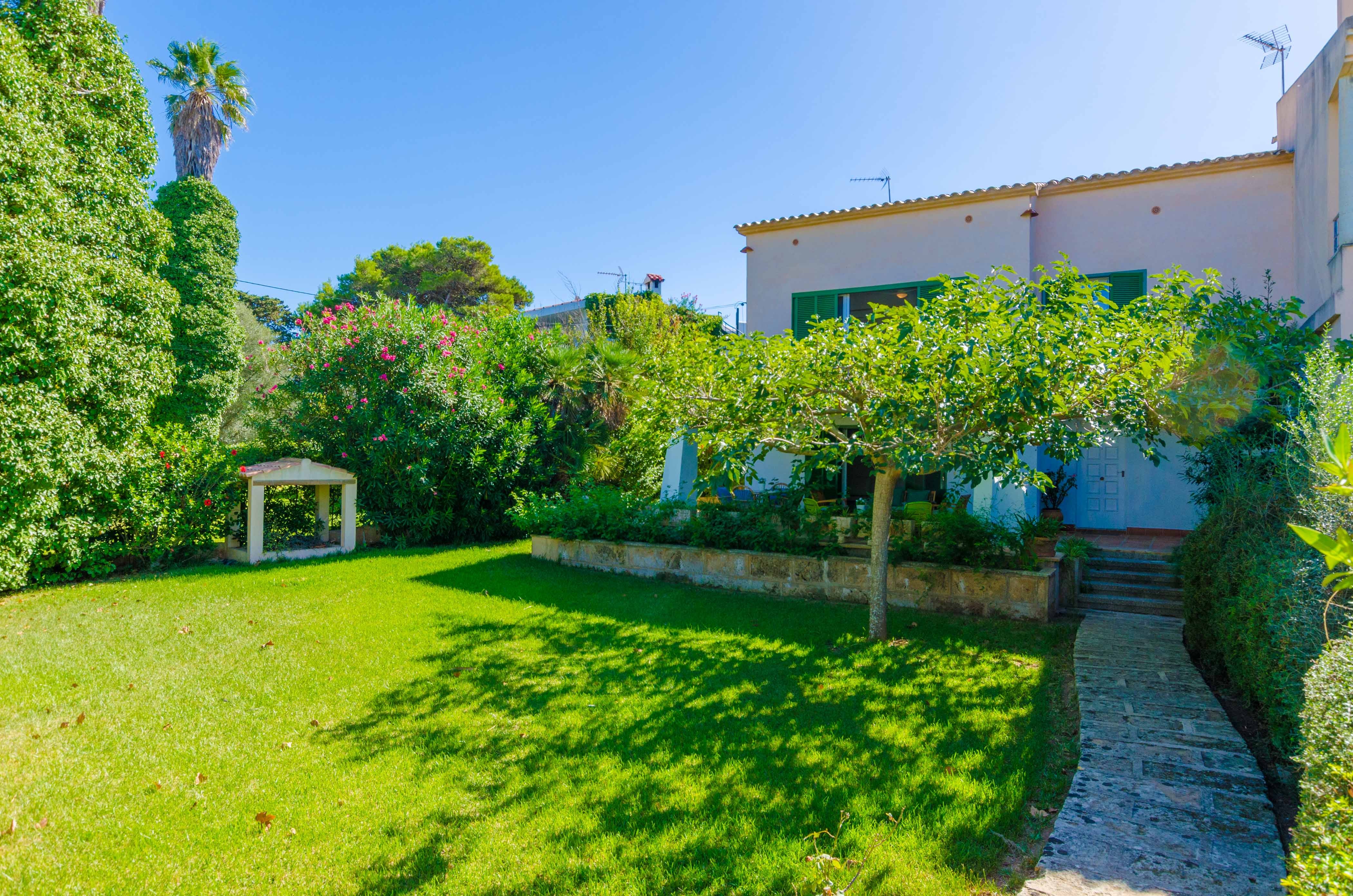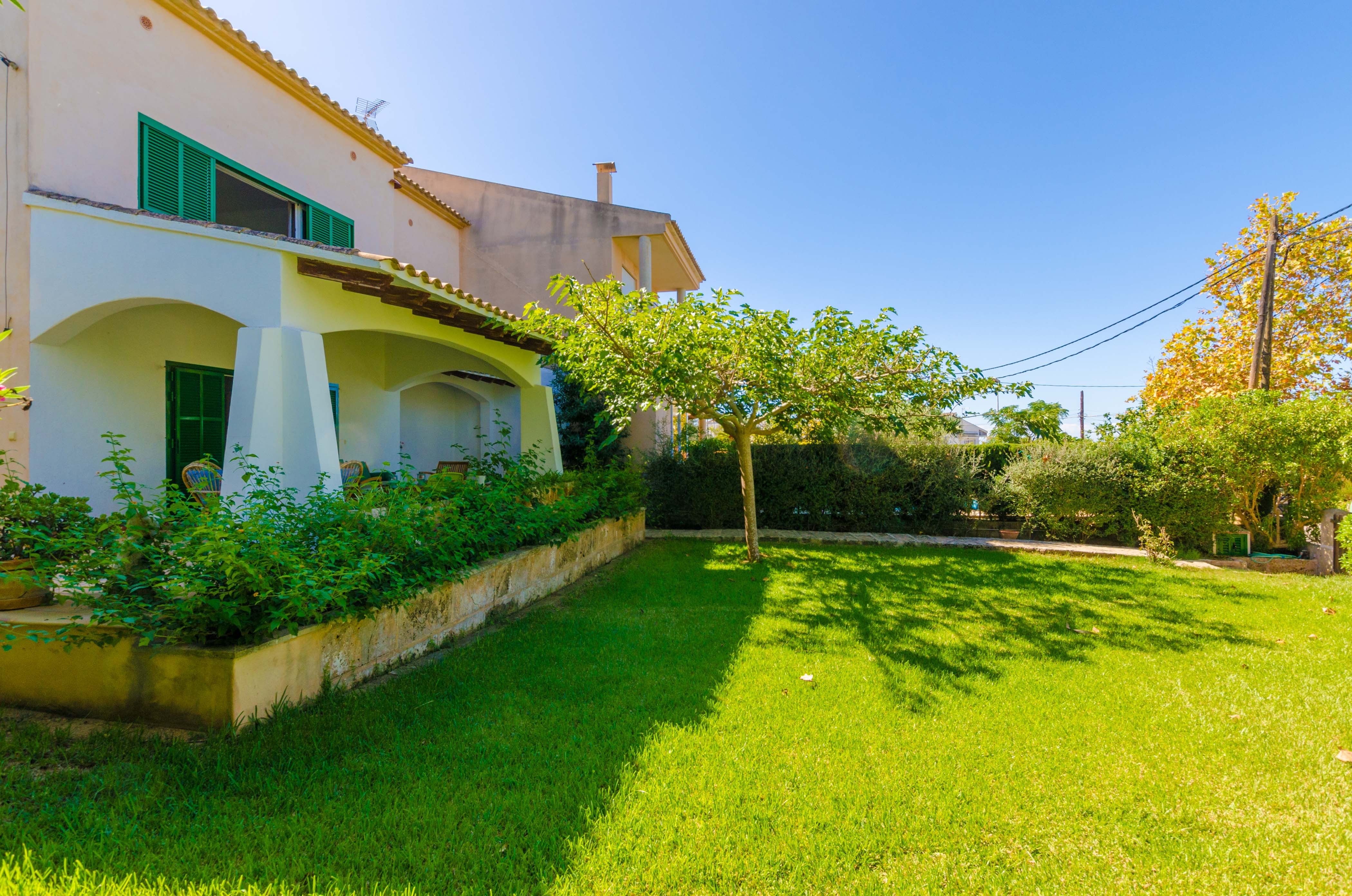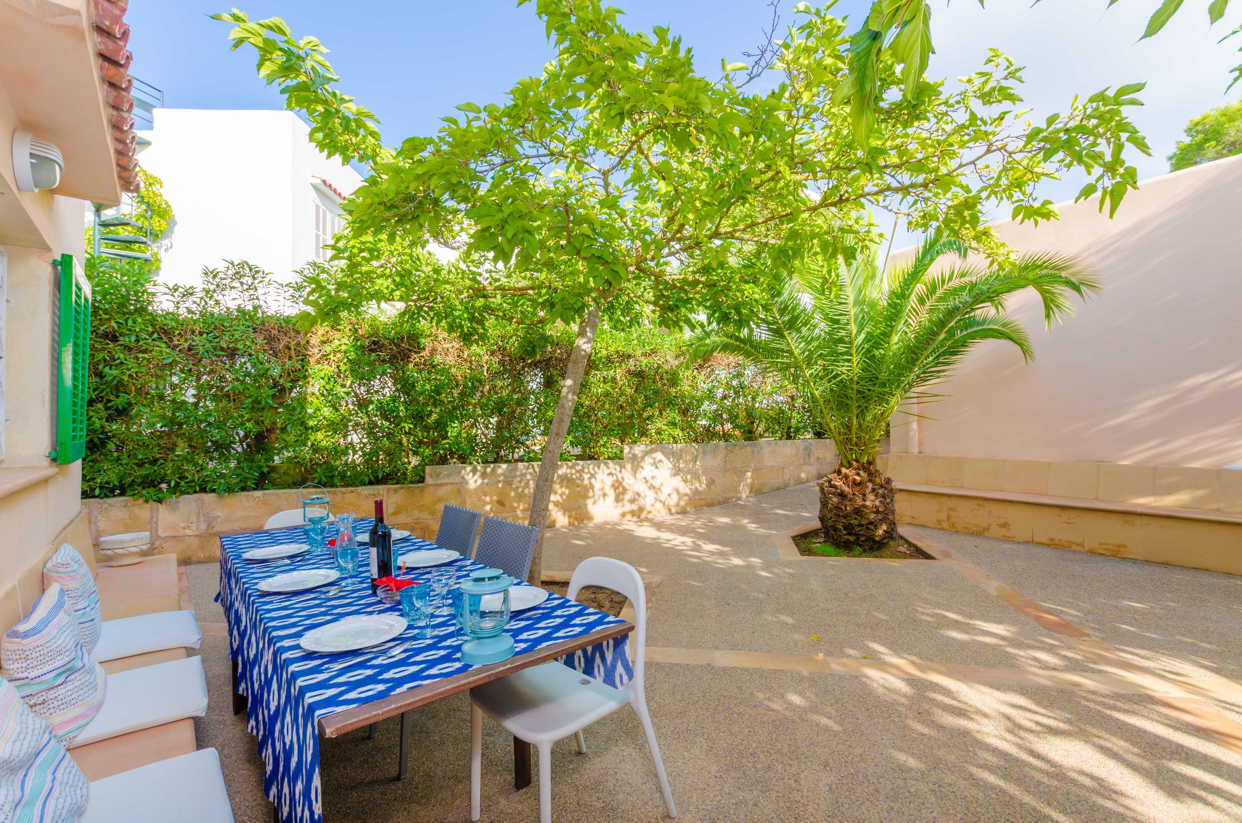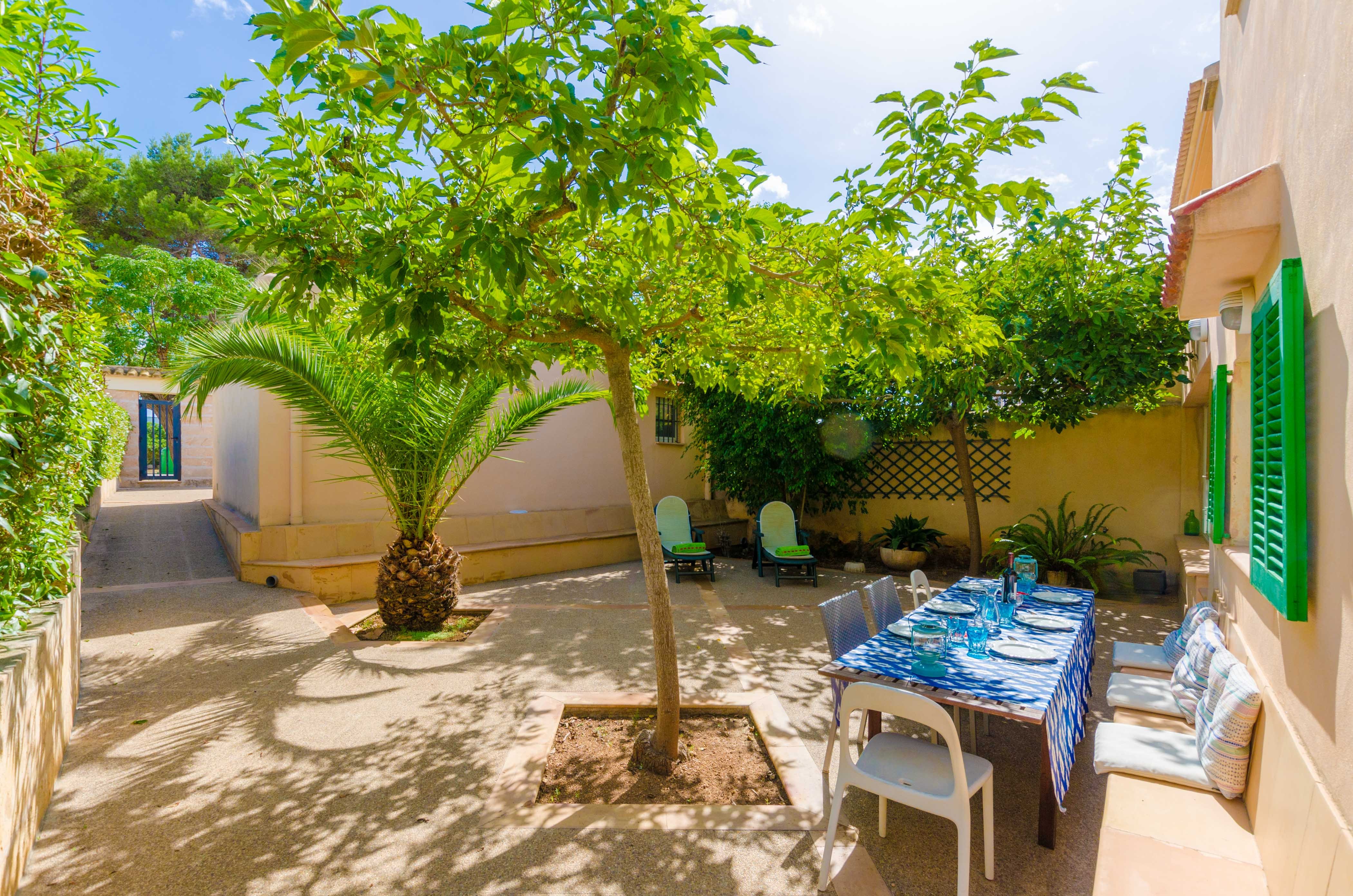 Una gran belleza y mucha vivacidad ofrece el verde y frondoso jardín de esta casa. Se convierte en un acogedor y fresco espacio donde disfrutar del sol, tumbándose simplemente sobre una toalla o mientras juegan con los pequeños de la familia si les acompañan. También es un lindo paisaje para acompañarles y relajarles durante un rico desayuno o la lectura de una buena guía de Mallorca. Por otro lado, un patio interior es perfecto para una exquisita comida o cena, preparada por supuesto en la barbacoa, después de un ajetreado día de playa y una ducha al aire libre.