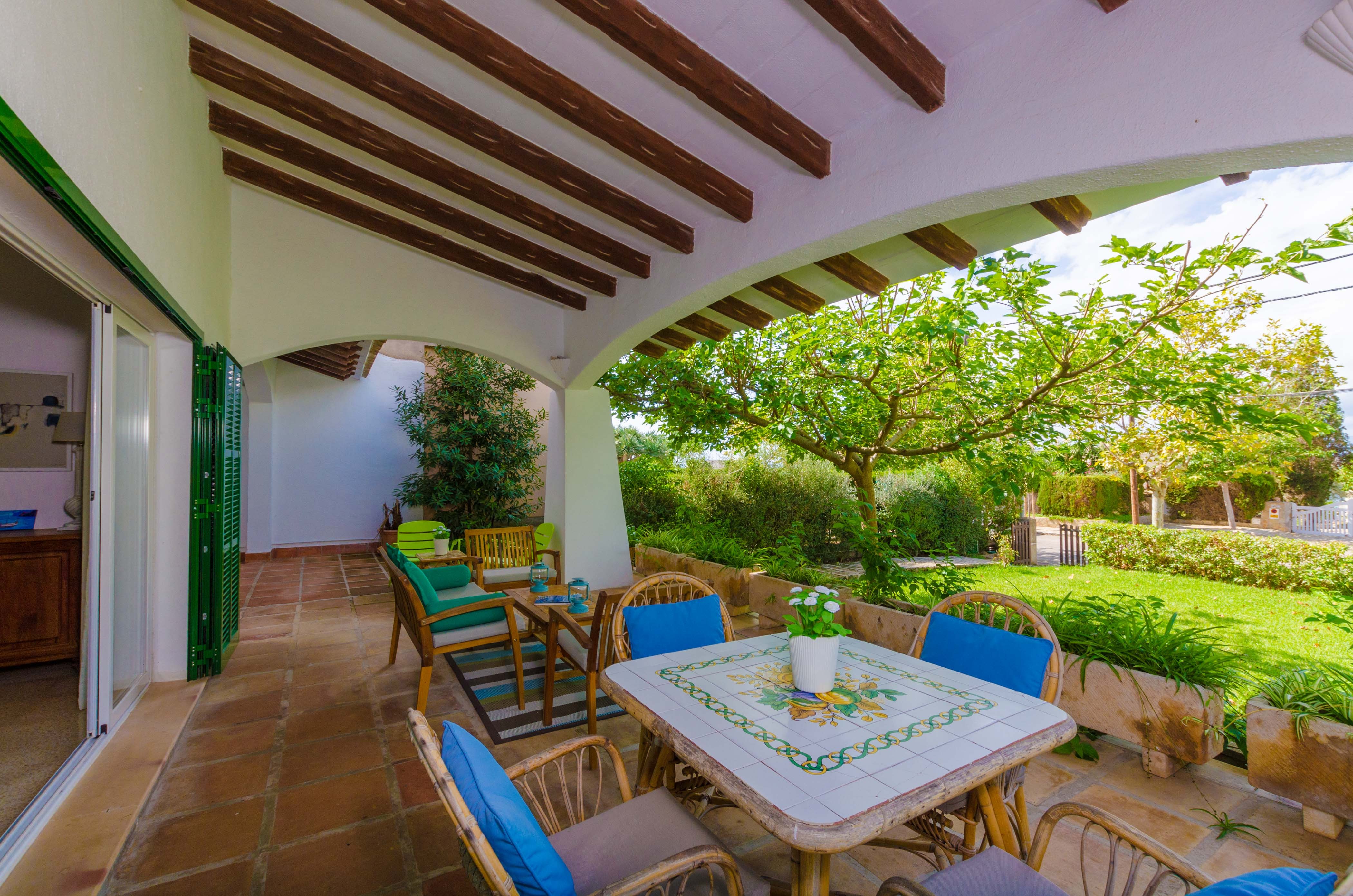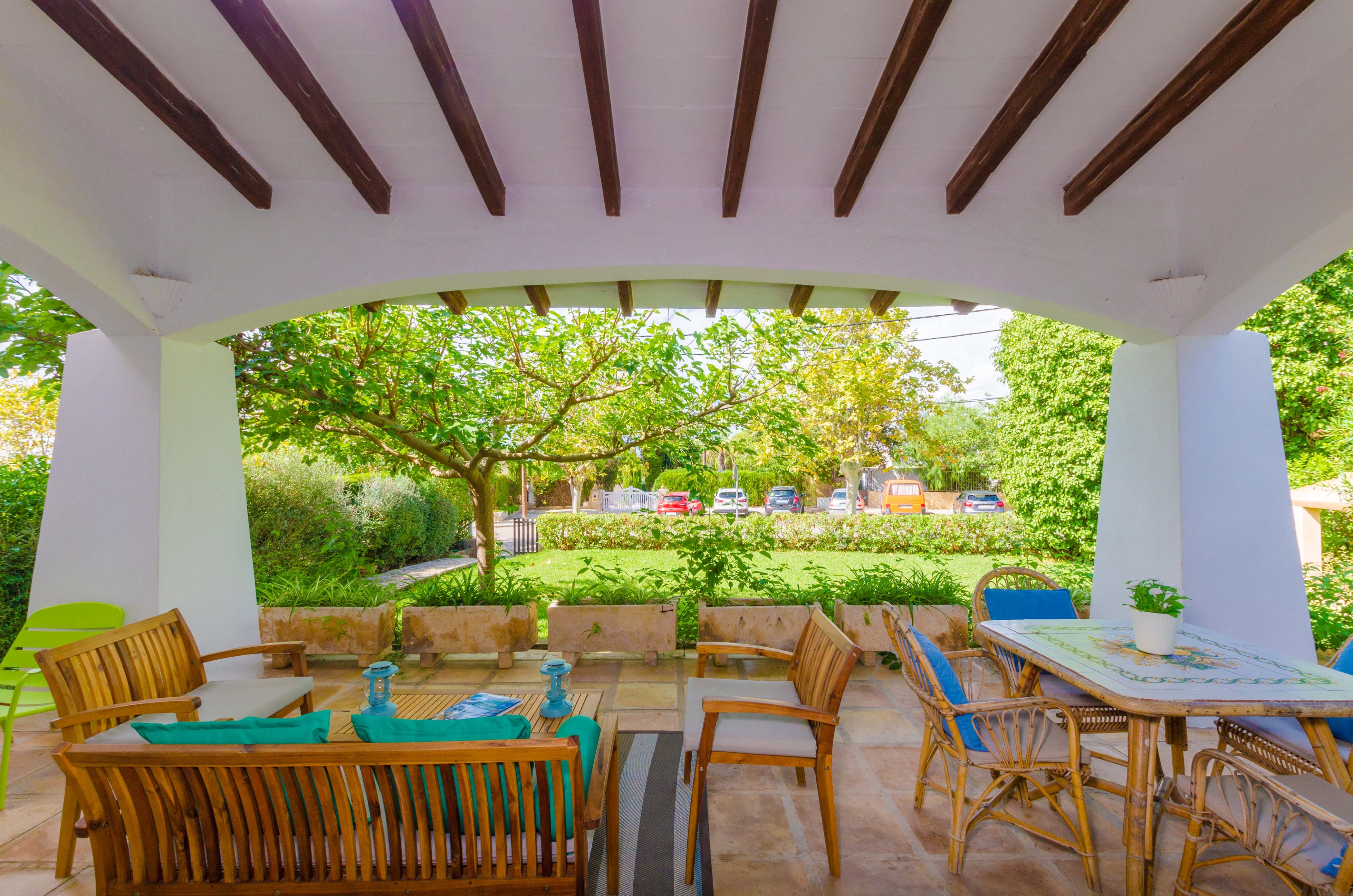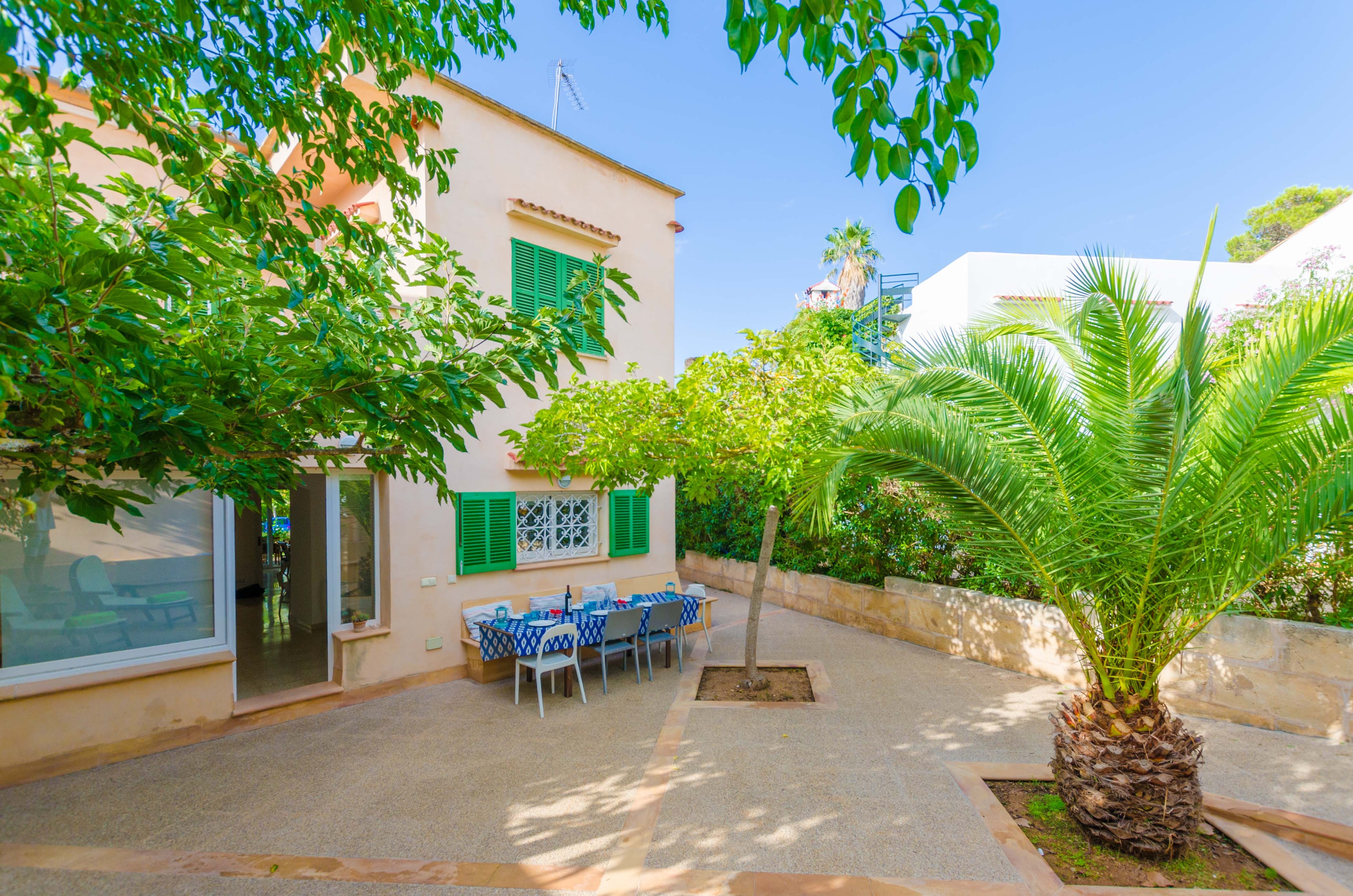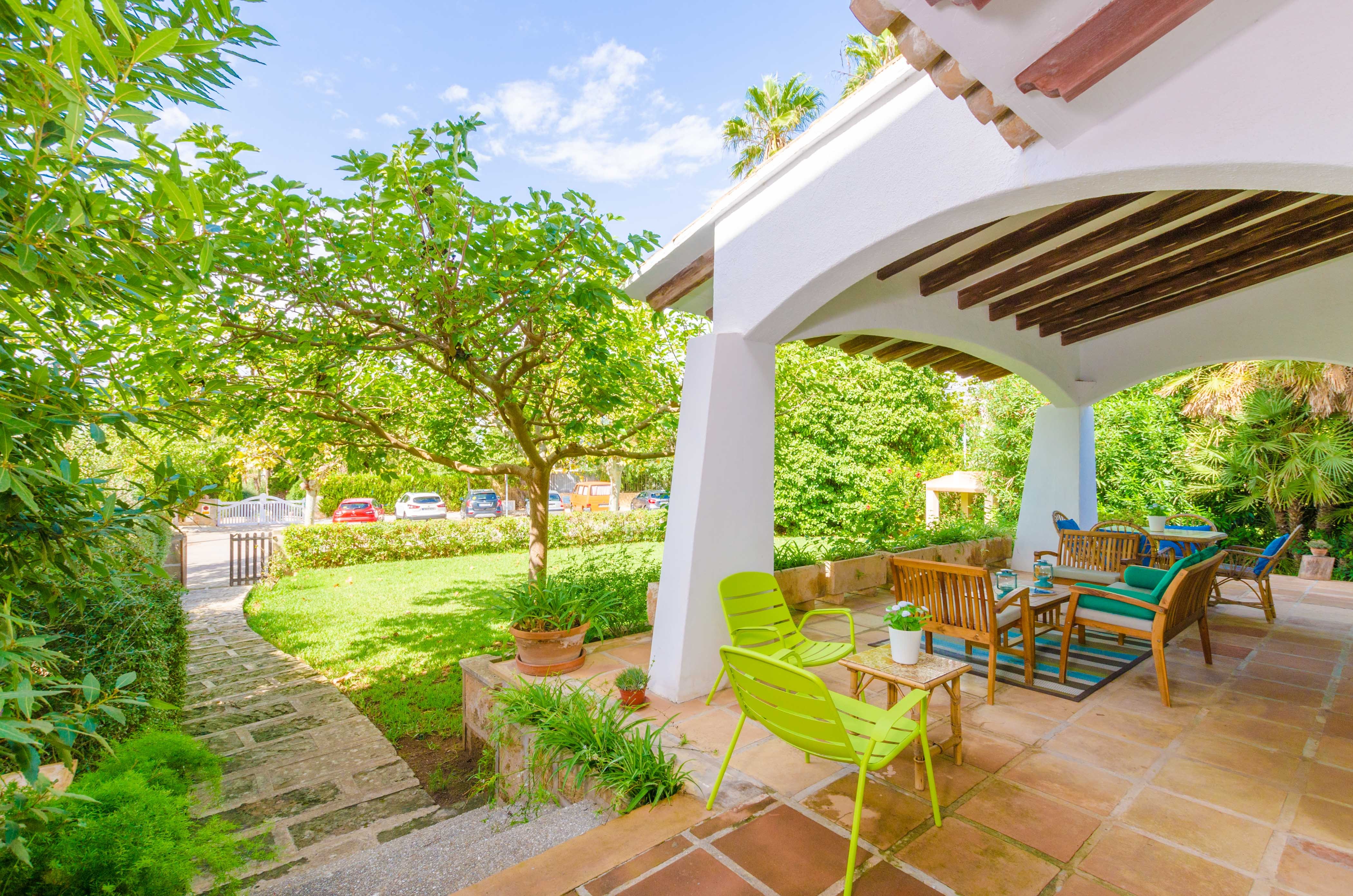 Una gran belleza y mucha vivacidad ofrece el verde y frondoso jardín de esta casa. Se convierte en un acogedor y fresco espacio donde disfrutar del sol, tumbándose simplemente sobre una toalla o mientras juegan con los pequeños de la familia si les acompañan. También es un lindo paisaje para acompañarles y relajarles durante un rico desayuno o la lectura de una buena guía de Mallorca. Por otro lado, un patio interior es perfecto para una exquisita comida o cena, preparada por supuesto en la barbacoa, después de un ajetreado día de playa y una ducha al aire libre.
