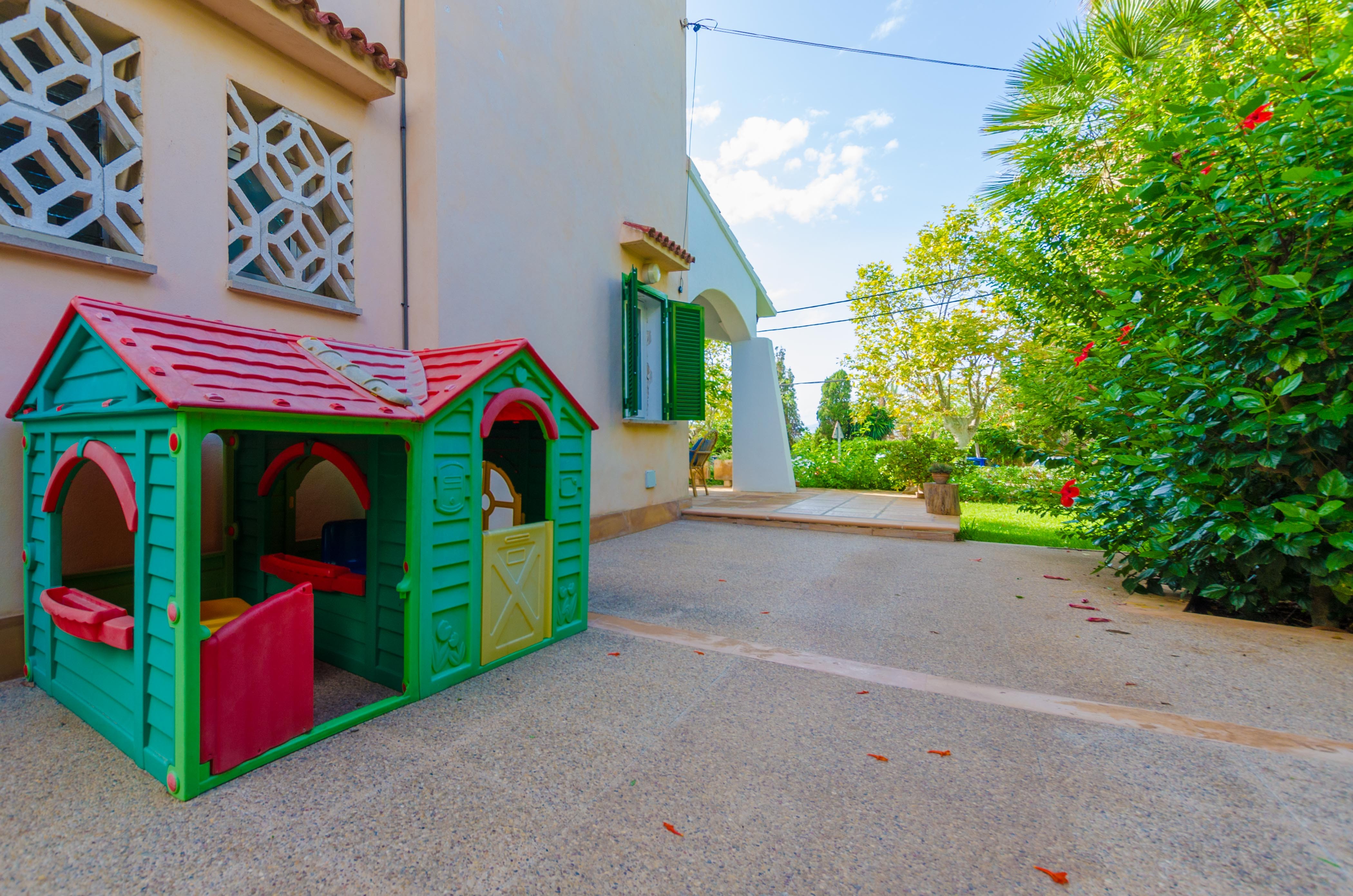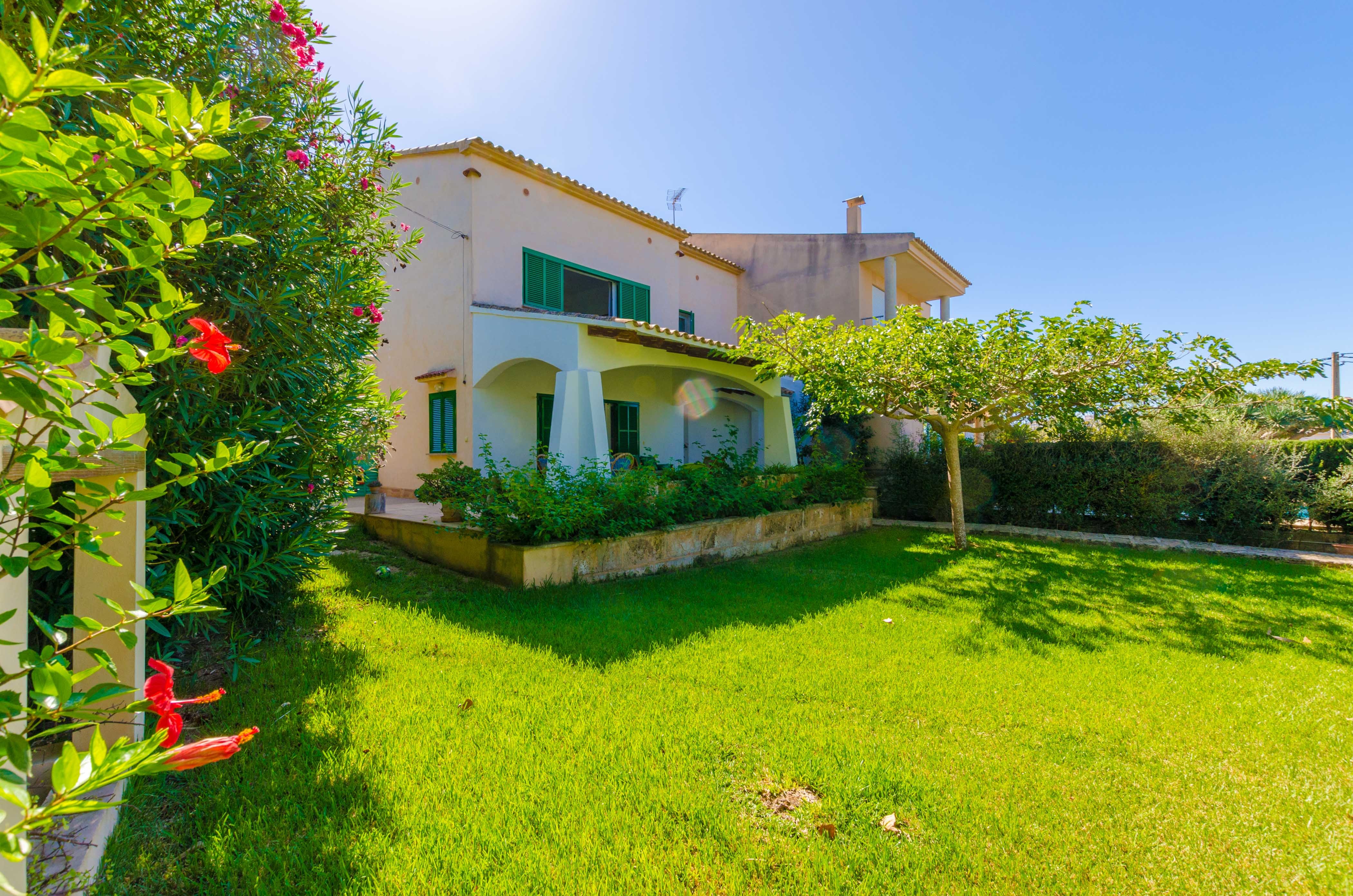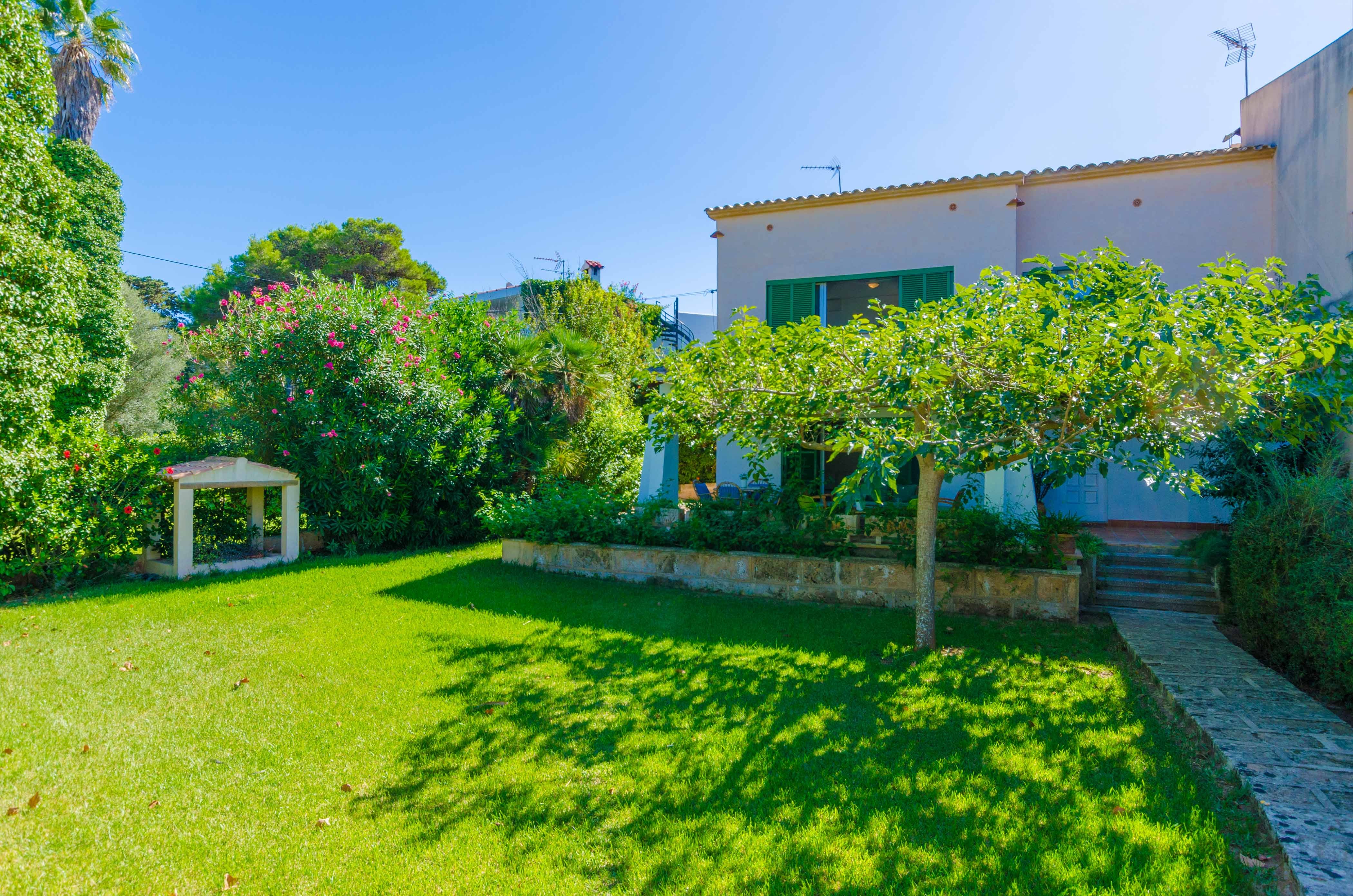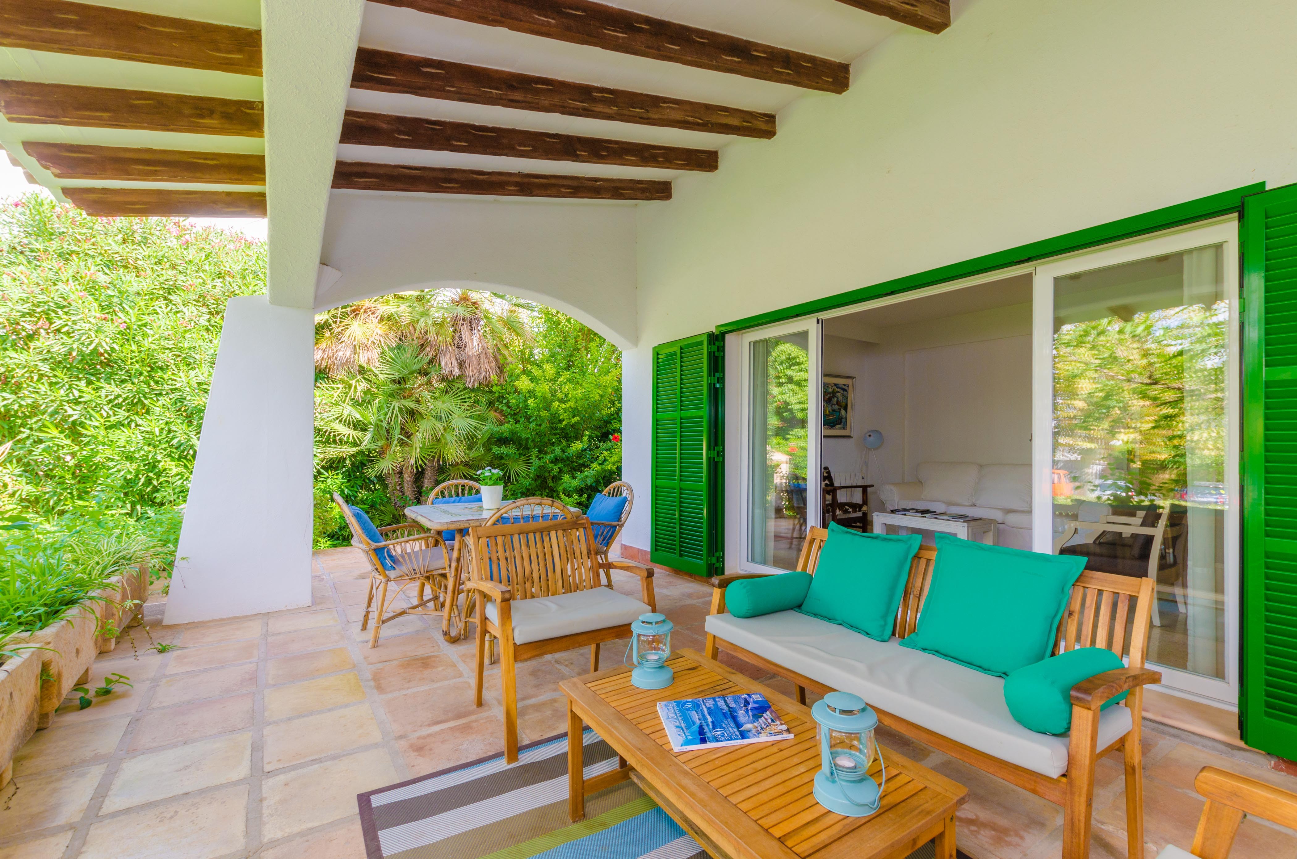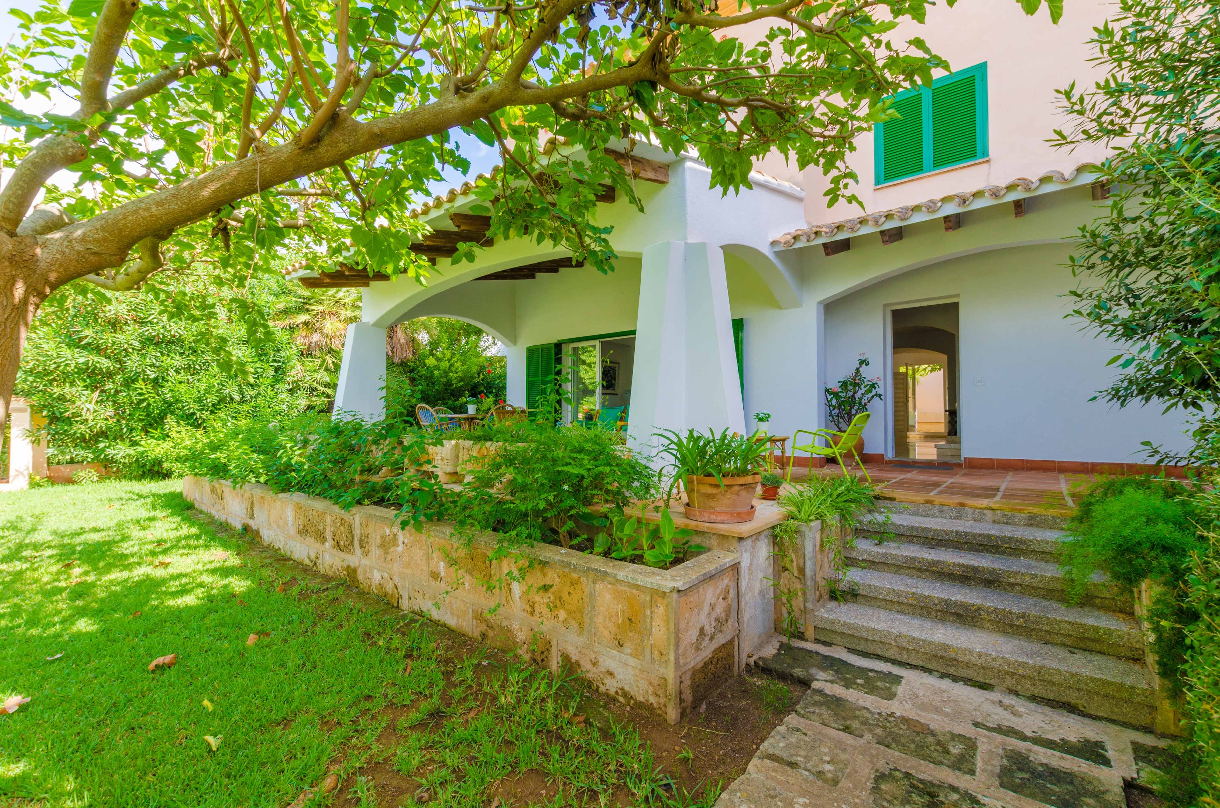 Una gran belleza y mucha vivacidad ofrece el verde y frondoso jardín de esta casa. Se convierte en un acogedor y fresco espacio donde disfrutar del sol, tumbándose simplemente sobre una toalla o mientras juegan con los pequeños de la familia si les acompañan. También es un lindo paisaje para acompañarles y relajarles durante un rico desayuno o la lectura de una buena guía de Mallorca. Por otro lado, un patio interior es perfecto para una exquisita comida o cena, preparada por supuesto en la barbacoa, después de un ajetreado día de playa y una ducha al aire libre.