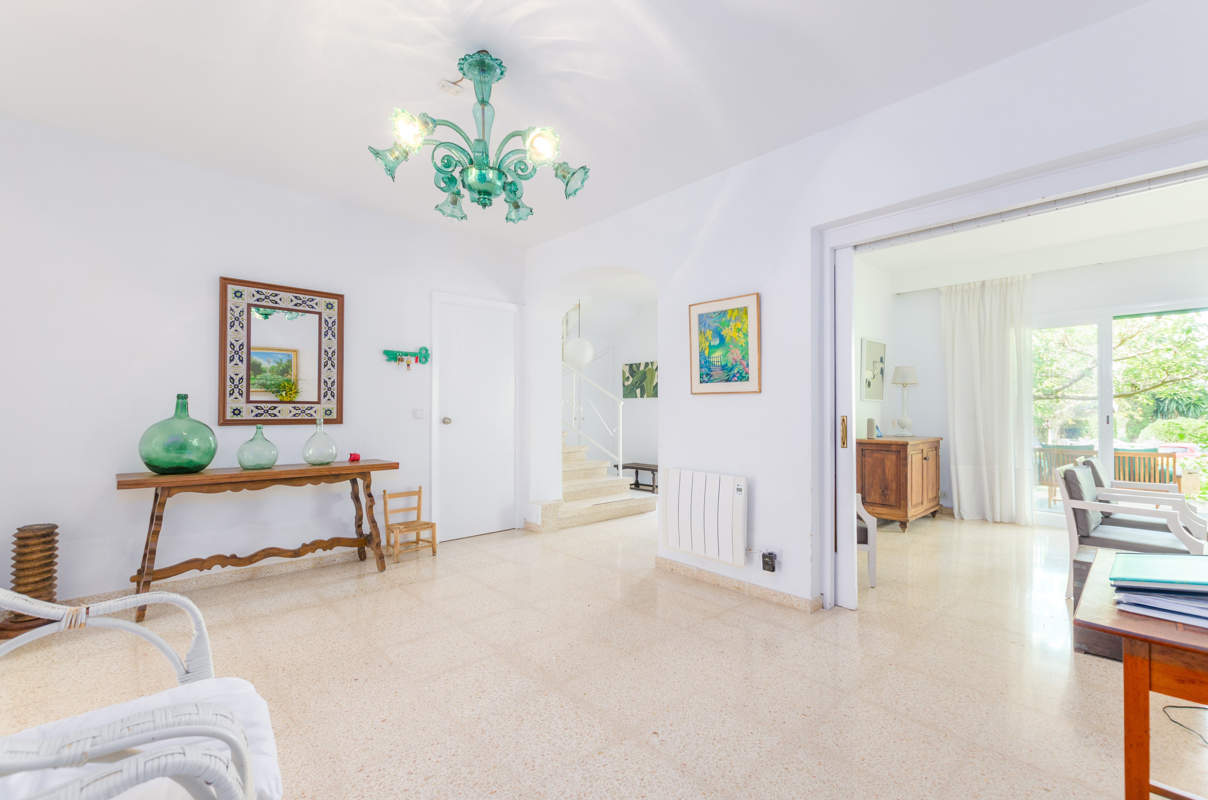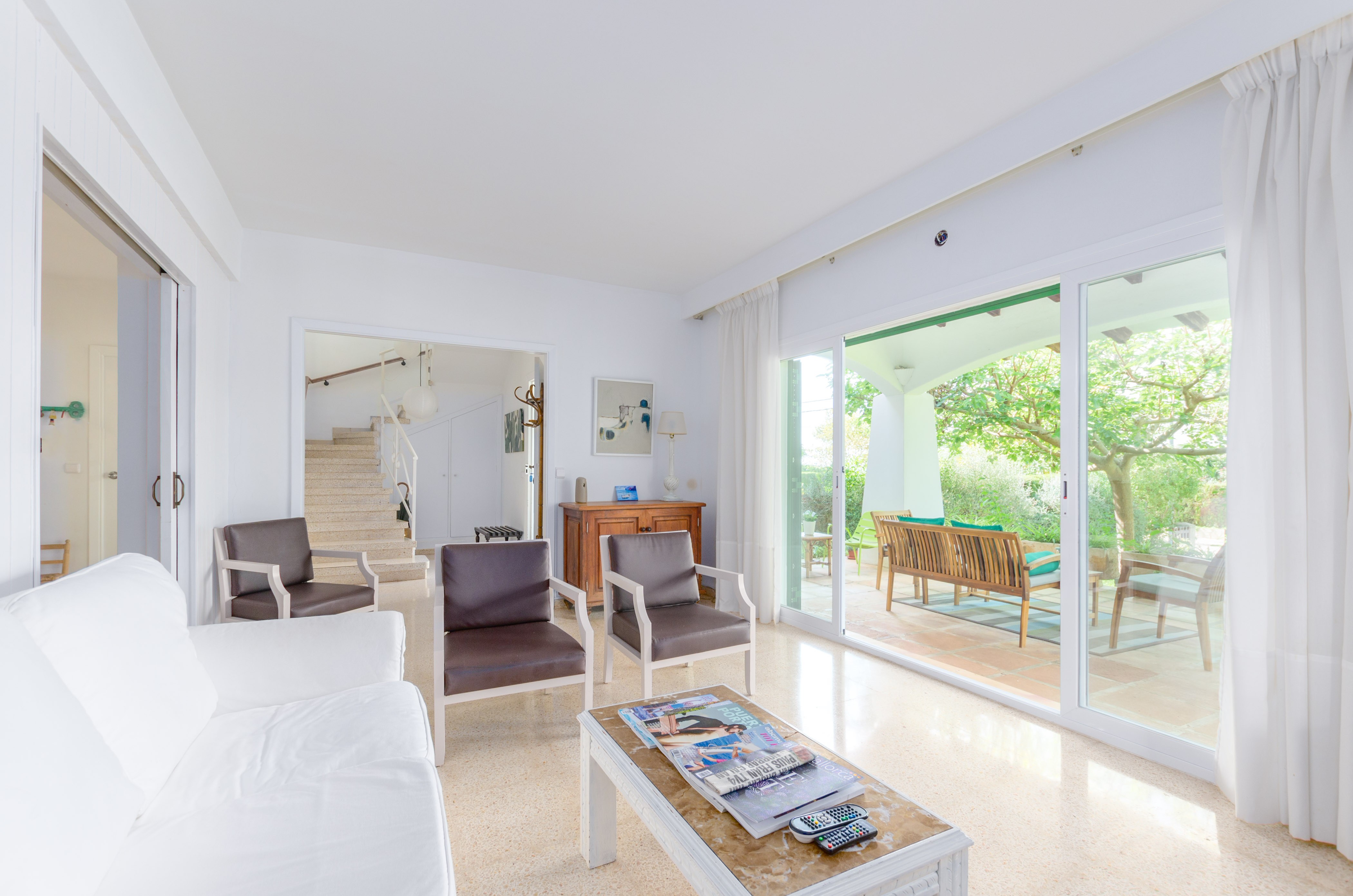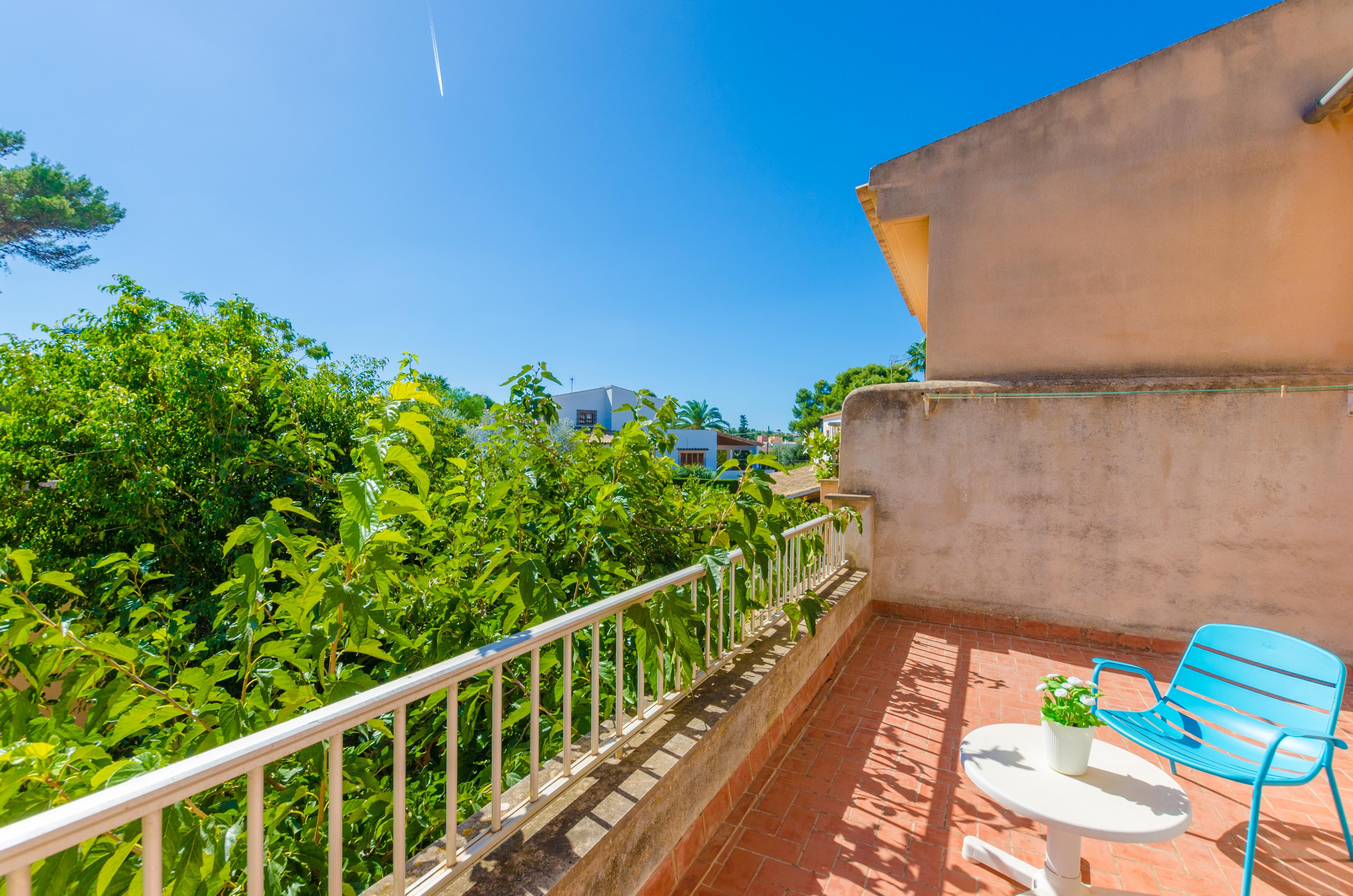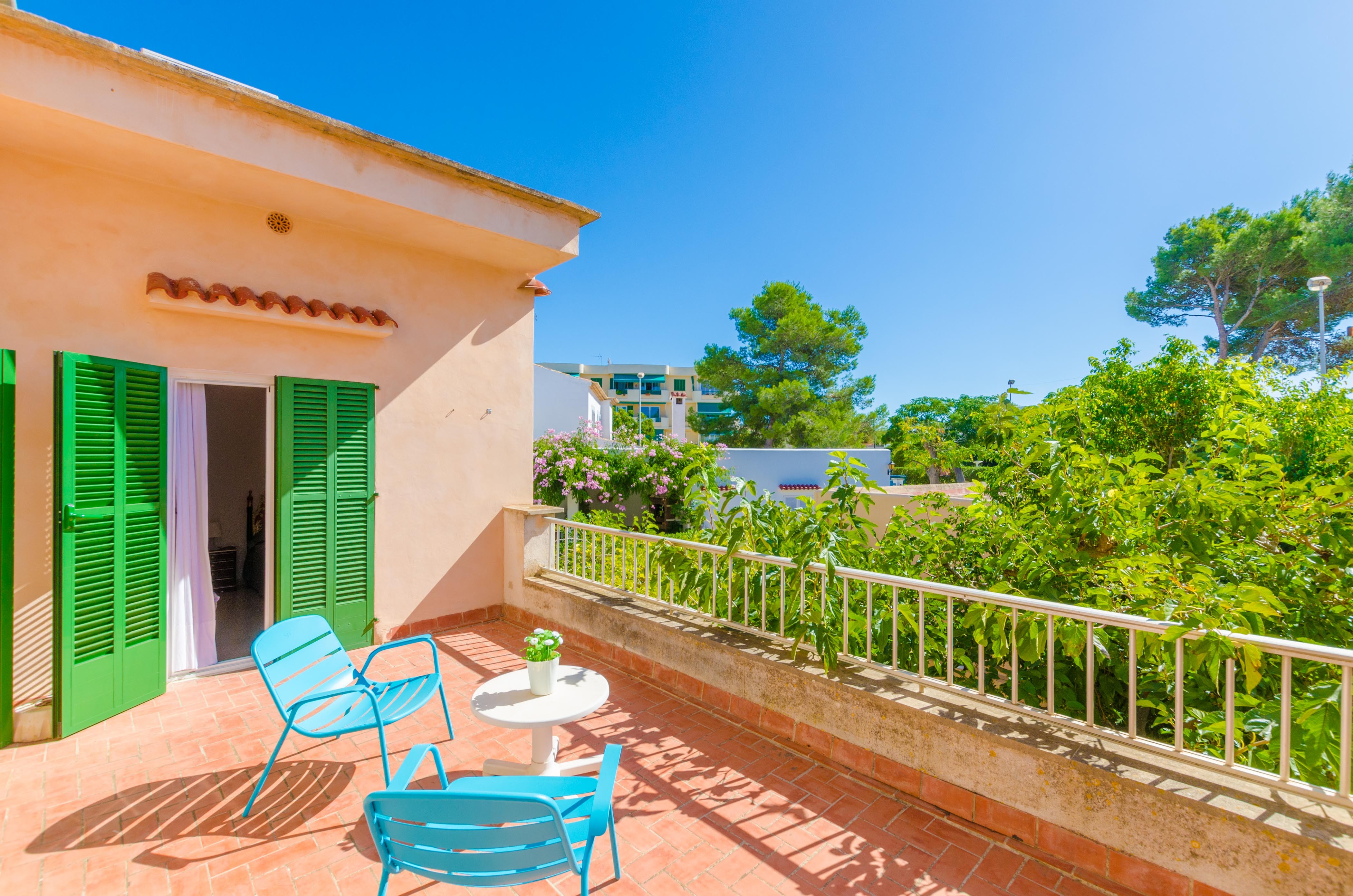 Una gran belleza y mucha vivacidad ofrece el verde y frondoso jardín de esta casa. Se convierte en un acogedor y fresco espacio donde disfrutar del sol, tumbándose simplemente sobre una toalla o mientras juegan con los pequeños de la familia si les acompañan. También es un lindo paisaje para acompañarles y relajarles durante un rico desayuno o la lectura de una buena guía de Mallorca. Por otro lado, un patio interior es perfecto para una exquisita comida o cena, preparada por supuesto en la barbacoa, después de un ajetreado día de playa y una ducha al aire libre.