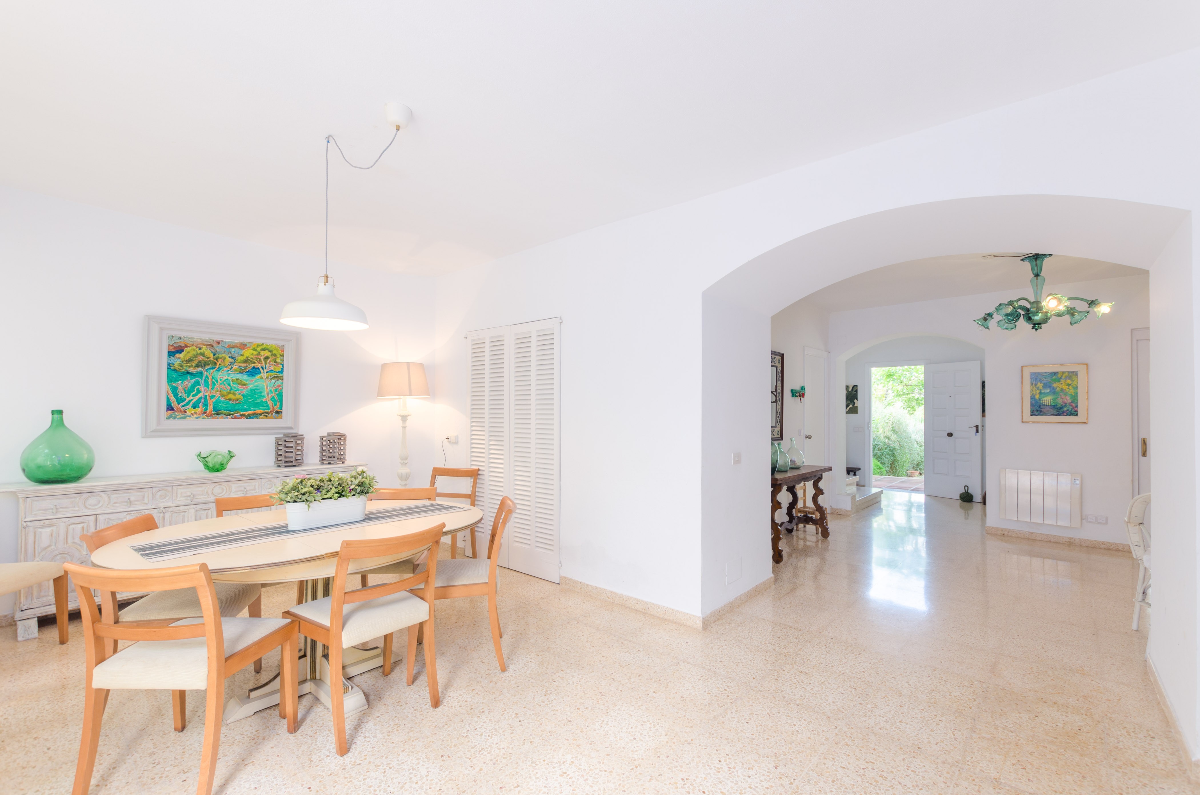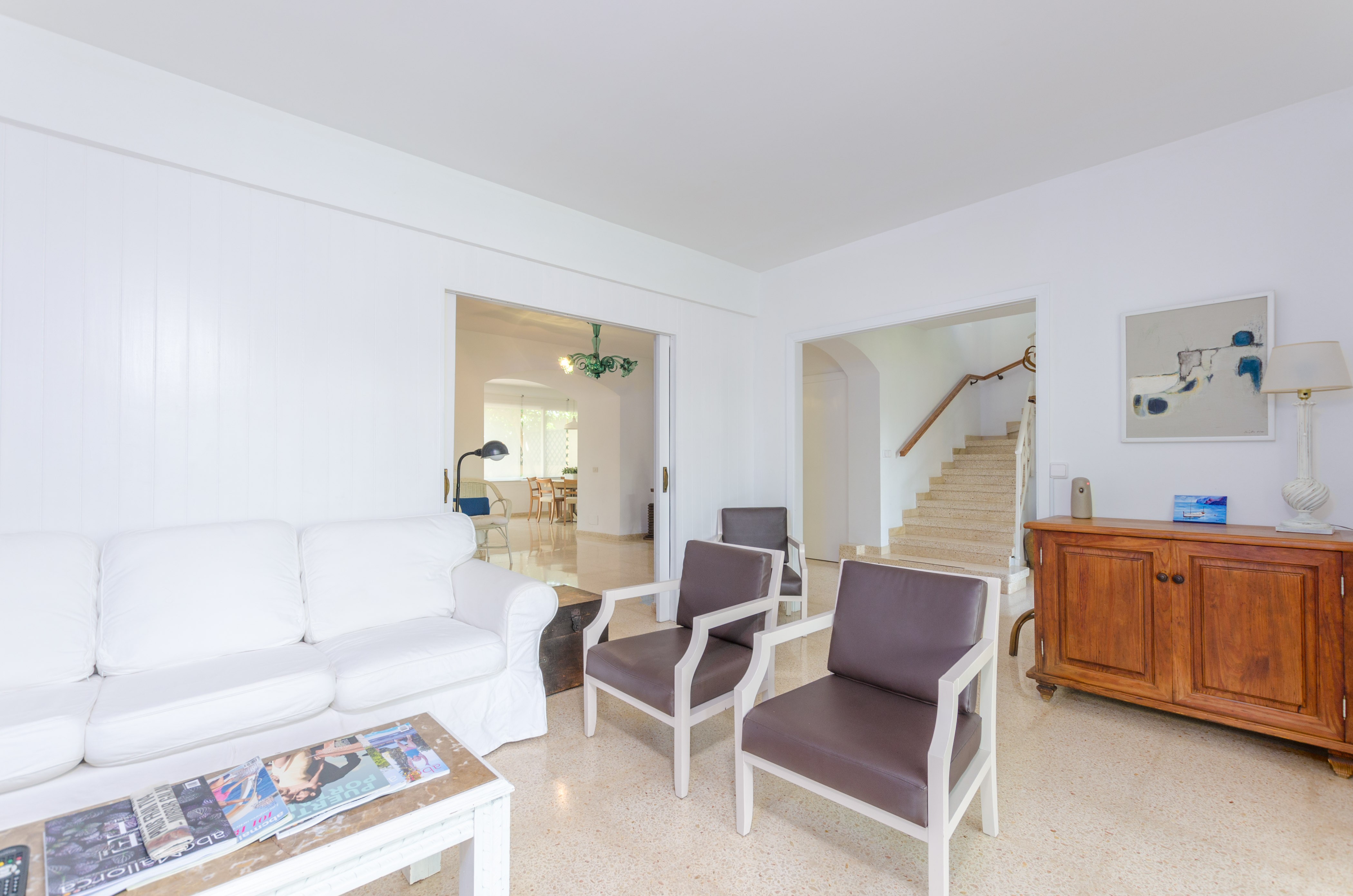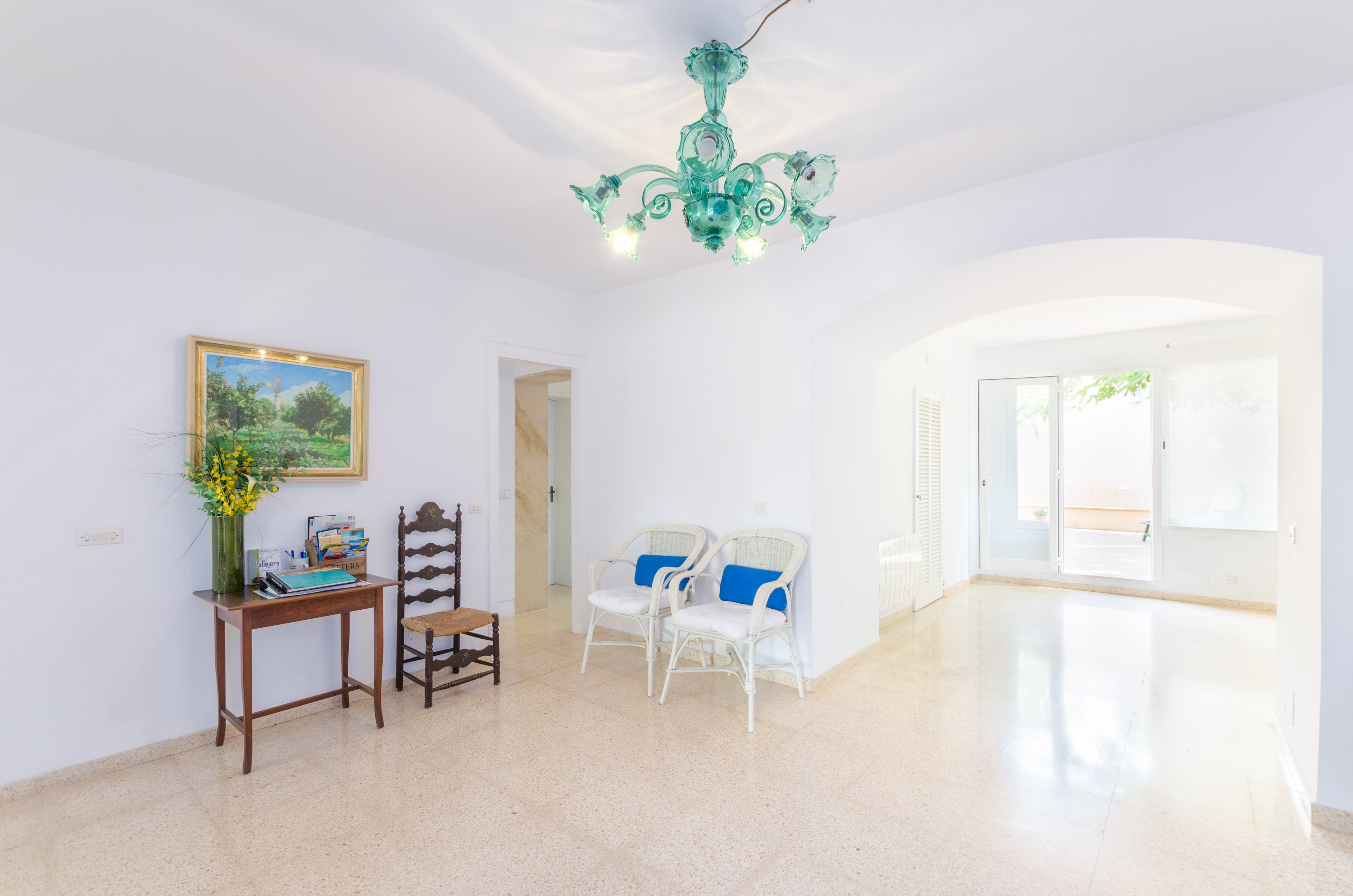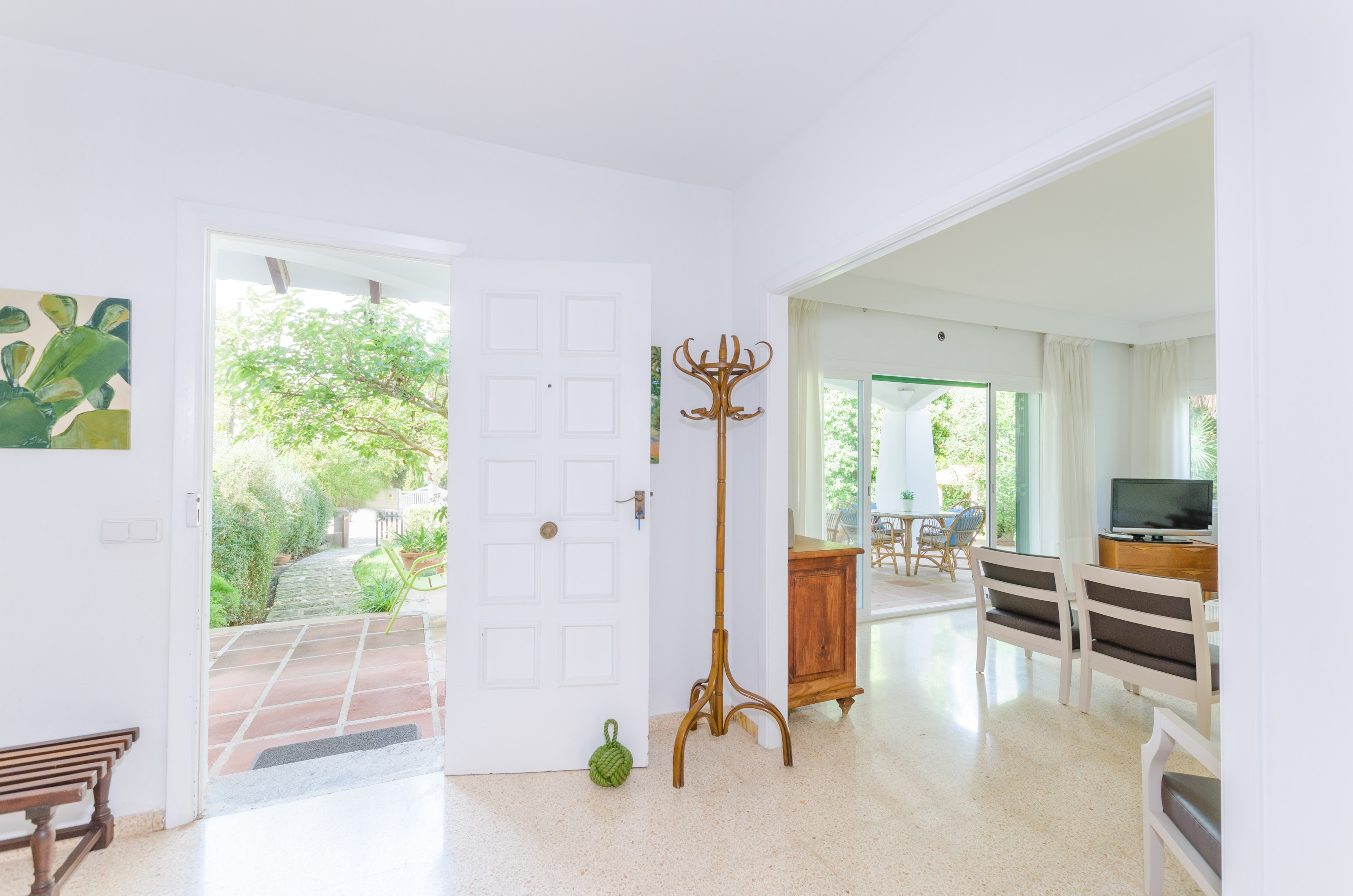 Una gran belleza y mucha vivacidad ofrece el verde y frondoso jardín de esta casa. Se convierte en un acogedor y fresco espacio donde disfrutar del sol, tumbándose simplemente sobre una toalla o mientras juegan con los pequeños de la familia si les acompañan. También es un lindo paisaje para acompañarles y relajarles durante un rico desayuno o la lectura de una buena guía de Mallorca. Por otro lado, un patio interior es perfecto para una exquisita comida o cena, preparada por supuesto en la barbacoa, después de un ajetreado día de playa y una ducha al aire libre.