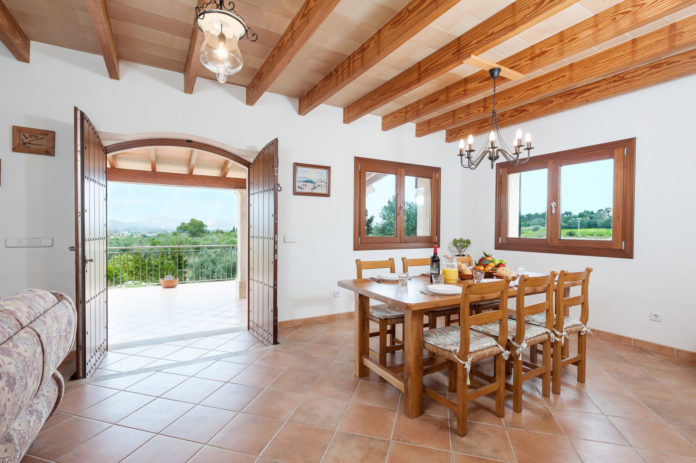 Fantástica casa de 2 plantas situada sobre una pequeña colina, por lo que cuenta con unas vistas privilegiadas al campo y a las montañas. Se sitúa en Alcudia y en ella se pueden alojar de 6 a 7 personas cómodamente.