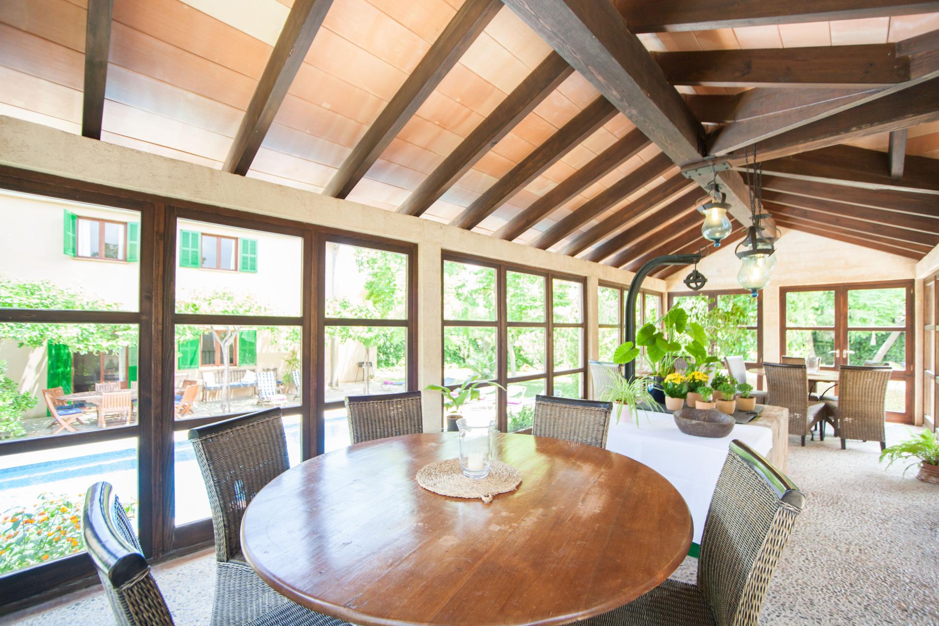 La propiedad se divide en 3 edificaciones. En la casa principal encuentran un bonito estilo tradicional en estancias amplias y luminosas, situadas todas en la planta baja. Descansen en uno de los sillones del salón mientras ven la TV satélite. En un segundo salón también podrán descansar en el sofá o disfrutar de la lectura. Hay dos bonitos comedores, uno en el interior de estilo tradicional y muy original, y el otro en la zona del winter garden con vistas al jardín y a la piscina. La cocina, de gas y en el mismo estilo rústico actual del resto de la casa, es ideal para preparar guisos para la familia o acompañantes. Un baño con ducha da servicio a la casa. Por último, hay 2 dormitorios, con salida al jardín y baño en-suite con ducha, uno con dos camas individuales y otro con cama doble.