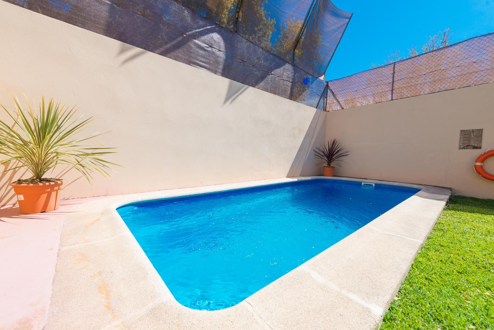 En el patio interior de la vivienda, encuentran un rincón privilegiado formado por un precioso jardín con piscina privada de cloro. Con 5.5 m x 2.4 m y una profundidad de 1.4 m, se convierte en el plan perfecto para un refrescante baño sin tener que salir del pueblo o de desplazarse hasta la playa. Todo un gusto poder nadar en cualquier momento y tumbarse al solecito en cuatro tumbonas o sobre el mismo césped. La terraza del primer piso está perfectamente amueblada para que puedan disfrutar de una rica barbacoa para luego charlar todos juntos en los sofás y sillones de exterior.
