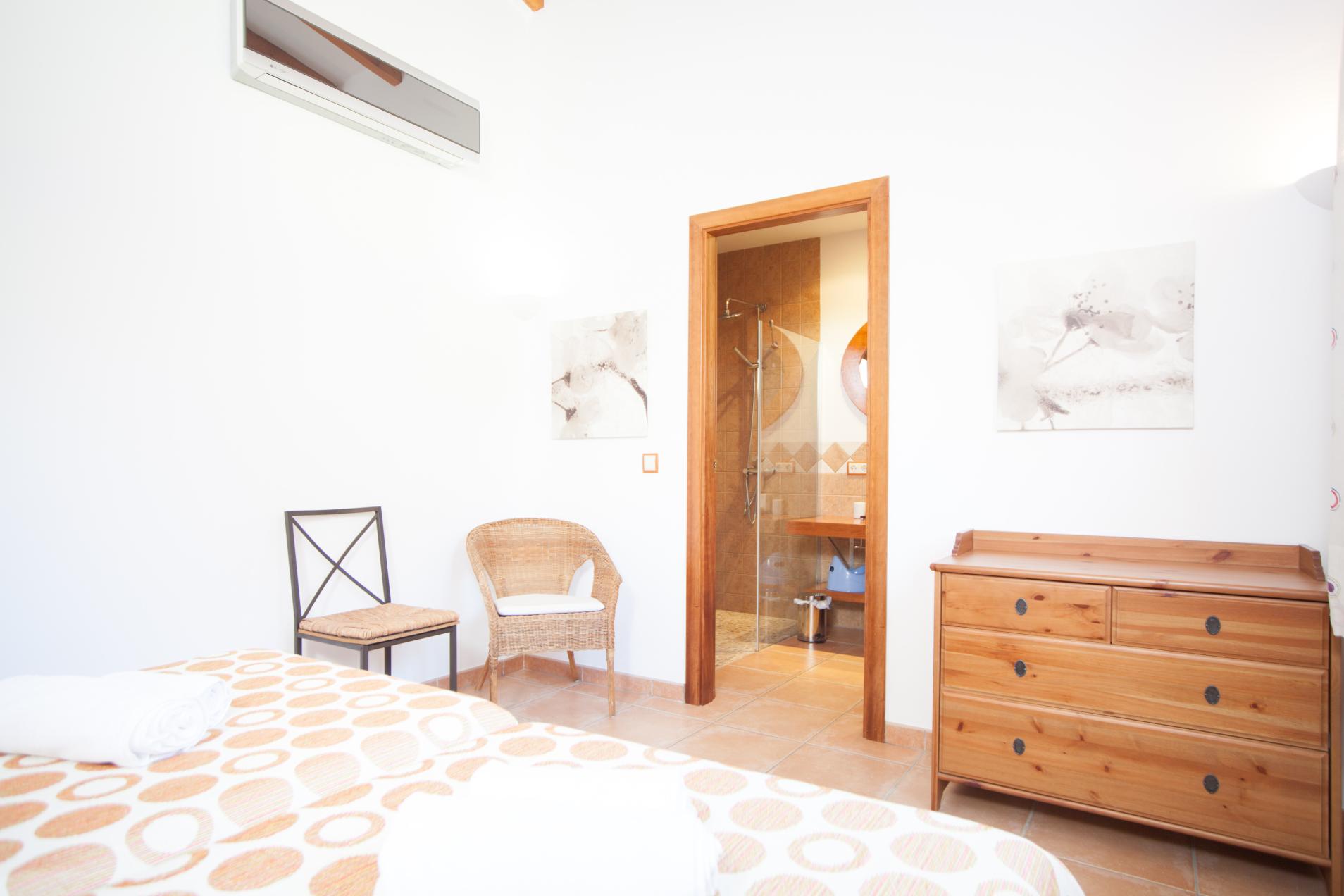 La villa ofrece una atmósfera cálida y de paz en su interior. Siéntense en el gran salón y disfruten leyendo un buen libro, viendo la televisión por satélite o sus películas favoritas en DVD, acompañados del aire acondicionado. La zona de comedor, amueblada con una mesa rústica, es el sitio perfecto para comer con la familia y los amigos. La cocina, abierta a esta sala-comedor a través de un gran arco, tiene todo lo necesario para cocinar como en casa, incluyendo vitrocerámica, horno, microondas y demás. Hay tres habitaciones, todas con armario, aire acondicionado y baño en-suite con ducha y bañera separadas. Una de ellas ofrece dos camas individuales y espacio para alojar una cuna y una trona, mientras que el resto ofrecen una cama de matrimonio. La lavandería es independiente y cuenta con una lavadora, una secadora, tabla de planchar y plancha.