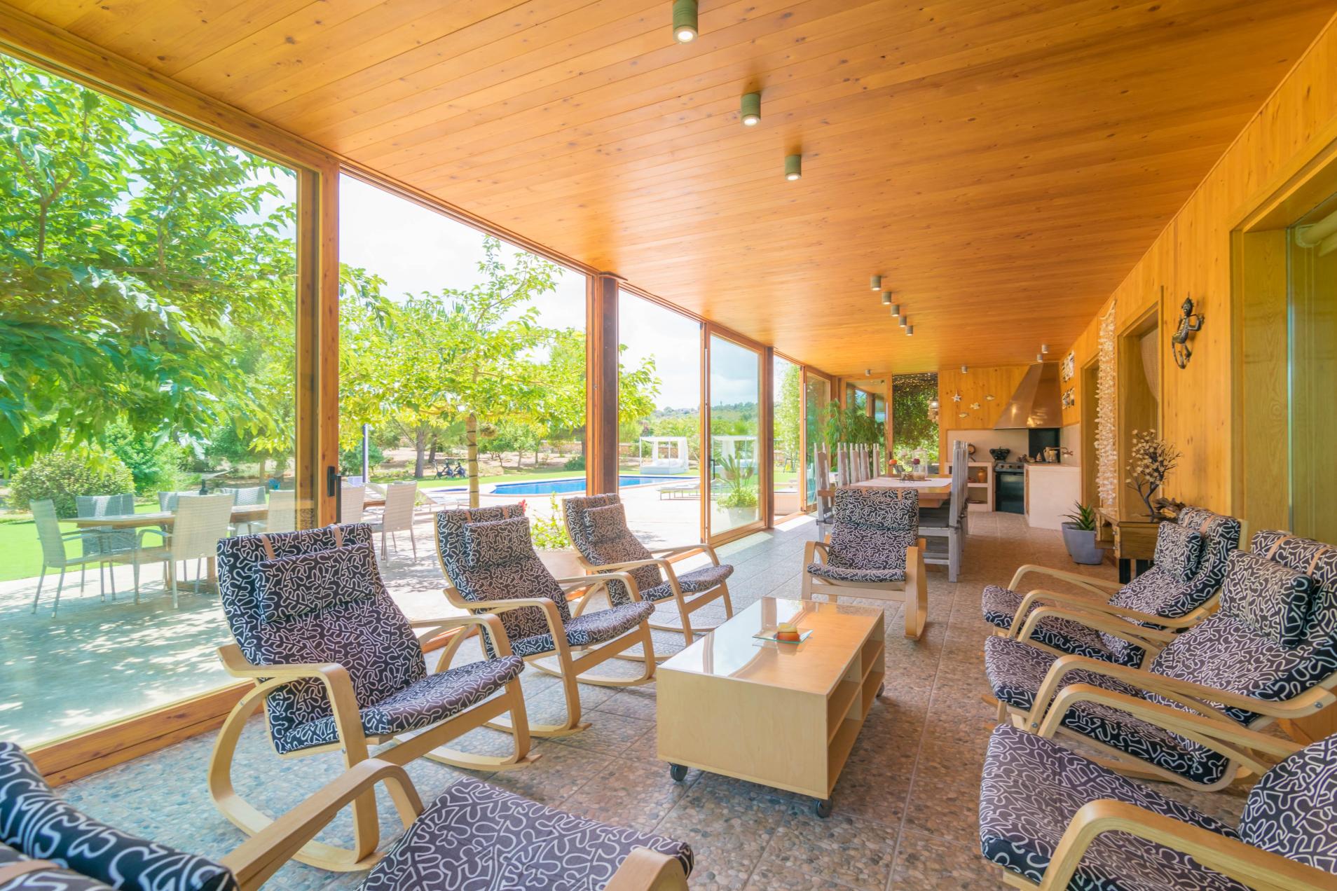 Simplemente accediendo a la finca van a quedar más que asombrados dada su inigualable belleza. Desprende una gran sensación de calma y tranquilidad gracias a la gran extensión de bonito césped artificial que envuelve una construcción de piedra mallorquina absolutamente hermosa. Cada día cuando despierten o bien al caer la tarde, podrán pasear, en total privacidad, no sólo por estas zonas verdes tan bellas, sino también por los 14.000 m2, aproximadamente, de terreno de campo con los que cuenta la finca. Esto les ayudará a relajarse para disfrutar de un agradable día en la piscina de cloro. Tiene un tamaño de 12 x 5.5 m con una profundidad de 1 a 1.8 m, una piscina infantil de 1.20 m de largo con 0.5 m de hondo, así como 10 tumbonas, 2 camas balinesas, una ducha y una gran mesa con sillas a su alrededor. ¡Un verdadero paraíso! También disponen de una mesa de ping-pong y 3 bicicletas.