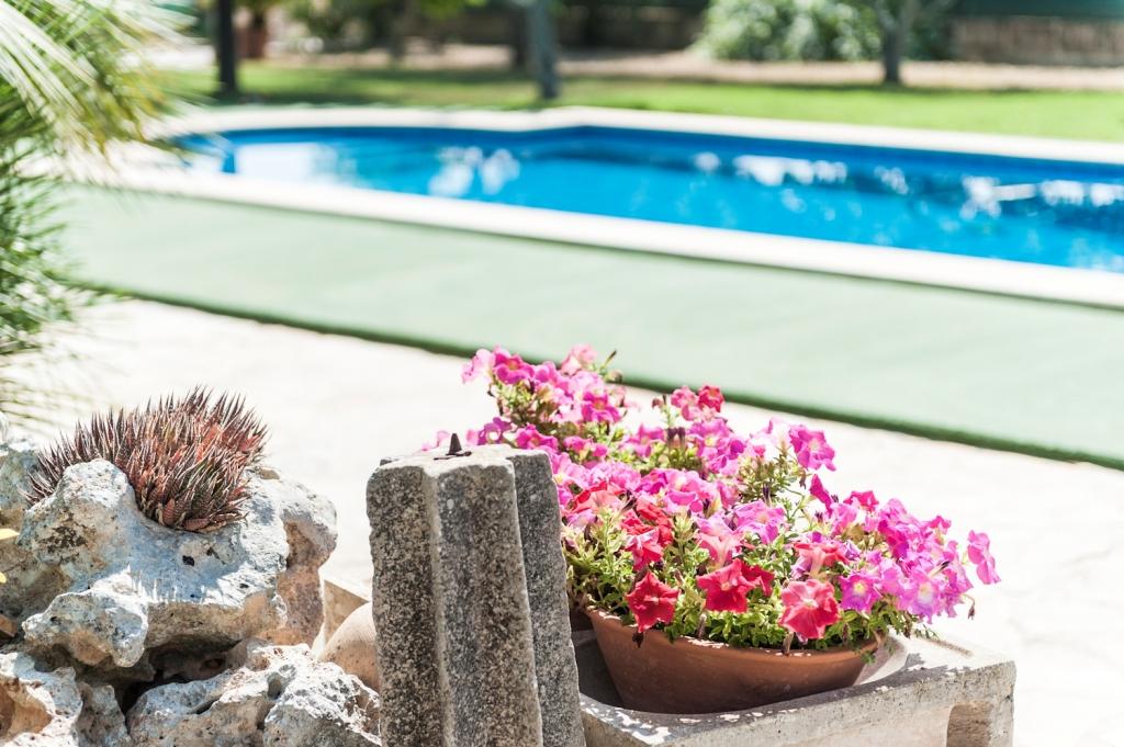 Los exteriores de la casa son muy bonitos. Disfrutad de la espaciosa terraza (70 m2) con sofás y sillones chill-out, haced una barbacoa, desayunad en la mesa admirando la piscina y las vistas del jardín, donde encontraréis diferentes plantas, flores, elementos de decoración y palmeras. Hay una zona con más de 200 m2 de césped donde tumbarse en una de las 6 tumbonas o dejar que los más pequeños disfruten jugando. La piscina, de 9 x 4.5 metros, es de sal. Hay vecinos a menos de 50 metros de la casa pero las instalaciones de la casa son totalmente privadas.