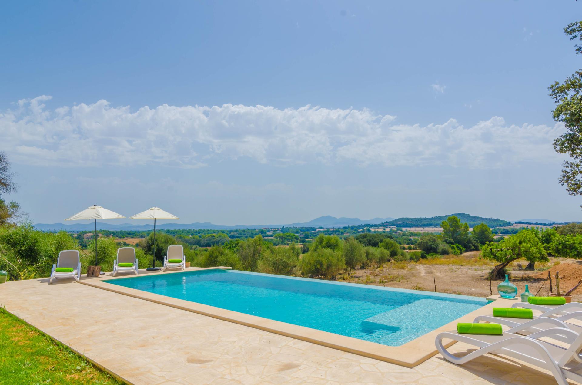 La casa está en una zona tranquila y rodeada de campo en el centro de Mallorca. Durante días de verano, se puede refrescarse en la piscina privad de cloro con un tamaño de 9 metros x 4 metros y una profundidad entre 1 metro y 1.8 metros. Está rodeada por una terraza con seis tumbonas y dos sombrillas, un lugar idóneo para tomar el sol y contemplar las vistas impresionantes. Un gran jardín invita a extender la toalla en el césped o hacer un picnic en familia. En la barbacoa fija puede preparar delicias de la brasa - y luego comer juntos en el porche, equipado con una mesa y suficientes sillas para seis comensales. La parcela está vallada y no hay vecinos directos.