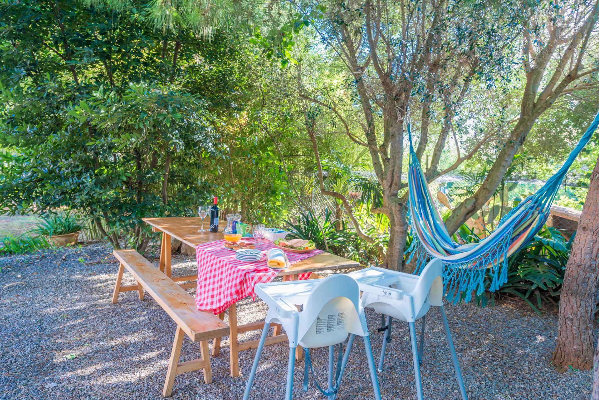 El porche amueblado da acceso a un cómodo salón-comedor con aire acondicionado y televisión satélite, decorado con muchos detalles que dan carácter a esta habitación. Una cocina, típica mallorquina, dispone de una cocina de vitro cerámica y todos los utensilios necesarios para preparar un banquete. La lavandería tiene una lavadora, una plancha y una tabla para planchar.