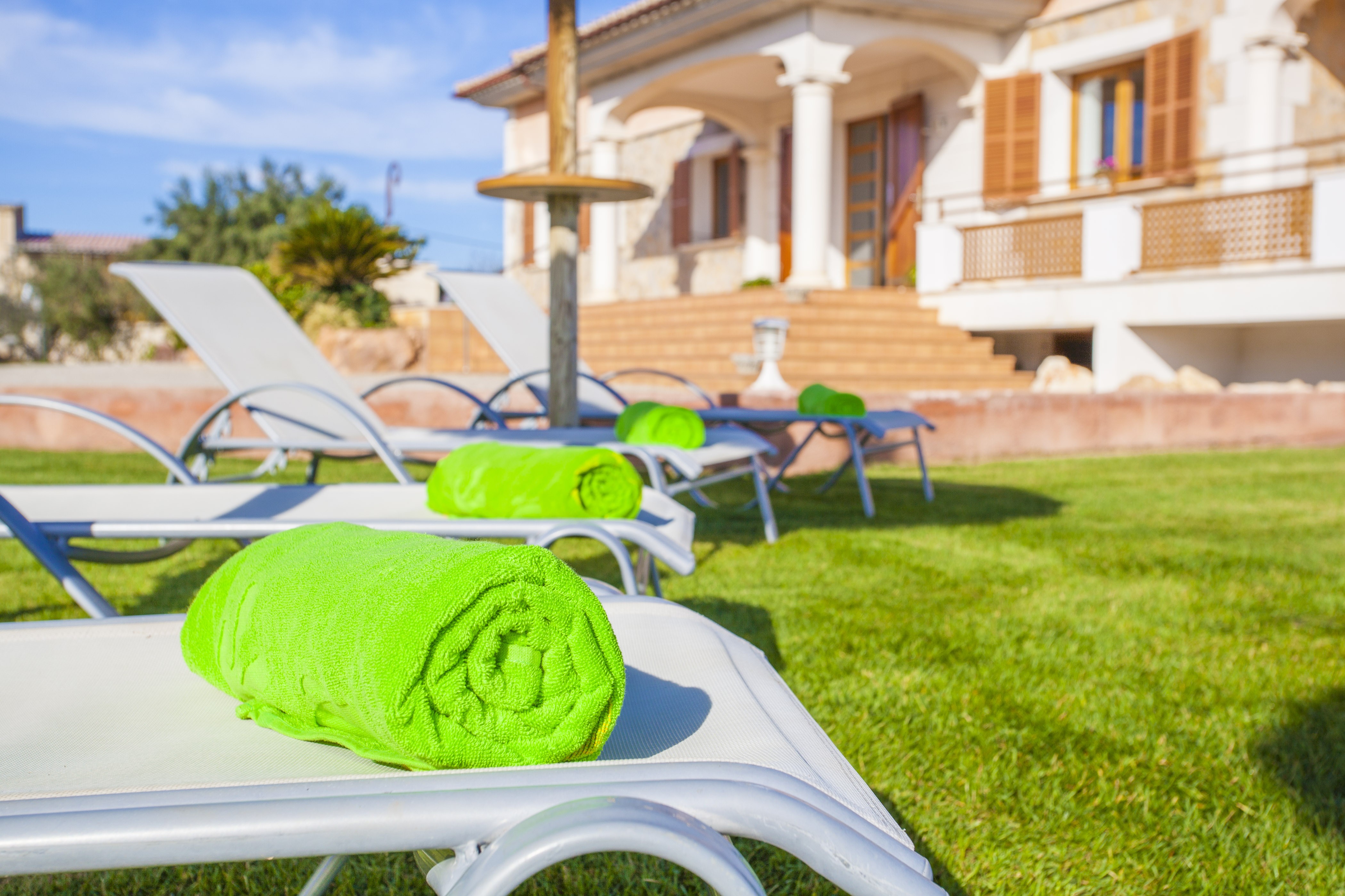 The spacious outdoor area impresses with a 8 x 4m large fresh water pool (water depth of 1 - 1.80 m). The pool is kept clean with chlorine and is surrounded by large lawns ideal for playing with the kids or to relax in the sun. There are sun beds and umbrellas. The house has a furnished porch that can be accessed via a few steps, making it the ideal place for dining outdoors and BBQ meals. The property is fenced and you have neighbours.