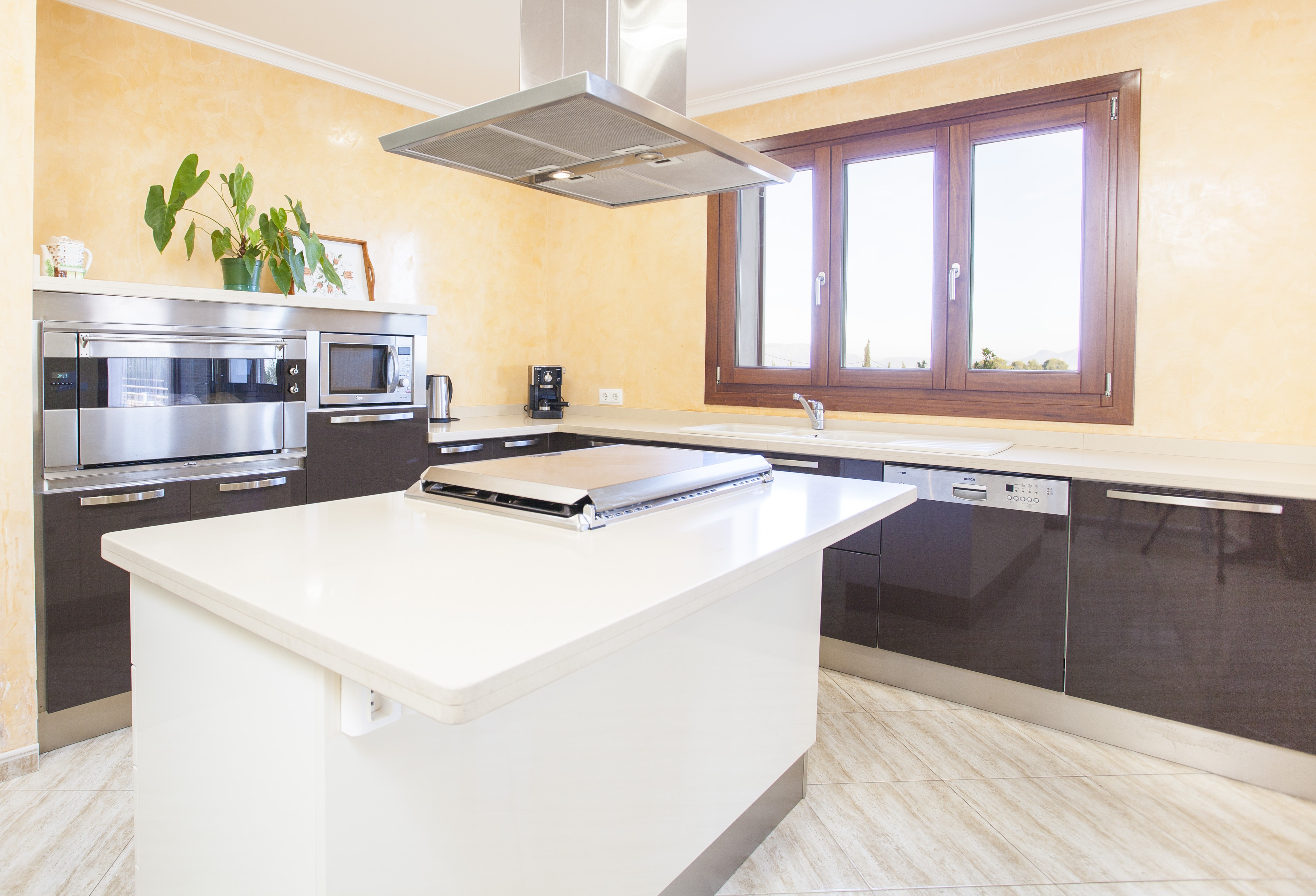 On only one floor there are about 200m2. The air - conditioned living - dining area is harmoniously designed and furnished with comfortable sofas, satellite TV (German channels only) and dining table for 6 people. The large kitchen is equipped with: gas stove, electric oven, dishwasher, microwave and much more. The dining table placed here is ideal for a hearty breakfast or coffee in the afternoon. Of course there is also a washing machine, ironing board and iron.