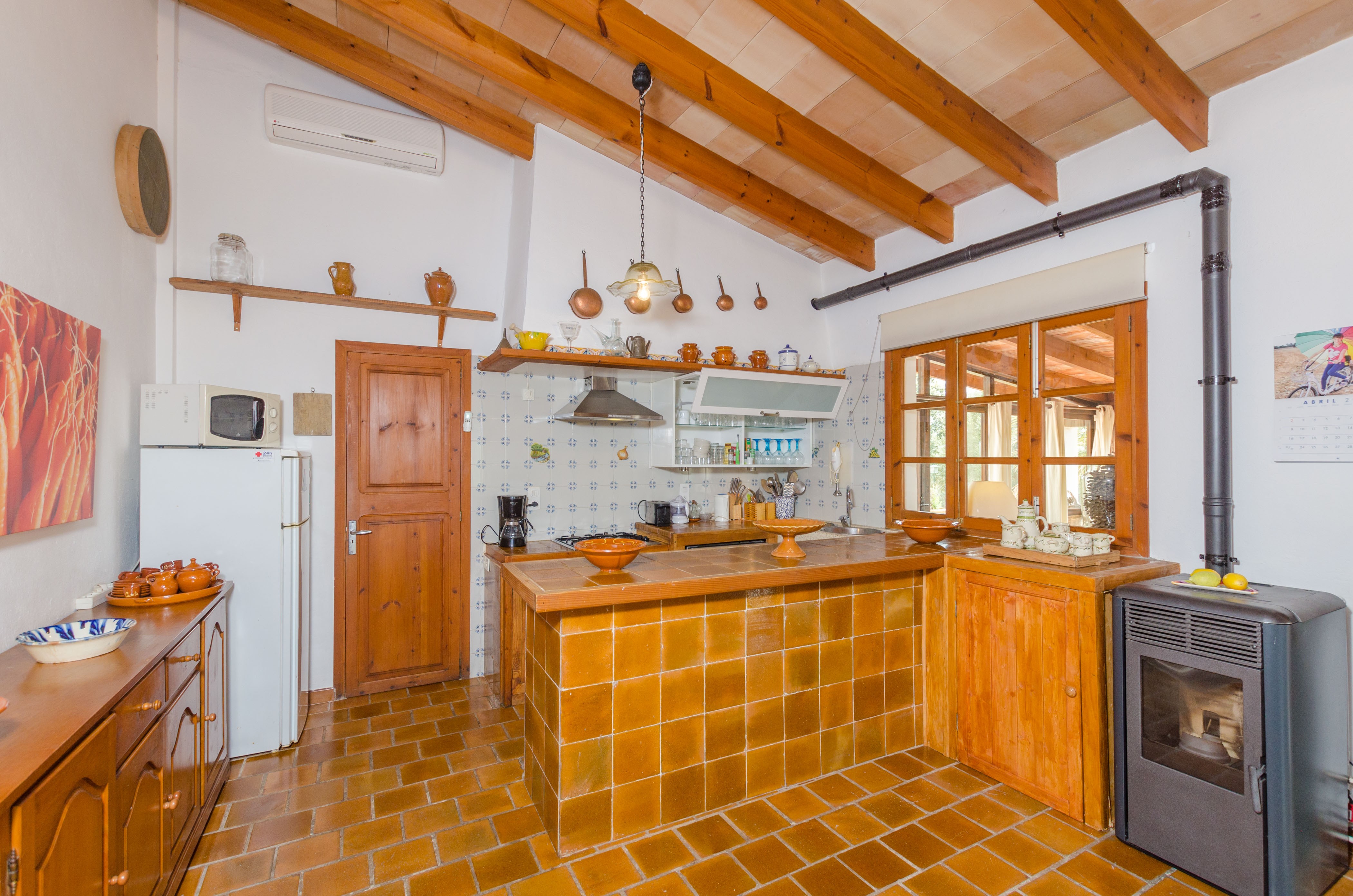The idyllic front porch offers fantastic panoramic views over the town and the countryside. Enter in the ample living room which is equipped with two comfortable sofas and a chimney. Take a nap on the sofa, watch TV (Satellite) or listen to music. There is also an ai conditioning unit in the living room. The open-plan kitchen counts with everything you will need for your holidays: a toaster, microwave, food blender, dishwasher, gas hob and oven, a fridge and much more. Of course there is also a washing machine, an iron and ironing board. Pets are welcome upon request – please ask before.