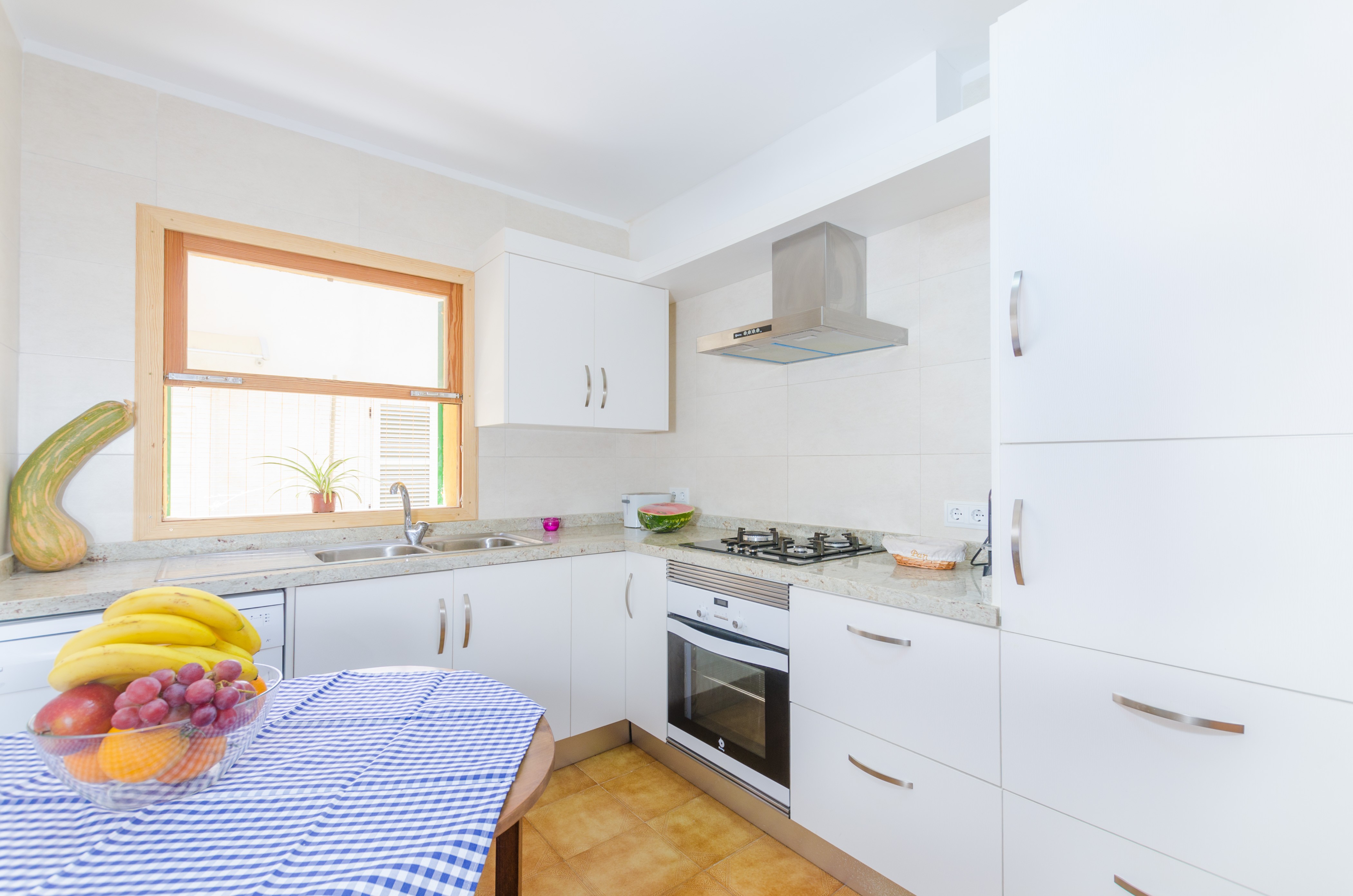 Die Küche verfügt über einen Gasherd, Ofen, sämtlichen Küchenutensilien und viel Stauraum. Zudem gibt es zwei Bäder, eines mit Dusche und das andere mit Badewanne. Sie können zwischen insgesamt drei Doppelzimmer wählen, von denen zwei mit je einem Doppelbett und eines mit zwei Einzelbetten bestückt sind. Alle Zimmer, außer eines der Doppelbettenzimmer, haben je einen Kleiderschrank. Zudem ist eine Waschmaschine, sowie ein Bügelbrett und Bügeleisen vorhanden. Reisen Sie mit Ihrem Baby an, stellen wir Ihnen selbstverständlich ein Kinderbett sowie einen Hochstuhl zur Verfügung.
