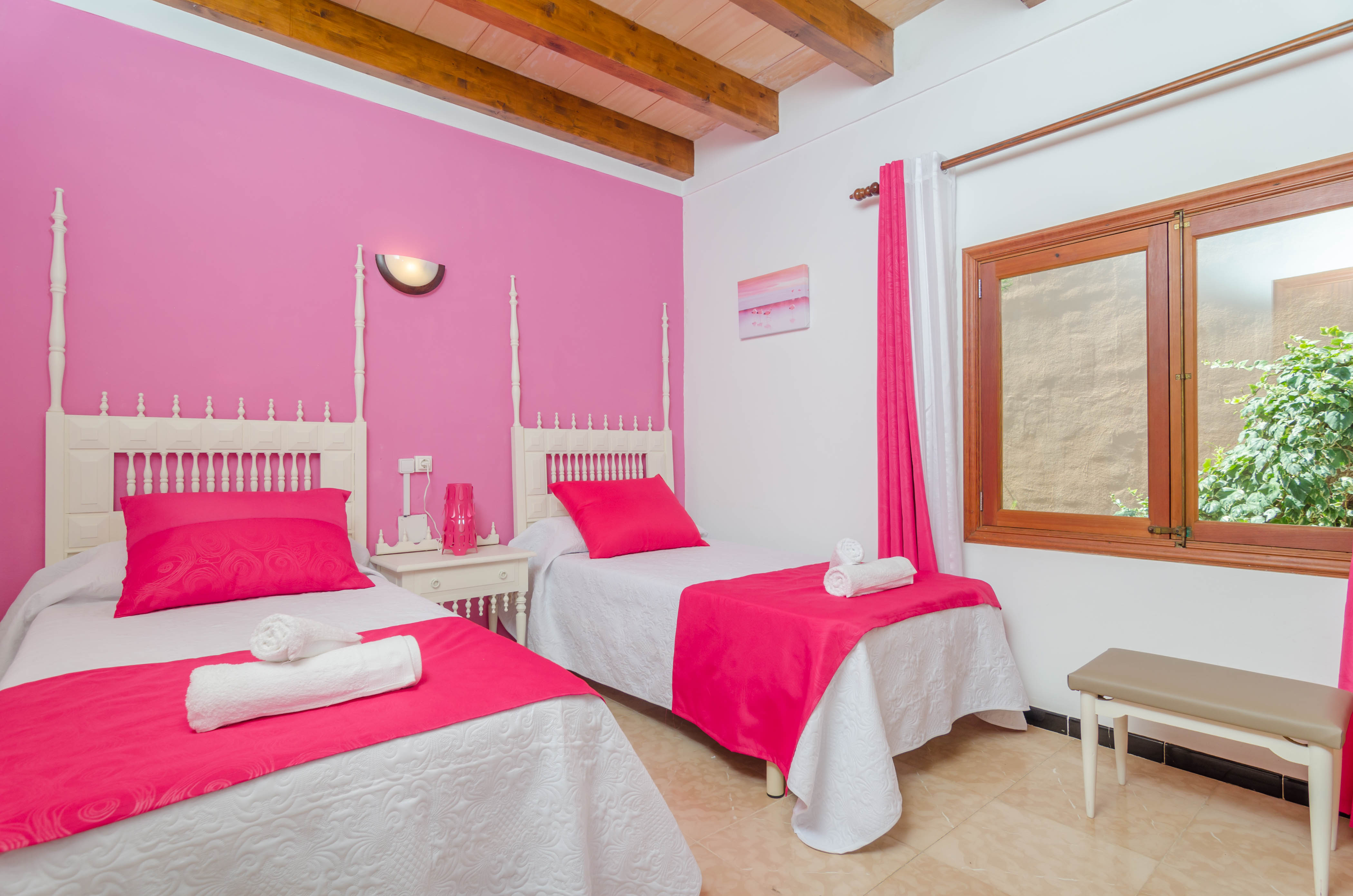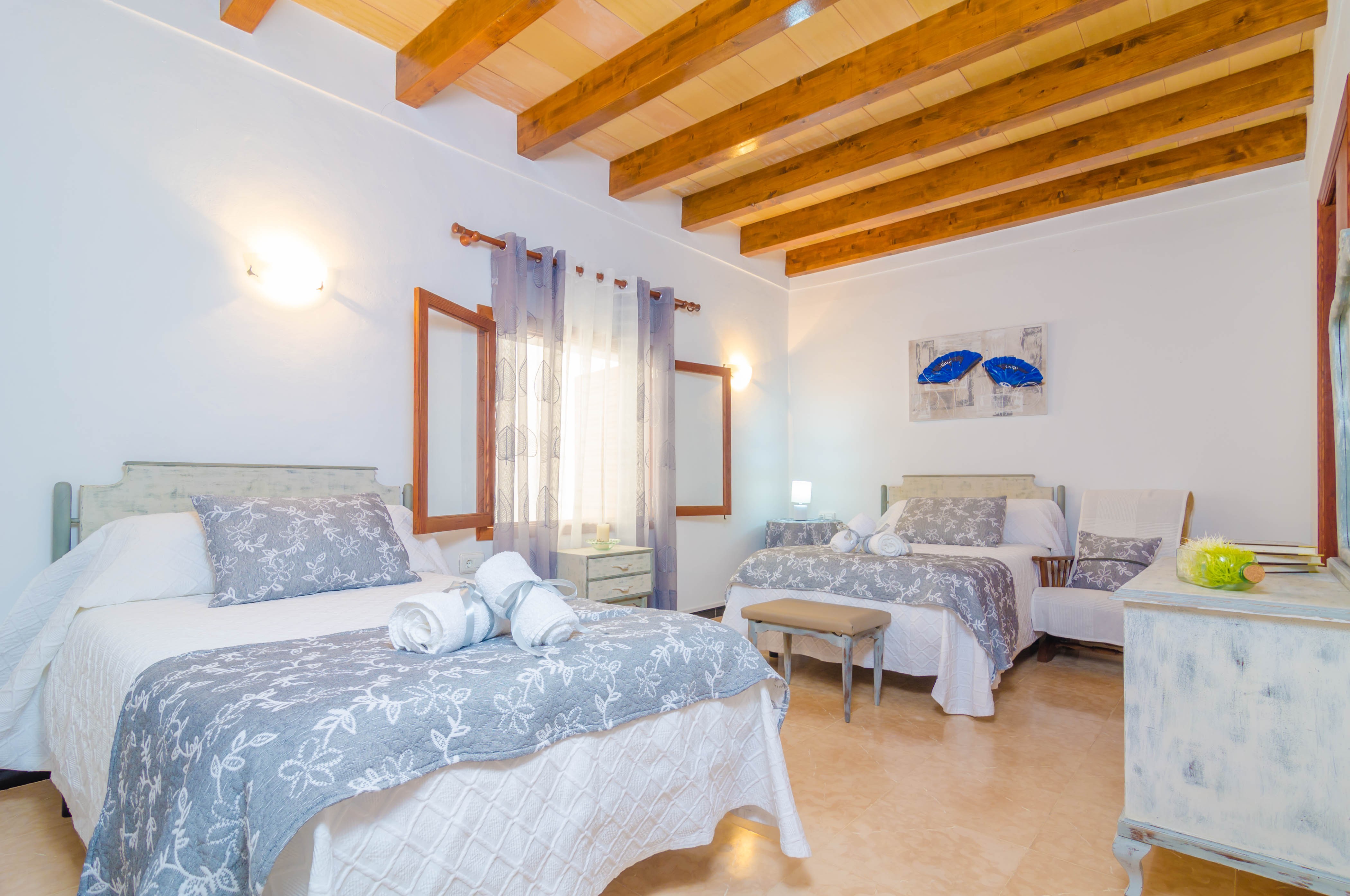 Die Schlafzimmer befinden sich alle im ersten Stock: zwei mit je einem Doppelbett und zwei mit je zwei Einzelbetten. Alle drei Zimmer sind mit Ventilator und Schrank ausgestattet und zwei haben Zugang zu einem Balkon. Wenn Sie mit einem Baby reisen, bereiten wir gerne ein Bettchen und einen Hochstuhl vor. Ein Bad mit Badewanne und Bidet steht dem gesamten Haus zur Verfügung.