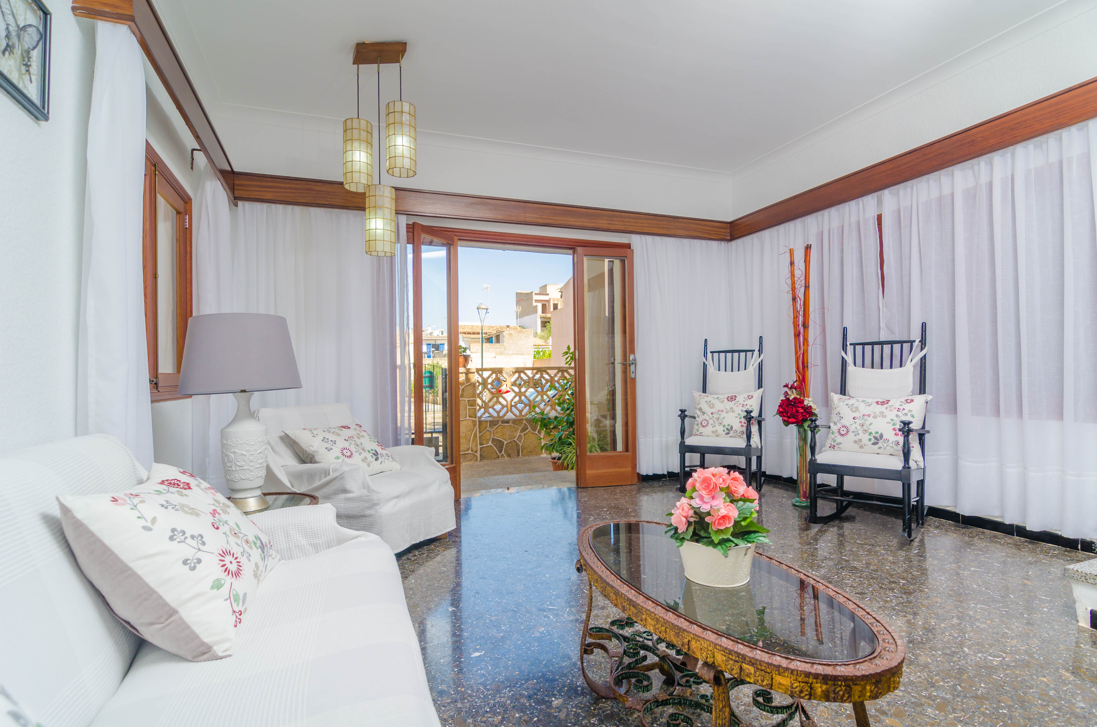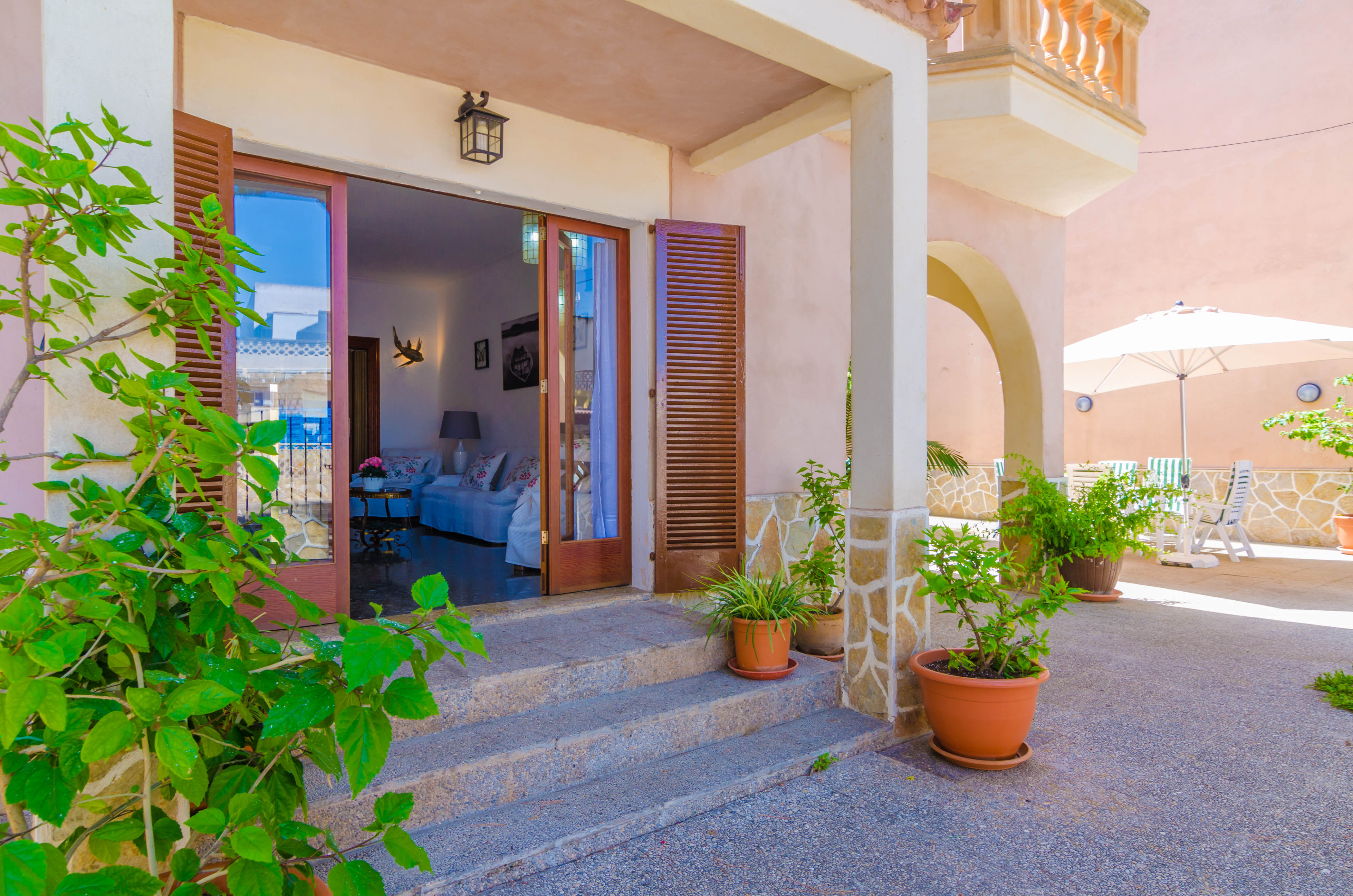 Hier können Sie einen typischen, mallorquinischen Sommer verbringen. Auf der vorderen Terrasse mit Blick auf die Strasse lässt man den Tag mit einem Gläschen Wein ausklingen. Der hintere Patio hat ebenfalls einen Gartentisch mit Stühlen und eignet sich für ein Barbecue. Die Terrassenflächen wurden mit verschiedenen Pflanzen und Blumentöpfen dekoriert, was dem Aussenbereich ein mediterranes Flair verleiht. Ein Badezimmer mit Dusche befindet sich im Patio, neben der Küchentür. Es gibt direkte Nachbarn.
