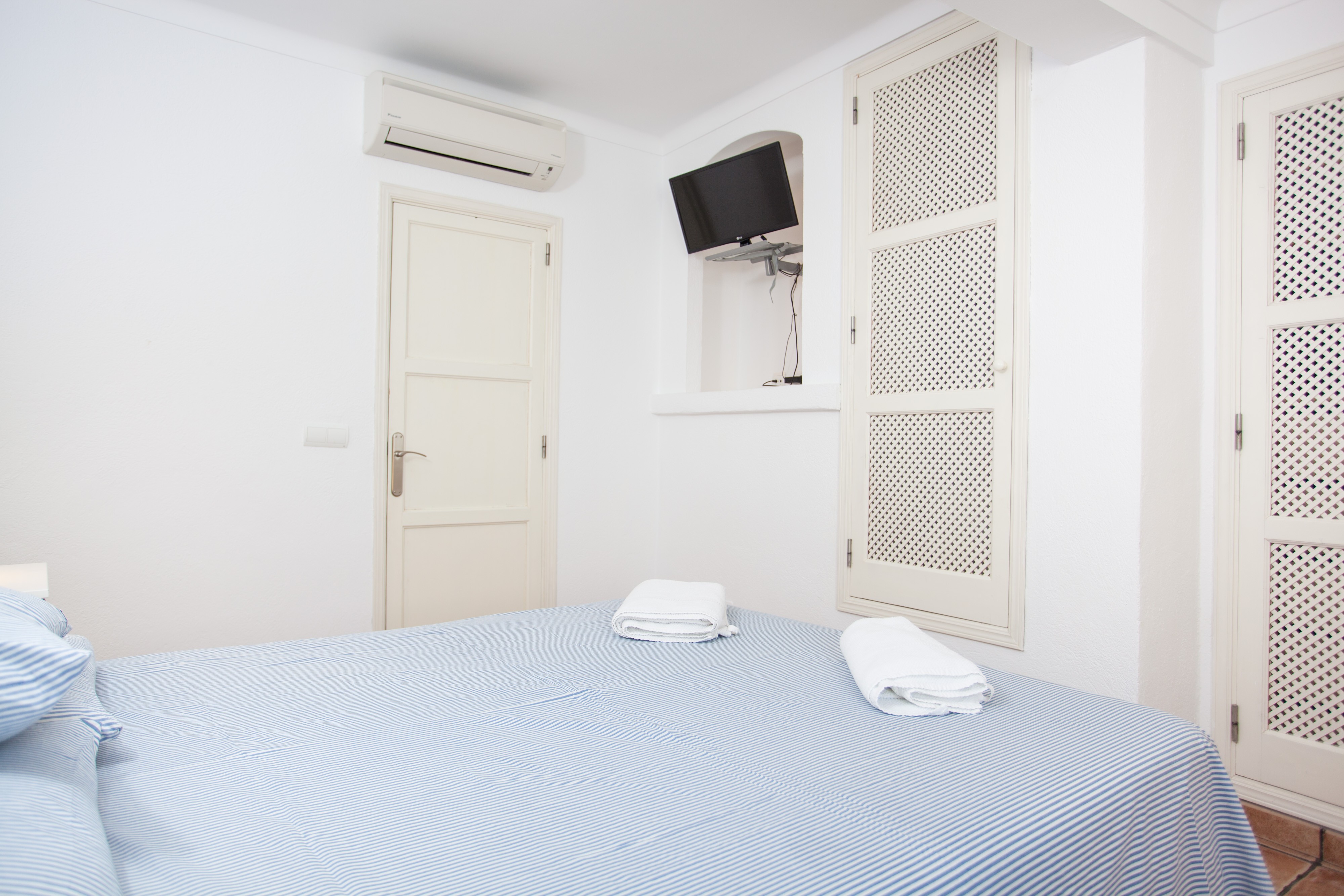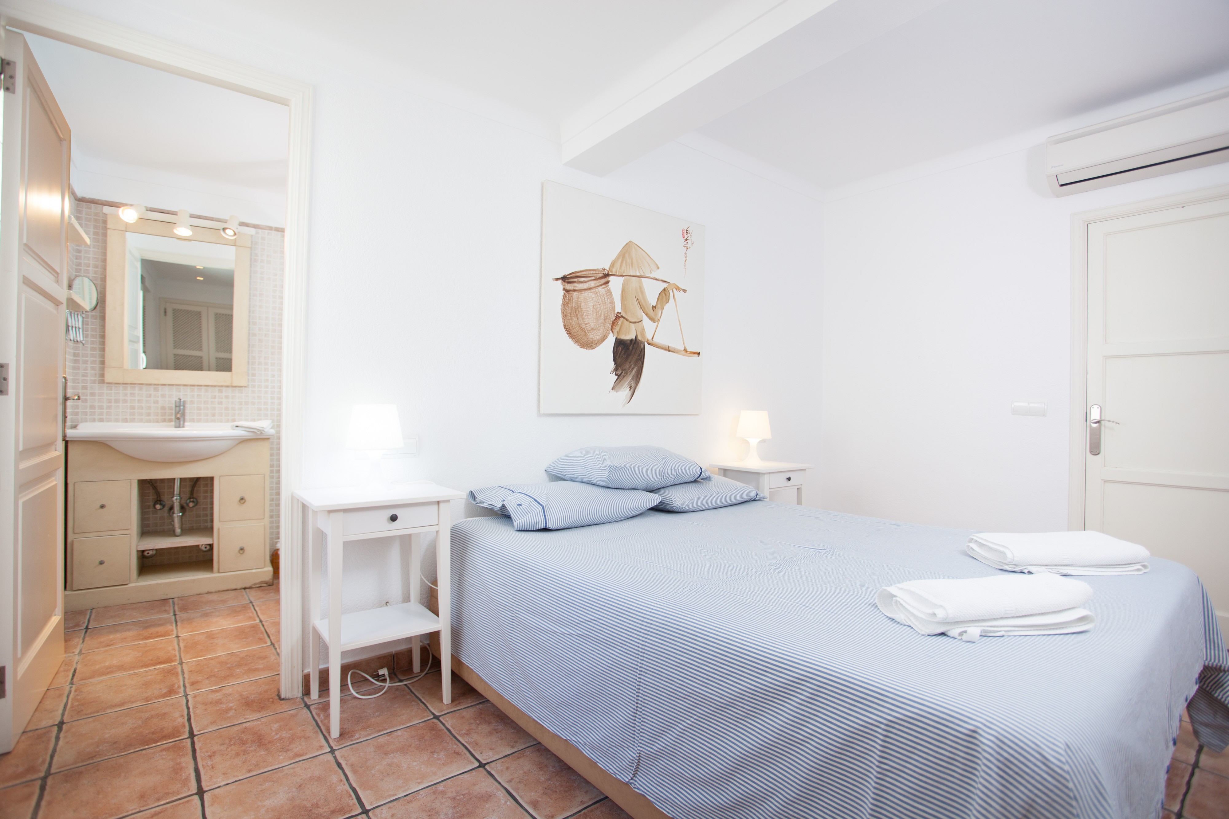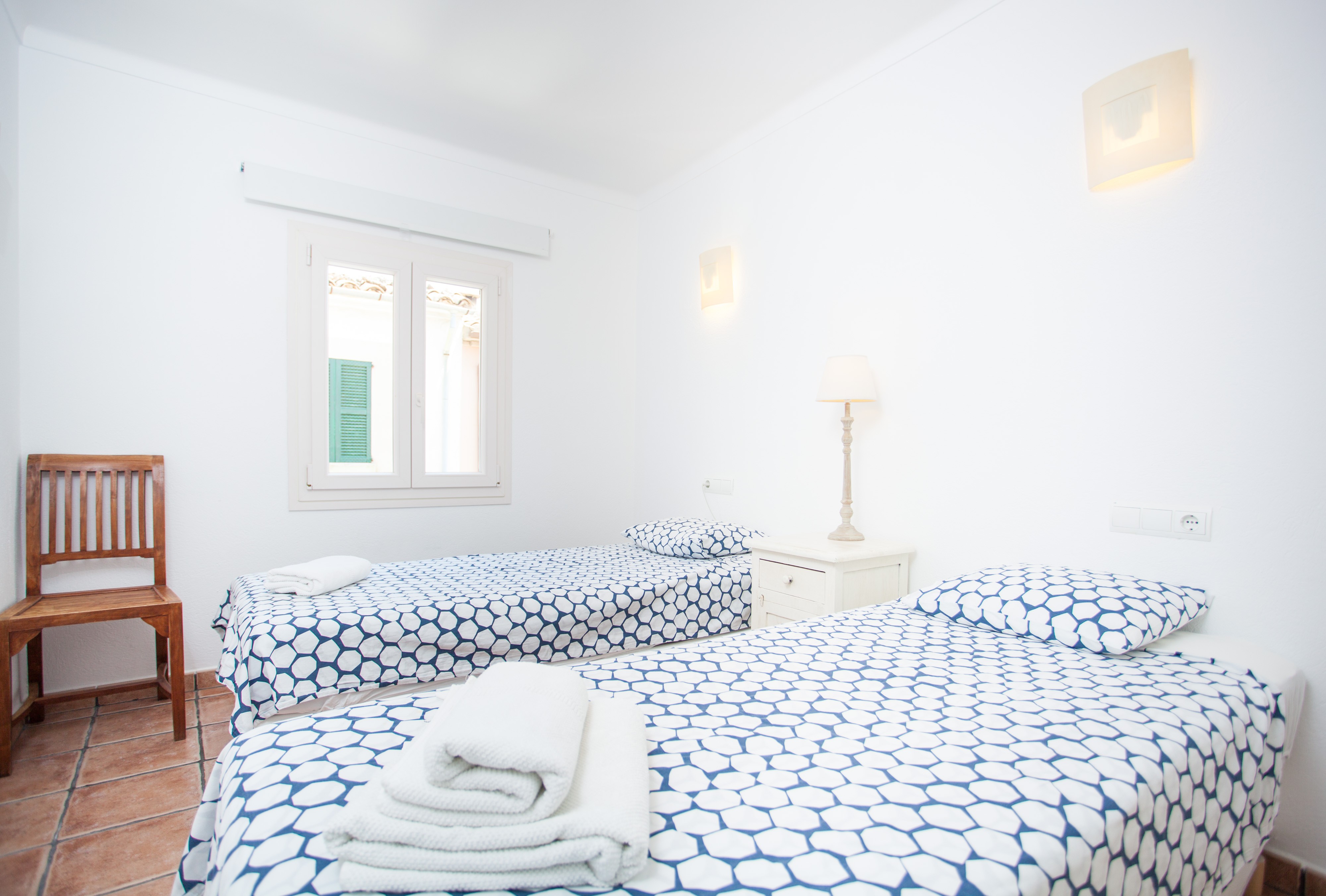 Alle drei Schlafzimmer, davon zwei mit je zwei Einzelbetten und eines mit einem Doppelbett, liegen im ersten Stock. Letzteres hat Zugang zu einem Balkon und ein Duschbad en-suite. Ausserdem kann hier ein Babybett auf Anfrage vorbereitet werden. Alle Schlafräume sind mit Kleiderschrank und Klimaanlage versehen. Ein Bad mit Badewanne steht dem ersten Stock zur Verfügung. Für kältere Herbstnächte stellen wir bis zu sieben elektrische Heizkörper bereit.