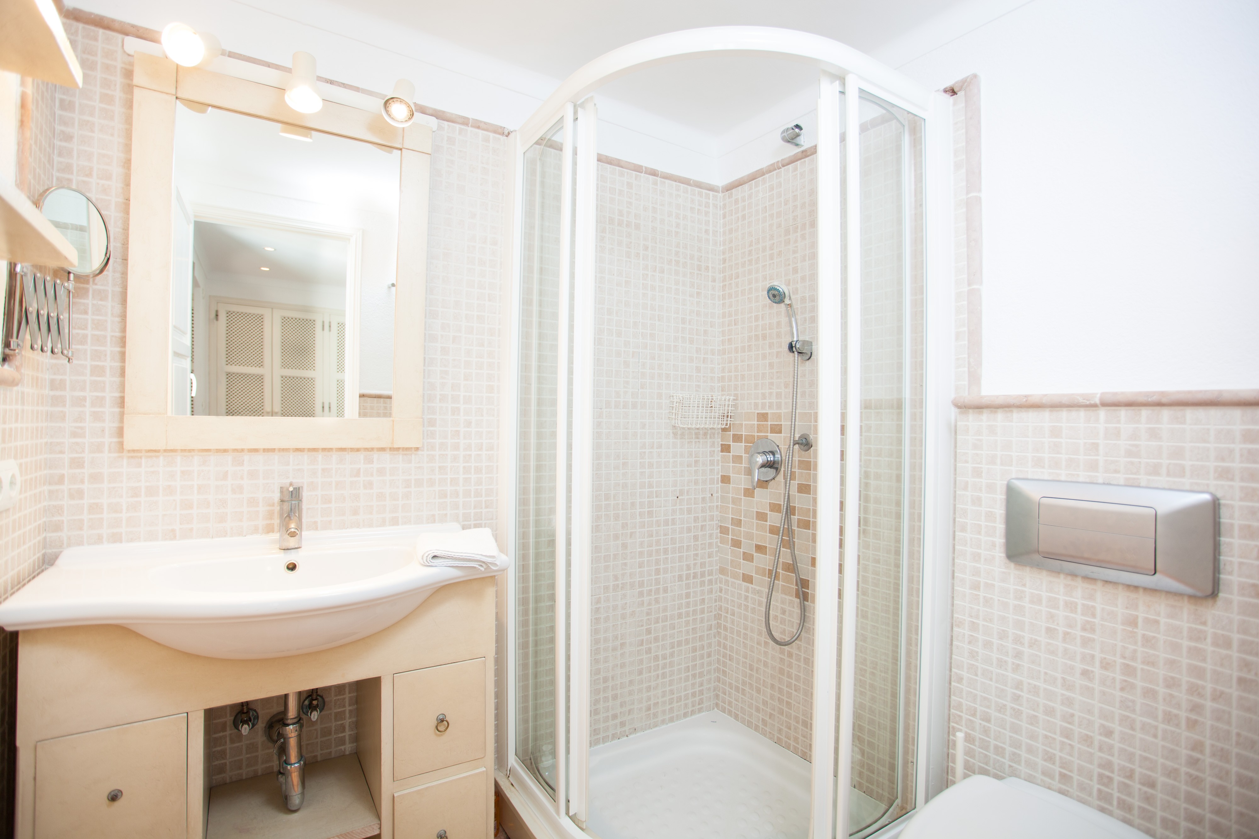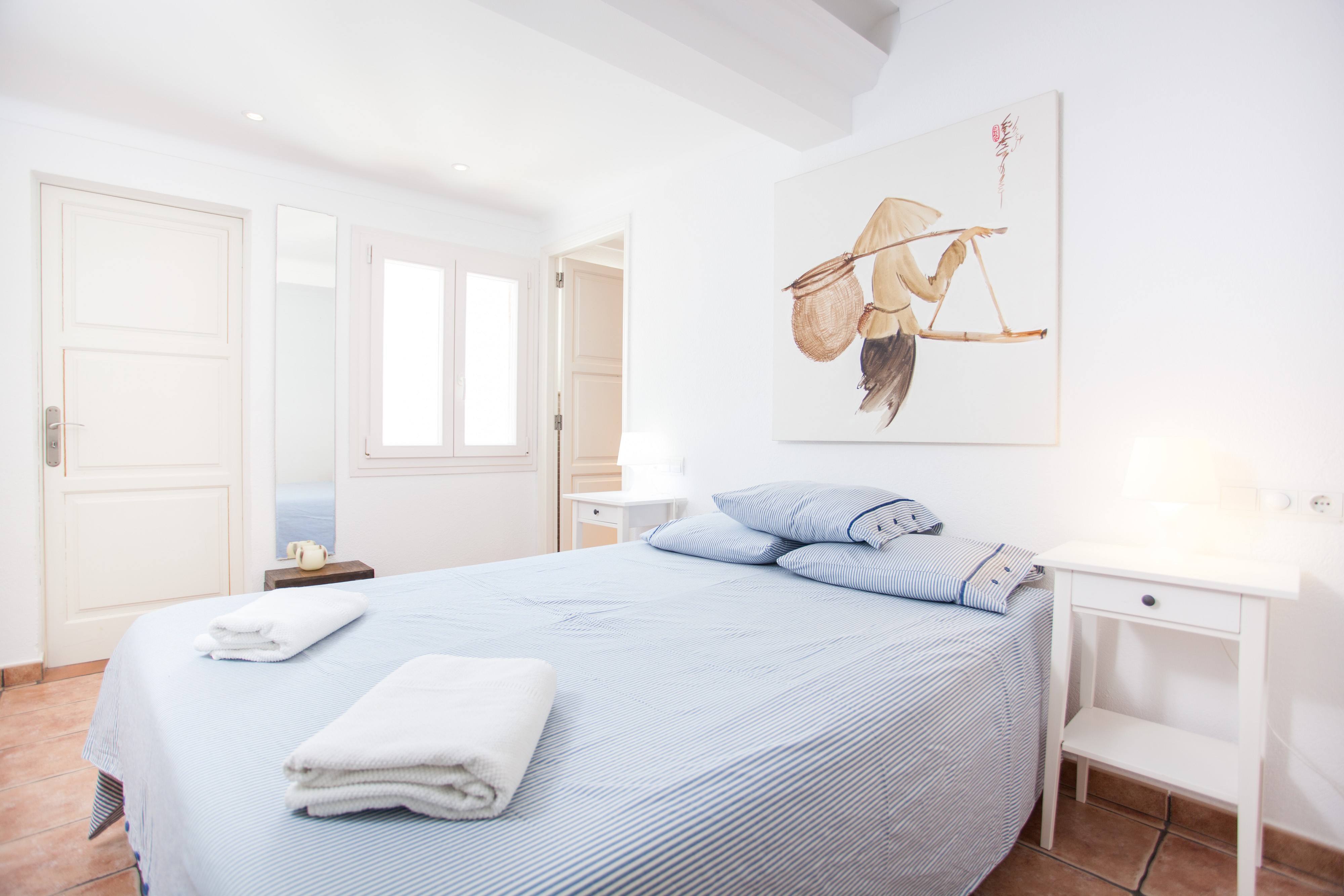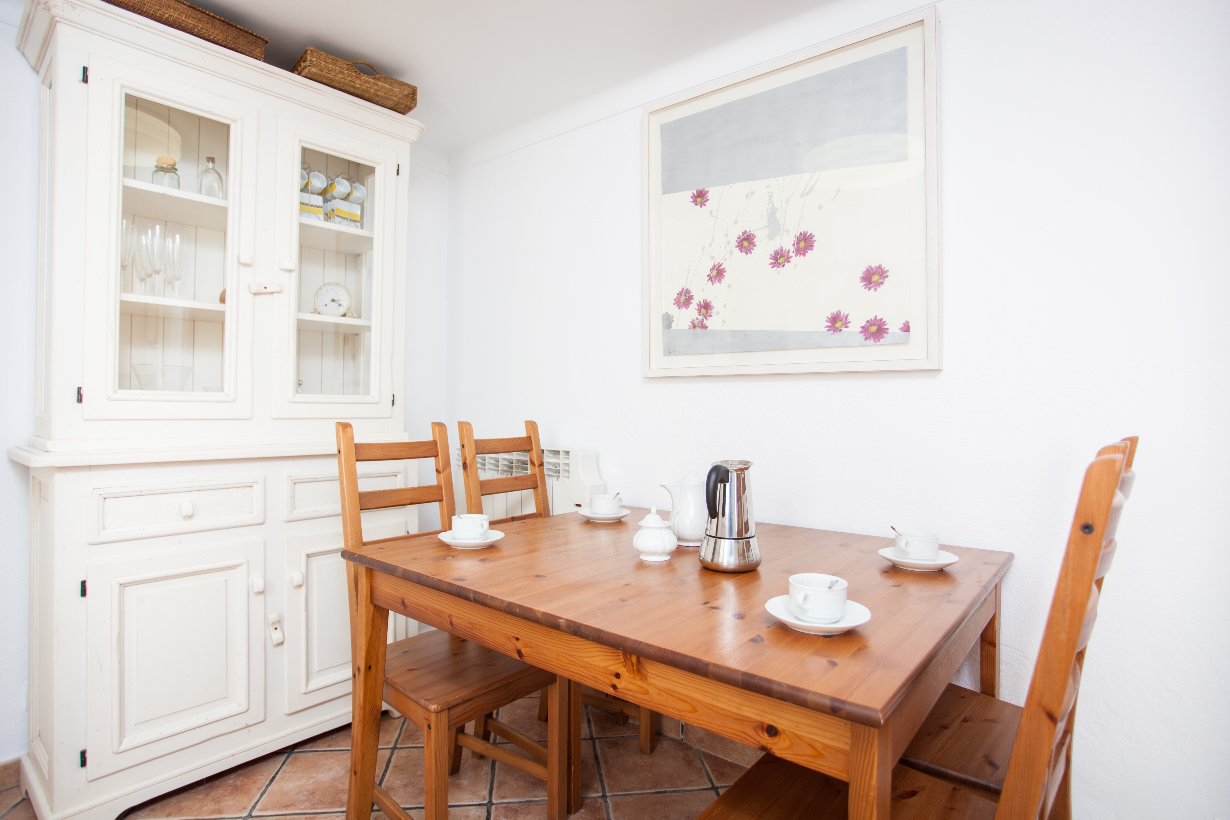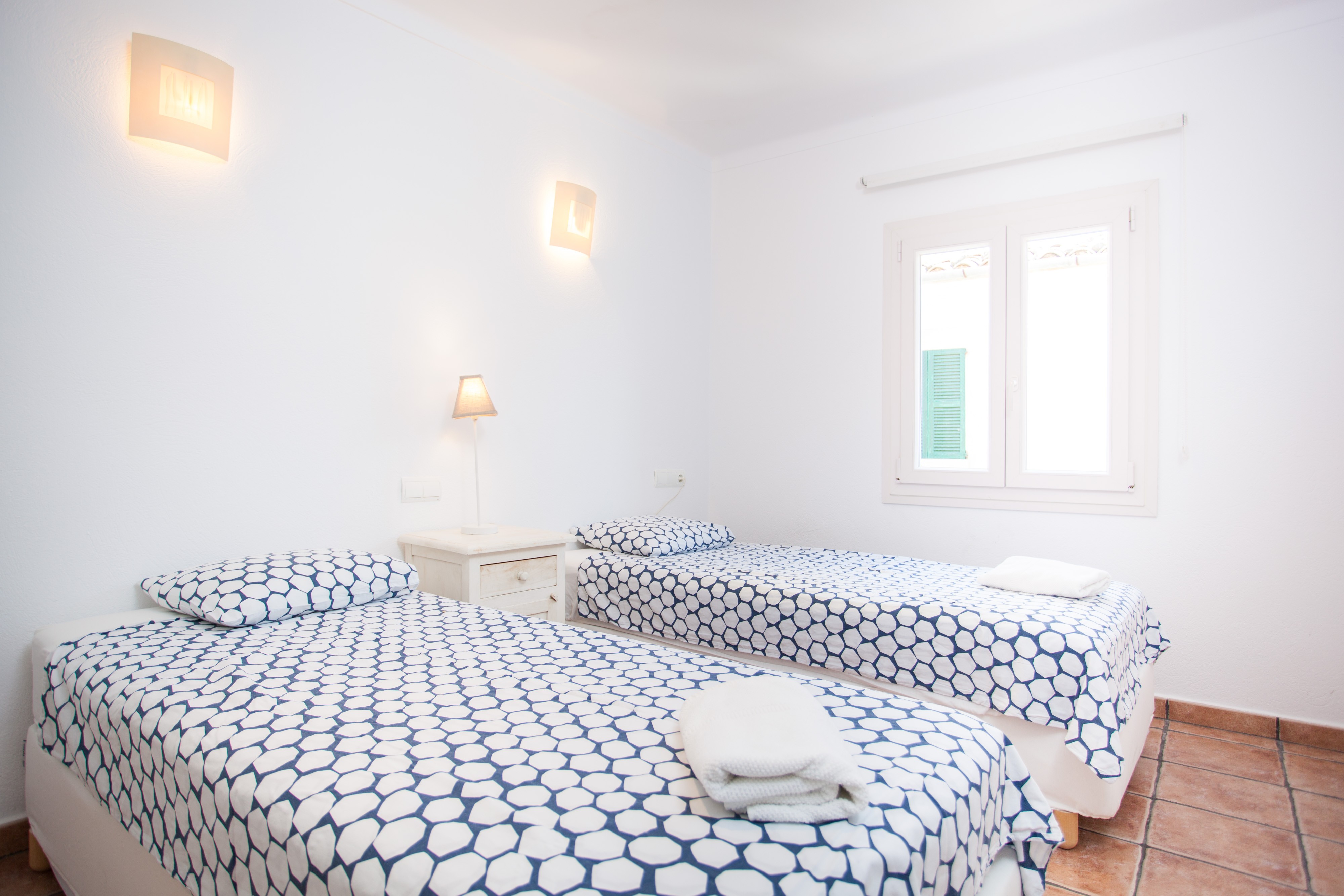 Alle drei Schlafzimmer, davon zwei mit je zwei Einzelbetten und eines mit einem Doppelbett, liegen im ersten Stock. Letzteres hat Zugang zu einem Balkon und ein Duschbad en-suite. Ausserdem kann hier ein Babybett auf Anfrage vorbereitet werden. Alle Schlafräume sind mit Kleiderschrank und Klimaanlage versehen. Ein Bad mit Badewanne steht dem ersten Stock zur Verfügung. Für kältere Herbstnächte stellen wir bis zu sieben elektrische Heizkörper bereit.