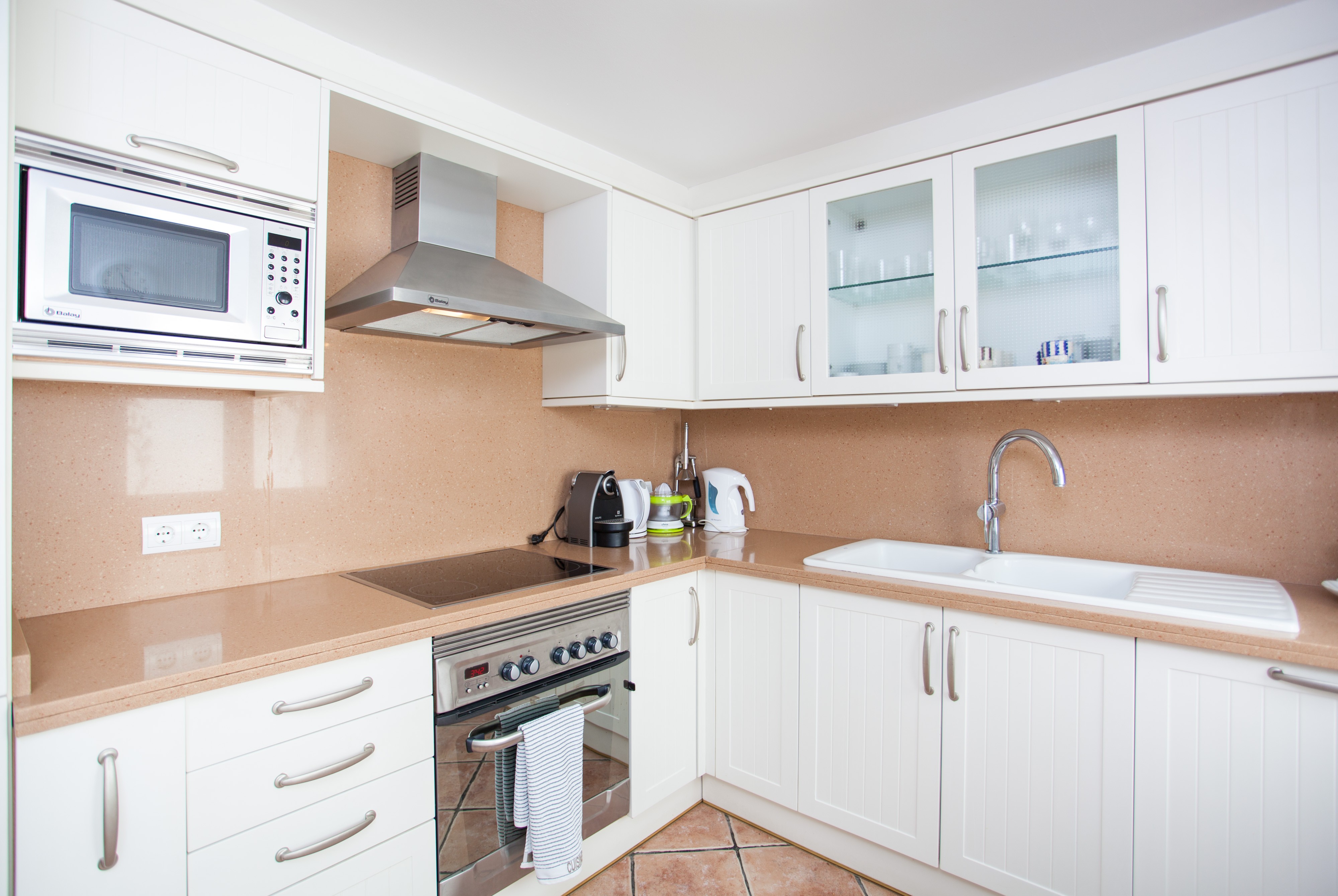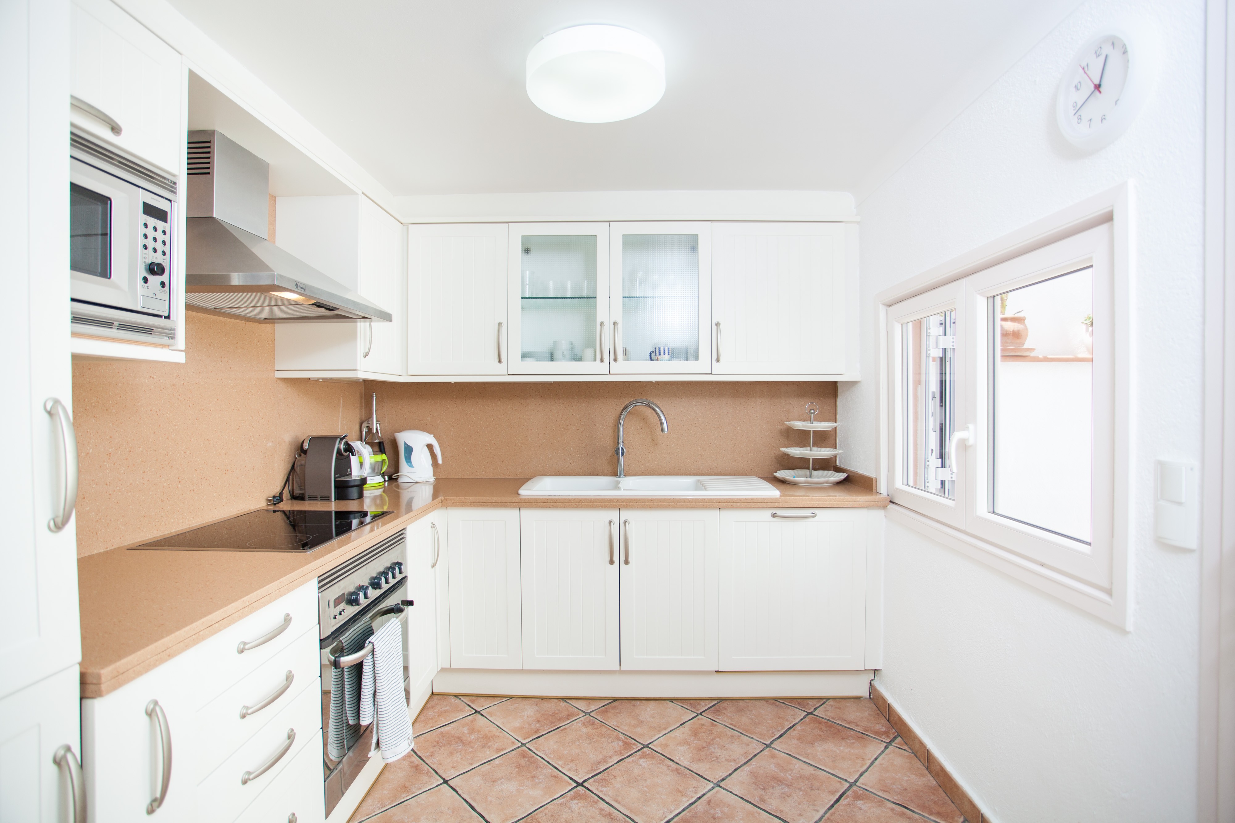 Die Zimmer verteilen sich auf zwei Etagen und 240 m2. Die Inneneinrichtung wurde mit hellen Cremefarben gestaltet und bietet eine gute Ausstattung. Das klimatisierte Wohn-Esszimmer lädt zu einem gemütlichen Nachmittag beim Fernsehen oder gemeinsamen essen ein. Satellitenfernsehen ist vorhanden. Die Küche ist gut ausgestattet und bietet u.a. ein Ceranfeld, einen Hochstuhl, Geschirrspüler und Elektroofen. Eine Waschmaschine, Wäschetrockner, Bügeleisen und Bügelbrett sind in der Waschküche zu finden. Ein Gäste-WC liegt im Erdgeschoss.