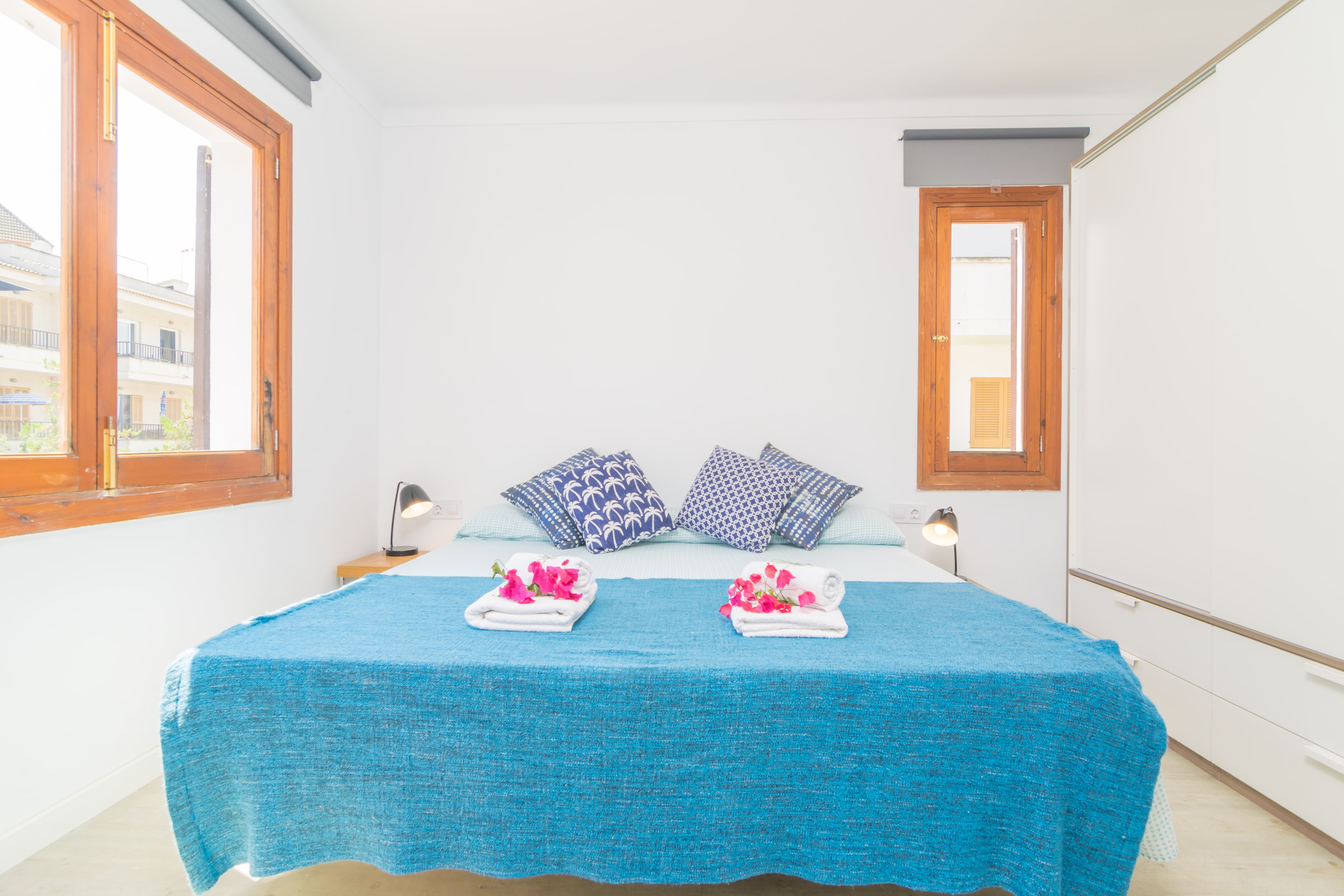 Der feine Sandstrand, Restaurants, Bars, Geschäfte, Supermärkte, die Strandpromenade und die Bushaltestelle sind zu Fuß in wenigen Minuten zu erreichen. Die Bucht von Alcúdia ist aufgrund des wunderschönen Sandstrands bekannt, der sich von Puerto de Alcúdia über Playa de Muro bis nach Can Picafort zieht. Familien mit Kindern fühlen sich hier besonders wohl, da der Strand flach ins Meer abfällt. In der Altstadt von Alcúdia kann man sich sonntags und dienstags auf dem Wochenmarkt umsehen, frische Lebensmittel, Kleidung und ein paar Souvenirs einkaufen oder die alte Wehrmauer besteigen.