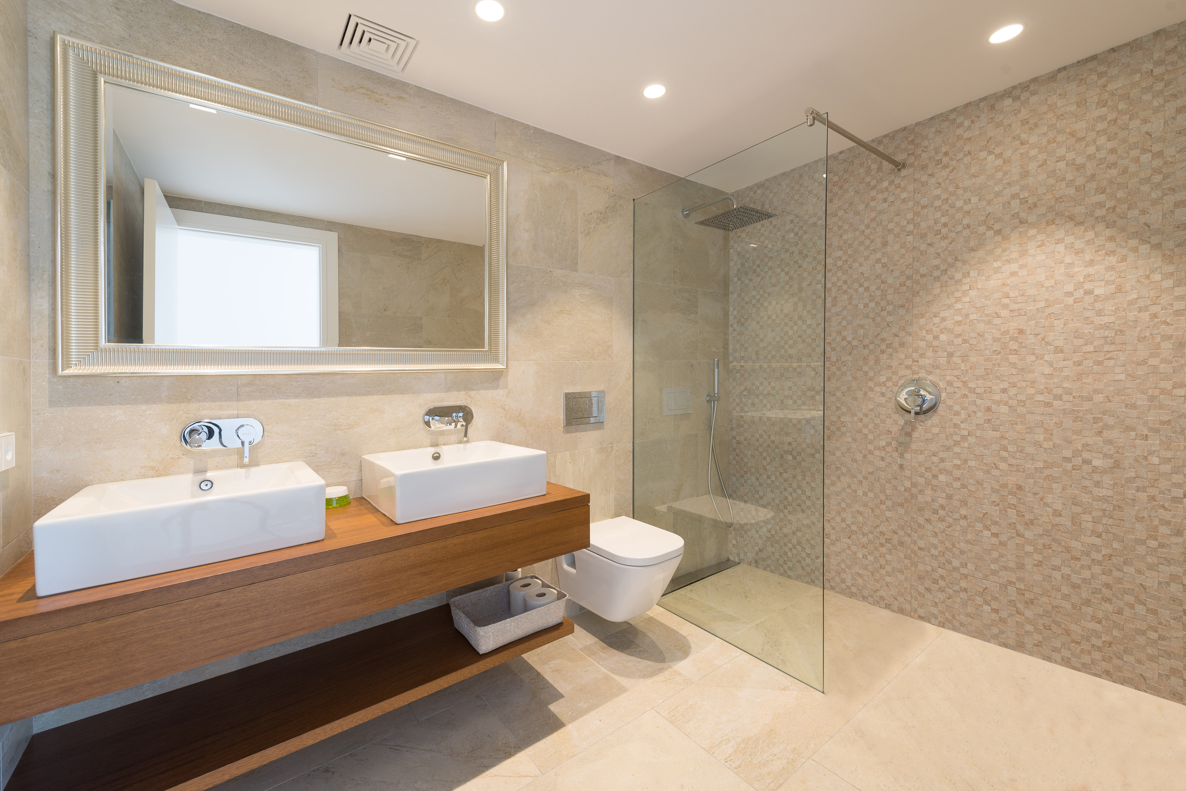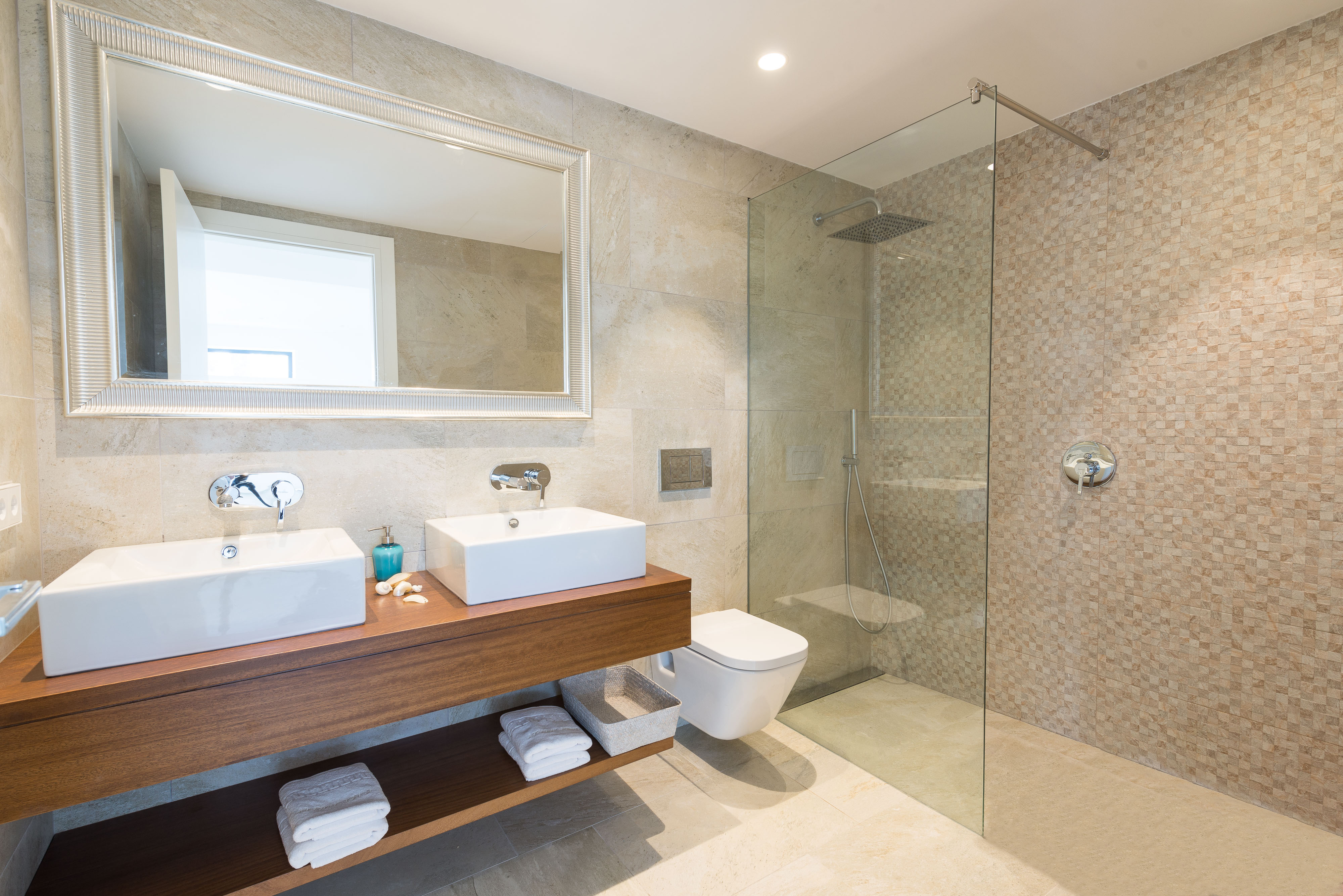 Das Obergeschoss bietet zwei Schlafzimmer mit je zwei Einzelbetten und ein Doppelbettschlafzimmer, alle im minimalistischen Stil gehalten. Zwei Schlafräume haben außerdem Zugang zu je einer unmöblierten Terrasse und eines bietet ein privates Bad mit Dusche und Badewanne. Für unsere kleinen Gäste bereiten wir gerne ein Babybett und einen Hochstuhl vor. Diese einzigartige Haus bietet Klimaanlage sowie Heizung in der ganzen Unterkunft.