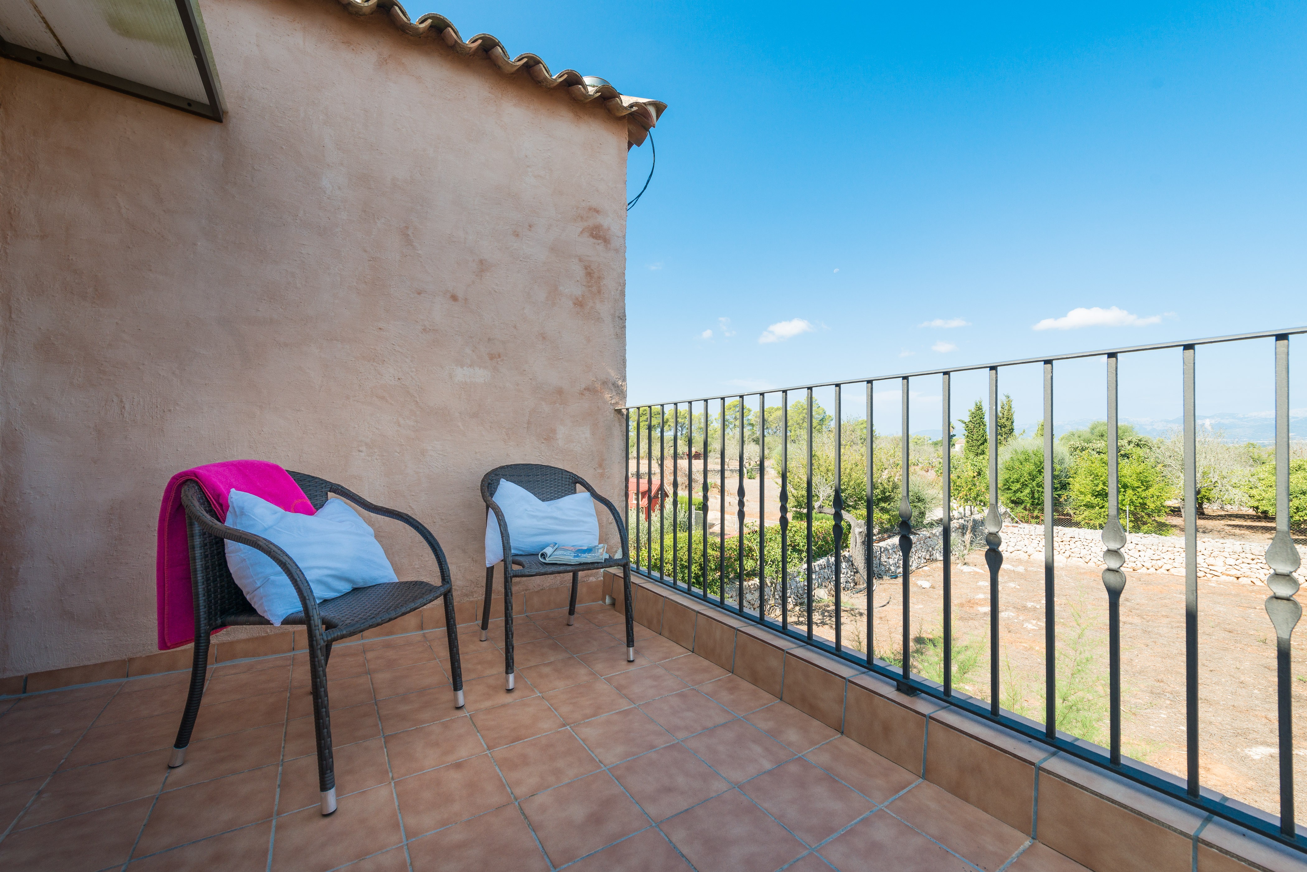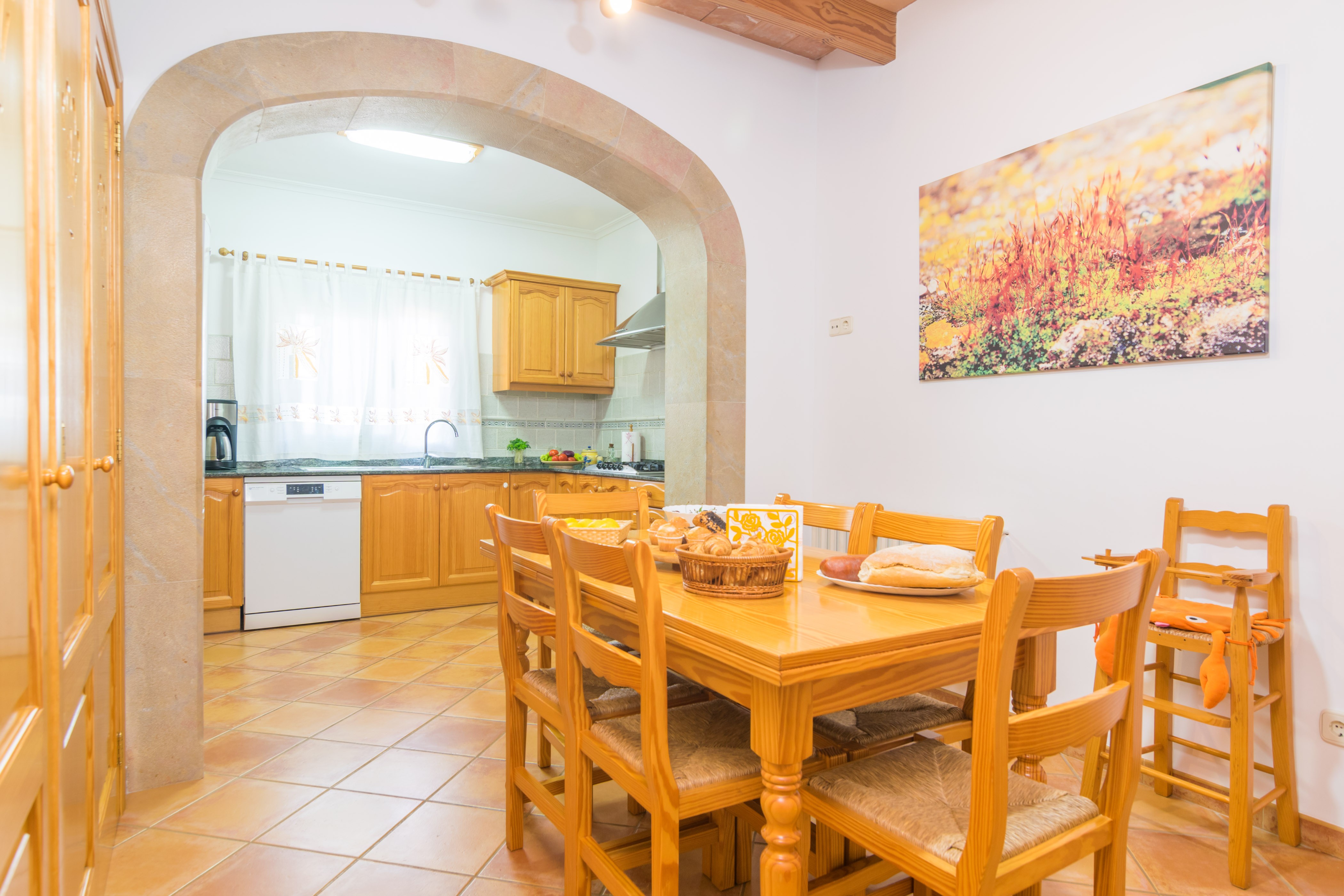 Die Fassade des Hauses ist ganz typisch mallorquinisch mit Bruchsteinen versehen. Eine massive Eichenholztür führt ins überraschend moderne Interieur der Finca. Im Wohn-Essbereich findet man einen Fernseher mit Satellitenempfang, CD-Player und ein paar Brettspiele, damit keine Langeweile aufkommt. Da sich unsere Gäste in dieser Finca selbst versorgen, gehört eine gut ausgestattete Küche einfach dazu. Neben einem Gasherd, Ofen und Mikrowelle gibt es hier eine Kaffeemaschine, Toaster und Orangenpresse, damit man morgens schnell ein leckeres Frühstück zubereiten kann. Hier gibt es einen zweiten Esstisch - so kann man entscheiden ob man lieber in der Küche oder im Wohnzimmer isst. Im Erdgeschoss finden unsere Gäste ein Schlafzimmer mit massivem Doppelbett und Einbauschrank sowie ein modernisiertes Badezimmer mit Dusche. Die Treppe führt in den 1. Stock sind vier weitere Schlafräume mit Kleiderschrank untergebracht; davon zwei mit je 2 Einzelbetten und zwei mit je 1 Doppelbett. Ein Zimmer bietet ein en-suite Duschbad. Im Flur ist 1 Klimaanlage installiert und es sind zusätzlich 6 Ventilatoren vorhanden. Bei Bedarf können bis zu 2 Sets Babybettchen und Hochstuhl vorbereitet werden. Das separate Badezimmer oben bietet unseren Gästen eine Badewanne. Im Winter hat Mallorca einen ganz besonderen Reiz, aber es kann auch kühl werden - in diesem Haus können Sie in den Wintermonaten die Zentralheizung einschalten. Alle Fenster sind mit Mückenschutzgittern ausgestattet. Auch für den Umweltschutz ist gesorgt, da die Finca mit Solarenergie betrieben wird, sie ist aber trotzdem ans Stromnetz angeschlossen, um Stromausfälle zu vermeiden (über den Tag funktioniert der Strom immer über Solar, während der Nacht mit Normalstrom). In der Waschküche finden Sie eine Waschmaschine, ein Bügeleisen mit Bügelbrett und einen Wäschetrockner, der besonders im Winter gute Dienste leistet.