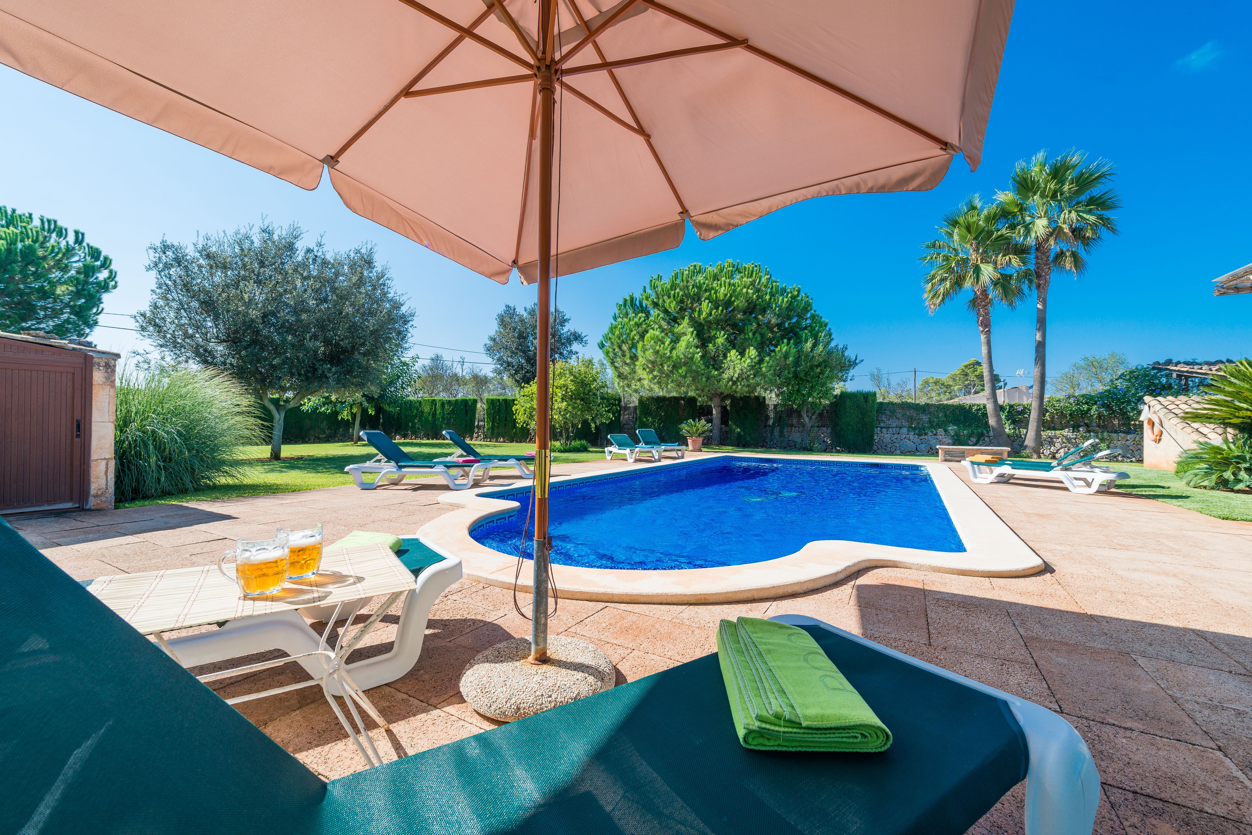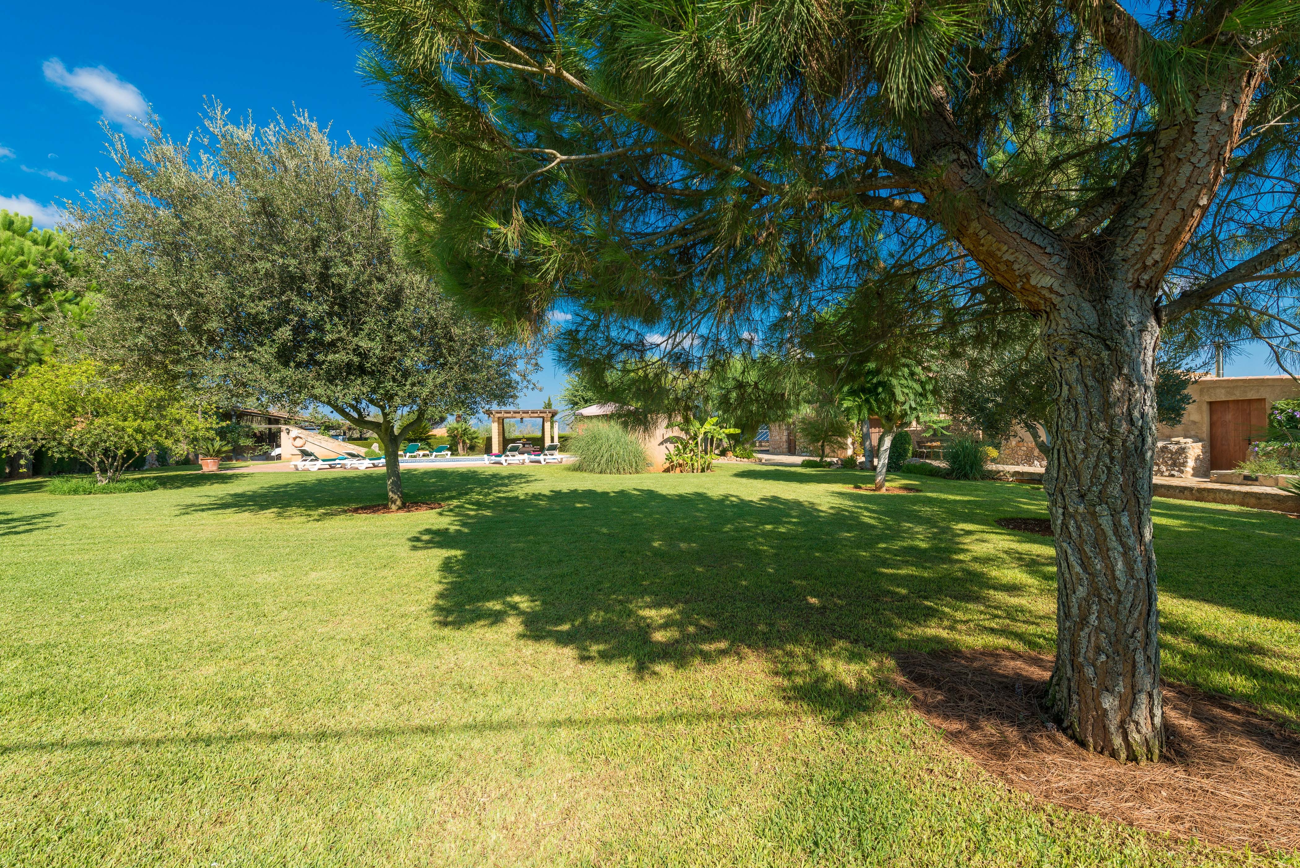 Die Finca liegt in der Inselmitte und bietet einen guten Ausgangspunkt für Ausflüge in ganz Mallorca. Nach einem ereignisreichen Tag freut man sich schon aufs Nachhause-Kommen in die Finca; auf ein erfrischendes Bad im Pool, ein Nickerchen im Garten oder aufs gemeinsame Kochen. Im Garten finden unsere Gäste viel Platz zum Entspannen, Sonnenbaden oder für ein leichtes Mahl auf der Poolterrasse, die mit uriger Sitzbank und Picknicktisch ausgestattet ist. Der 11 x 5 Meter große Salzwasserpool ist zwischen 1 und 2.1 Meter tief - ist also groß genug um echte Bahnen zu ziehen. Insgesamt finden unsere Gäste 10 Sonnenliegen im Garten. Auf der urigen Veranda kann man ein Grillfest feiern oder sich ein paar Stunden mit einem guten Buch zurückziehen. Die vordere Terrasse ist dank der Markise ein schattiges Plätzchen, damit man auch zu Mittag draußen speisen kann. Das Grundstück ist umzäunt und die Finca ist allein stehend.